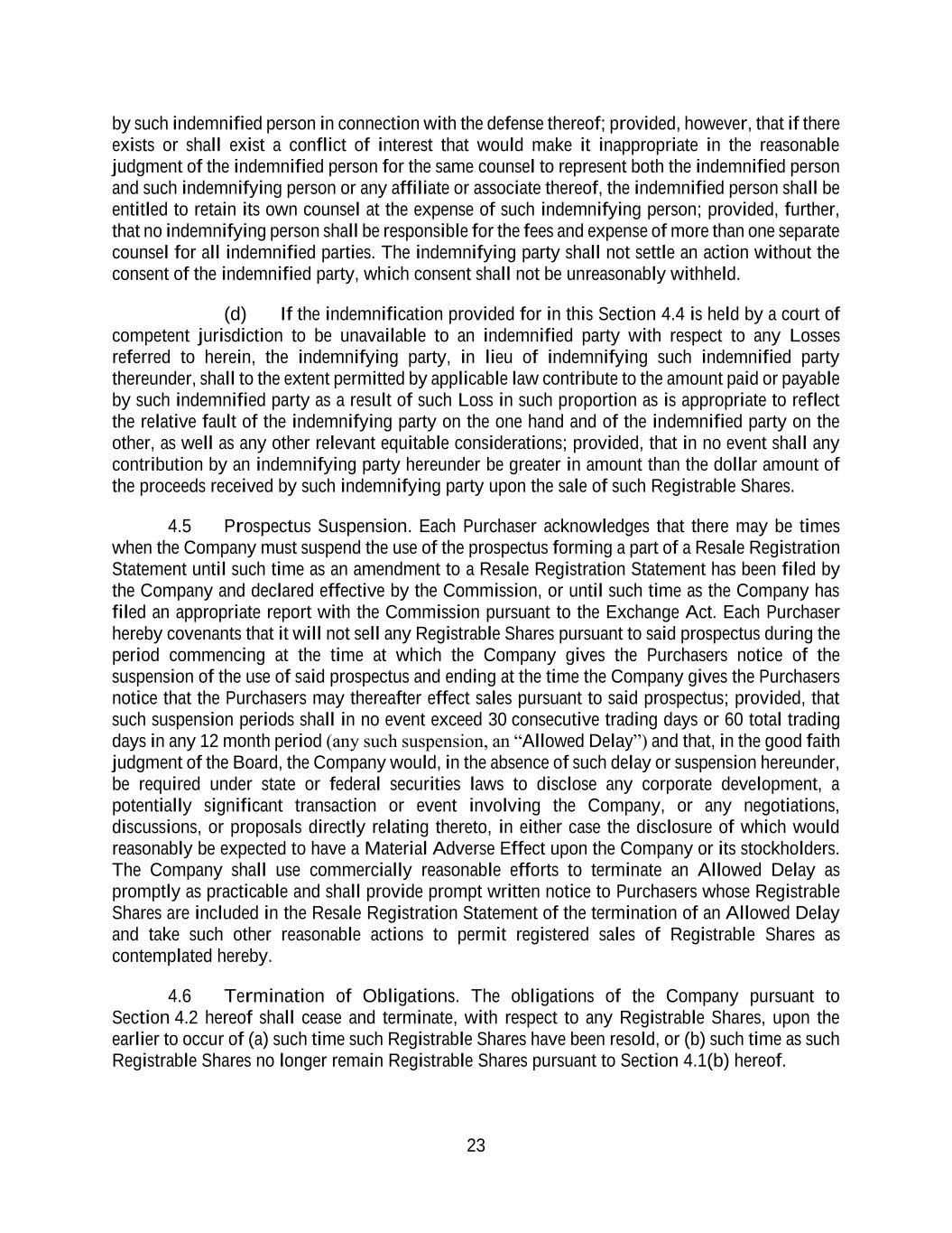 23 by such indemnified person in connection with the defense thereof; provided, however, that if there exists or shall exist a conflict of interest that would make it inappropriate in the reasonable judgment of the indemnified person for the same counsel to represent both the indemnified person and such indemnifying person or any affiliate or associate thereof, the indemnified person shall be entitled to retain its own counsel at the expense of such indemnifying person; provided, further, that no indemnifying person shall be responsible for the fees and expense of more than one separate counsel for all indemnified parties. The indemnifying party shall not settle an action without the consent of the indemnified party, which consent shall not be unreasonably withheld. (d) If the indemnification provided for in this Section 4.4 is held by a court of competent jurisdiction to be unavailable to an indemnified party with respect to any Losses referred to herein, the indemnifying party, in lieu of indemnifying such indemnified party thereunder, shall to the extent permitted by applicable law contribute to the amount paid or payable by such indemnified party as a result of such Loss in such proportion as is appropriate to reflect the relative fault of the indemnifying party on the one hand and of the indemnified party on the other, as well as any other relevant equitable considerations; provided, that in no event shall any contribution by an indemnifying party hereunder be greater in amount than the dollar amount of the proceeds received by such indemnifying party upon the sale of such Registrable Shares. 4.5 Prospectus Suspension. Each Purchaser acknowledges that there may be times when the Company must suspend the use of the prospectus forming a part of a Resale Registration Statement until such time as an amendment to a Resale Registration Statement has been filed by the Company and declared effective by the Commission, or until such time as the Company has filed an appropriate report with the Commission pursuant to the Exchange Act. Each Purchaser hereby covenants that it will not sell any Registrable Shares pursuant to said prospectus during the period commencing at the time at which the Company gives the Purchasers notice of the suspension of the use of said prospectus and ending at the time the Company gives the Purchasers notice that the Purchasers may thereafter effect sales pursuant to said prospectus; provided, that such suspension periods shall in no event exceed 30 consecutive trading days or 60 total trading days in any 12 month period (any such suspension, an “Allowed Delay”) and that, in the good faith judgment of the Board, the Company would, in the absence of such delay or suspension hereunder, be required under state or federal securities laws to disclose any corporate development, a potentially significant transaction or event involving the Company, or any negotiations, discussions, or proposals directly relating thereto, in either case the disclosure of which would reasonably be expected to have a Material Adverse Effect upon the Company or its stockholders. The Company shall use commercially reasonable efforts to terminate an Allowed Delay as promptly as practicable and shall provide prompt written notice to Purchasers whose Registrable Shares are included in the Resale Registration Statement of the termination of an Allowed Delay and take such other reasonable actions to permit registered sales of Registrable Shares as contemplated hereby. 4.6 Termination of Obligations. The obligations of the Company pursuant to Section 4.2 hereof shall cease and terminate, with respect to any Registrable Shares, upon the earlier to occur of (a) such time such Registrable Shares have been resold, or (b) such time as such Registrable Shares no longer remain Registrable Shares pursuant to Section 4.1(b) hereof.