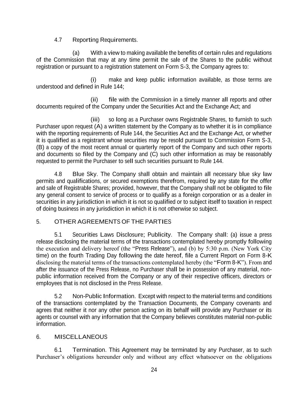 24 4.7 Reporting Requirements. (a) With a view to making available the benefits of certain rules and regulations of the Commission that may at any time permit the sale of the Shares to the public without registration or pursuant to a registration statement on Form S-3, the Company agrees to: (i) make and keep public information available, as those terms are understood and defined in Rule 144; (ii) file with the Commission in a timely manner all reports and other documents required of the Company under the Securities Act and the Exchange Act; and (iii) so long as a Purchaser owns Registrable Shares, to furnish to such Purchaser upon request (A) a written statement by the Company as to whether it is in compliance with the reporting requirements of Rule 144, the Securities Act and the Exchange Act, or whether it is qualified as a registrant whose securities may be resold pursuant to Commission Form S-3, (B) a copy of the most recent annual or quarterly report of the Company and such other reports and documents so filed by the Company and (C) such other information as may be reasonably requested to permit the Purchaser to sell such securities pursuant to Rule 144. 4.8 Blue Sky. The Company shall obtain and maintain all necessary blue sky law permits and qualifications, or secured exemptions therefrom, required by any state for the offer and sale of Registrable Shares; provided, however, that the Company shall not be obligated to file any general consent to service of process or to qualify as a foreign corporation or as a dealer in securities in any jurisdiction in which it is not so qualified or to subject itself to taxation in respect of doing business in any jurisdiction in which it is not otherwise so subject. 5. OTHER AGREEMENTS OF THE PARTIES 5.1 Securities Laws Disclosure; Publicity. The Company shall: (a) issue a press release disclosing the material terms of the transactions contemplated hereby promptly following the execution and delivery hereof (the “Press Release”), and (b) by 5:30 p.m. (New York City time) on the fourth Trading Day following the date hereof, file a Current Report on Form 8-K disclosing the material terms of the transactions contemplated hereby (the “Form 8-K”). From and after the issuance of the Press Release, no Purchaser shall be in possession of any material, non- public information received from the Company or any of their respective officers, directors or employees that is not disclosed in the Press Release. 5.2 Non-Public Information. Except with respect to the material terms and conditions of the transactions contemplated by the Transaction Documents, the Company covenants and agrees that neither it nor any other person acting on its behalf will provide any Purchaser or its agents or counsel with any information that the Company believes constitutes material non-public information. 6. MISCELLANEOUS 6.1 Termination. This Agreement may be terminated by any Purchaser, as to such Purchaser’s obligations hereunder only and without any effect whatsoever on the obligations