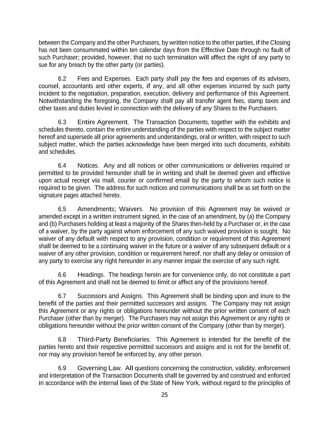 25 between the Company and the other Purchasers, by written notice to the other parties, if the Closing has not been consummated within ten calendar days from the Effective Date through no fault of such Purchaser; provided, however, that no such termination will affect the right of any party to sue for any breach by the other party (or parties). 6.2 Fees and Expenses. Each party shall pay the fees and expenses of its advisers, counsel, accountants and other experts, if any, and all other expenses incurred by such party incident to the negotiation, preparation, execution, delivery and performance of this Agreement. Notwithstanding the foregoing, the Company shall pay all transfer agent fees, stamp taxes and other taxes and duties levied in connection with the delivery of any Shares to the Purchasers. 6.3 Entire Agreement. The Transaction Documents, together with the exhibits and schedules thereto, contain the entire understanding of the parties with respect to the subject matter hereof and supersede all prior agreements and understandings, oral or written, with respect to such subject matter, which the parties acknowledge have been merged into such documents, exhibits and schedules. 6.4 Notices. Any and all notices or other communications or deliveries required or permitted to be provided hereunder shall be in writing and shall be deemed given and effective upon actual receipt via mail, courier or confirmed email by the party to whom such notice is required to be given. The address for such notices and communications shall be as set forth on the signature pages attached hereto. 6.5 Amendments; Waivers. No provision of this Agreement may be waived or amended except in a written instrument signed, in the case of an amendment, by (a) the Company and (b) Purchasers holding at least a majority of the Shares then-held by a Purchaser or, in the case of a waiver, by the party against whom enforcement of any such waived provision is sought. No waiver of any default with respect to any provision, condition or requirement of this Agreement shall be deemed to be a continuing waiver in the future or a waiver of any subsequent default or a waiver of any other provision, condition or requirement hereof, nor shall any delay or omission of any party to exercise any right hereunder in any manner impair the exercise of any such right. 6.6 Headings. The headings herein are for convenience only, do not constitute a part of this Agreement and shall not be deemed to limit or affect any of the provisions hereof. 6.7 Successors and Assigns. This Agreement shall be binding upon and inure to the benefit of the parties and their permitted successors and assigns. The Company may not assign this Agreement or any rights or obligations hereunder without the prior written consent of each Purchaser (other than by merger). The Purchasers may not assign this Agreement or any rights or obligations hereunder without the prior written consent of the Company (other than by merger). 6.8 Third-Party Beneficiaries. This Agreement is intended for the benefit of the parties hereto and their respective permitted successors and assigns and is not for the benefit of, nor may any provision hereof be enforced by, any other person. 6.9 Governing Law. All questions concerning the construction, validity, enforcement and interpretation of the Transaction Documents shall be governed by and construed and enforced in accordance with the internal laws of the State of New York, without regard to the principles of