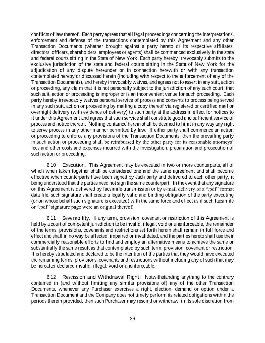 26 conflicts of law thereof. Each party agrees that all legal proceedings concerning the interpretations, enforcement and defense of the transactions contemplated by this Agreement and any other Transaction Documents (whether brought against a party hereto or its respective affiliates, directors, officers, shareholders, employees or agents) shall be commenced exclusively in the state and federal courts sitting in the State of New York. Each party hereby irrevocably submits to the exclusive jurisdiction of the state and federal courts sitting in the State of New York for the adjudication of any dispute hereunder or in connection herewith or with any transaction contemplated hereby or discussed herein (including with respect to the enforcement of any of the Transaction Documents), and hereby irrevocably waives, and agrees not to assert in any suit, action or proceeding, any claim that it is not personally subject to the jurisdiction of any such court, that such suit, action or proceeding is improper or is an inconvenient venue for such proceeding. Each party hereby irrevocably waives personal service of process and consents to process being served in any such suit, action or proceeding by mailing a copy thereof via registered or certified mail or overnight delivery (with evidence of delivery) to such party at the address in effect for notices to it under this Agreement and agrees that such service shall constitute good and sufficient service of process and notice thereof. Nothing contained herein shall be deemed to limit in any way any right to serve process in any other manner permitted by law. If either party shall commence an action or proceeding to enforce any provisions of the Transaction Documents, then the prevailing party in such action or proceeding shall be reimbursed by the other party for its reasonable attorneys’ fees and other costs and expenses incurred with the investigation, preparation and prosecution of such action or proceeding. 6.10 Execution. This Agreement may be executed in two or more counterparts, all of which when taken together shall be considered one and the same agreement and shall become effective when counterparts have been signed by each party and delivered to each other party, it being understood that the parties need not sign the same counterpart. In the event that any signature on this Agreement is delivered by facsimile transmission or by e-mail delivery of a “.pdf” format data file, such signature shall create a legally valid and binding obligation of the party executing (or on whose behalf such signature is executed) with the same force and effect as if such facsimile or “.pdf” signature page were an original thereof. 6.11 Severability. If any term, provision, covenant or restriction of this Agreement is held by a court of competent jurisdiction to be invalid, illegal, void or unenforceable, the remainder of the terms, provisions, covenants and restrictions set forth herein shall remain in full force and effect and shall in no way be affected, impaired or invalidated, and the parties hereto shall use their commercially reasonable efforts to find and employ an alternative means to achieve the same or substantially the same result as that contemplated by such term, provision, covenant or restriction. It is hereby stipulated and declared to be the intention of the parties that they would have executed the remaining terms, provisions, covenants and restrictions without including any of such that may be hereafter declared invalid, illegal, void or unenforceable. 6.12 Rescission and Withdrawal Right. Notwithstanding anything to the contrary contained in (and without limiting any similar provisions of) any of the other Transaction Documents, whenever any Purchaser exercises a right, election, demand or option under a Transaction Document and the Company does not timely perform its related obligations within the periods therein provided, then such Purchaser may rescind or withdraw, in its sole discretion from