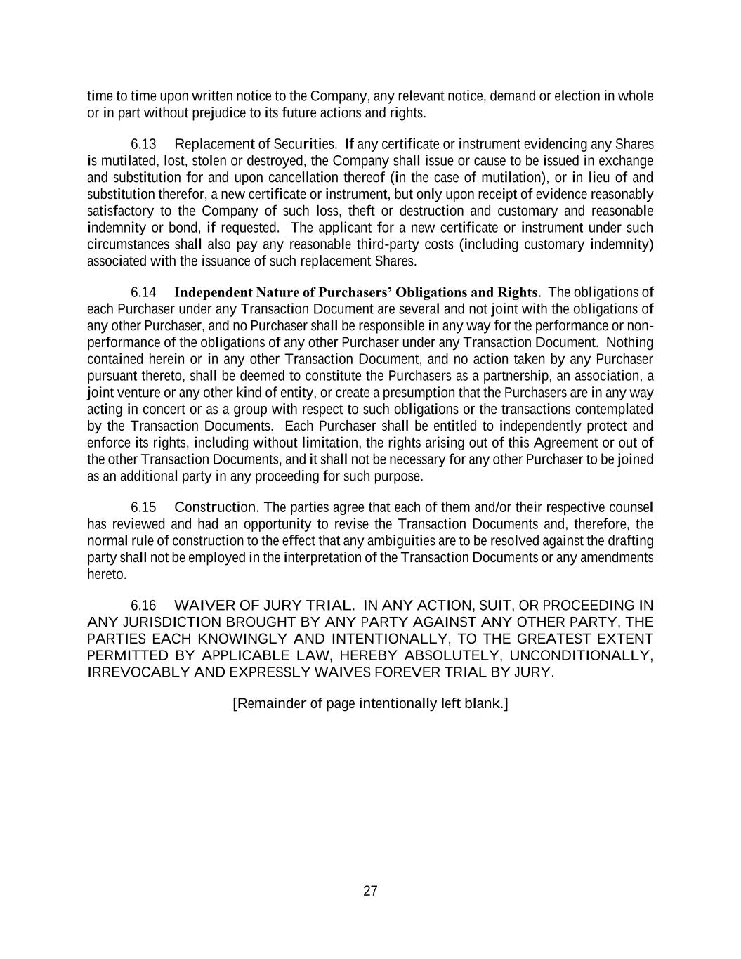 27 time to time upon written notice to the Company, any relevant notice, demand or election in whole or in part without prejudice to its future actions and rights. 6.13 Replacement of Securities. If any certificate or instrument evidencing any Shares is mutilated, lost, stolen or destroyed, the Company shall issue or cause to be issued in exchange and substitution for and upon cancellation thereof (in the case of mutilation), or in lieu of and substitution therefor, a new certificate or instrument, but only upon receipt of evidence reasonably satisfactory to the Company of such loss, theft or destruction and customary and reasonable indemnity or bond, if requested. The applicant for a new certificate or instrument under such circumstances shall also pay any reasonable third-party costs (including customary indemnity) associated with the issuance of such replacement Shares. 6.14 Independent Nature of Purchasers’ Obligations and Rights. The obligations of each Purchaser under any Transaction Document are several and not joint with the obligations of any other Purchaser, and no Purchaser shall be responsible in any way for the performance or non- performance of the obligations of any other Purchaser under any Transaction Document. Nothing contained herein or in any other Transaction Document, and no action taken by any Purchaser pursuant thereto, shall be deemed to constitute the Purchasers as a partnership, an association, a joint venture or any other kind of entity, or create a presumption that the Purchasers are in any way acting in concert or as a group with respect to such obligations or the transactions contemplated by the Transaction Documents. Each Purchaser shall be entitled to independently protect and enforce its rights, including without limitation, the rights arising out of this Agreement or out of the other Transaction Documents, and it shall not be necessary for any other Purchaser to be joined as an additional party in any proceeding for such purpose. 6.15 Construction. The parties agree that each of them and/or their respective counsel has reviewed and had an opportunity to revise the Transaction Documents and, therefore, the normal rule of construction to the effect that any ambiguities are to be resolved against the drafting party shall not be employed in the interpretation of the Transaction Documents or any amendments hereto. 6.16 WAIVER OF JURY TRIAL. IN ANY ACTION, SUIT, OR PROCEEDING IN ANY JURISDICTION BROUGHT BY ANY PARTY AGAINST ANY OTHER PARTY, THE PARTIES EACH KNOWINGLY AND INTENTIONALLY, TO THE GREATEST EXTENT PERMITTED BY APPLICABLE LAW, HEREBY ABSOLUTELY, UNCONDITIONALLY, IRREVOCABLY AND EXPRESSLY WAIVES FOREVER TRIAL BY JURY. [Remainder of page intentionally left blank.]