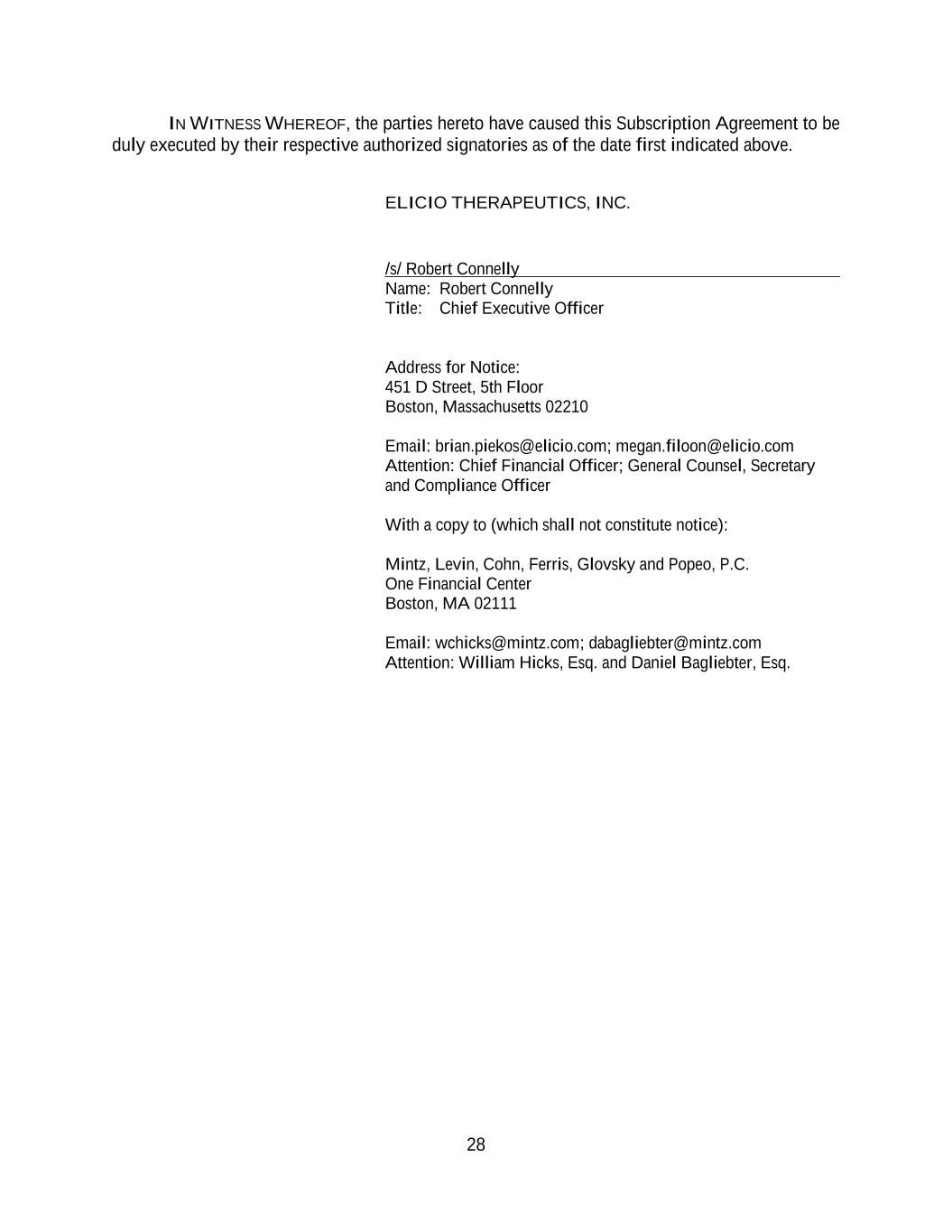 28 IN WITNESS WHEREOF, the parties hereto have caused this Subscription Agreement to be duly executed by their respective authorized signatories as of the date first indicated above. ELICIO THERAPEUTICS, INC. /s/ Robert Connelly Name: Robert Connelly Title: Chief Executive Officer Address for Notice: 451 D Street, 5th Floor Boston, Massachusetts 02210 Email: brian.piekos@elicio.com; megan.filoon@elicio.com Attention: Chief Financial Officer; General Counsel, Secretary and Compliance Officer With a copy to (which shall not constitute notice): Mintz, Levin, Cohn, Ferris, Glovsky and Popeo, P.C. One Financial Center Boston, MA 02111 Email: wchicks@mintz.com; dabagliebter@mintz.com Attention: William Hicks, Esq. and Daniel Bagliebter, Esq.