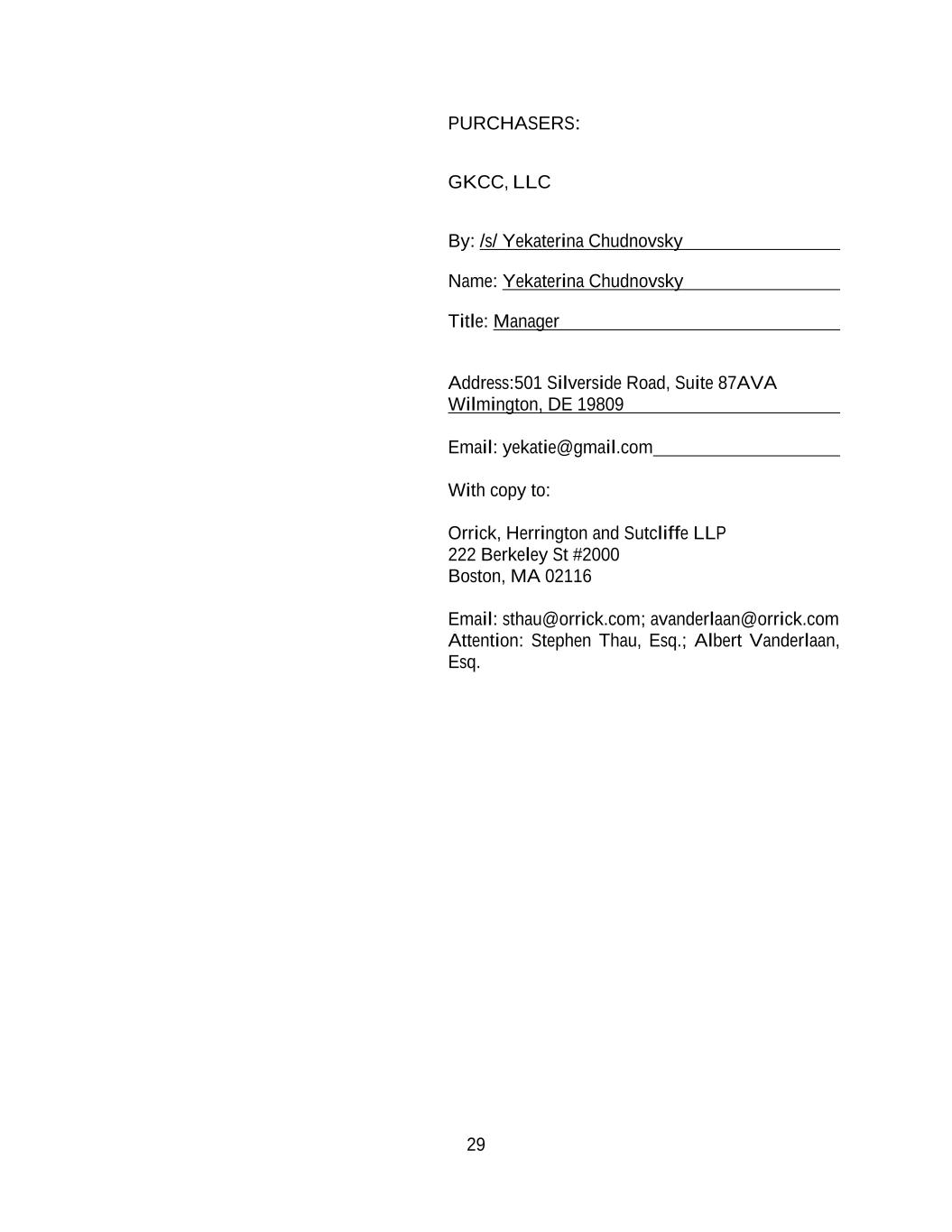 29 PURCHASERS: GKCC, LLC By: /s/ Yekaterina Chudnovsky Name: Yekaterina Chudnovsky Title: Manager Address:501 Silverside Road, Suite 87AVA Wilmington, DE 19809 Email: yekatie@gmail.com With copy to: Orrick, Herrington and Sutcliffe LLP 222 Berkeley St #2000 Boston, MA 02116 Email: sthau@orrick.com; avanderlaan@orrick.com Attention: Stephen Thau, Esq.; Albert Vanderlaan, Esq.