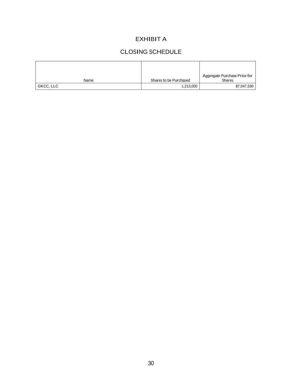30 EXHIBIT A CLOSING SCHEDULE Name Shares to be Purchased Aggregate Purchase Price for Shares GKCC, LLC 1,213,000 $7,047,530