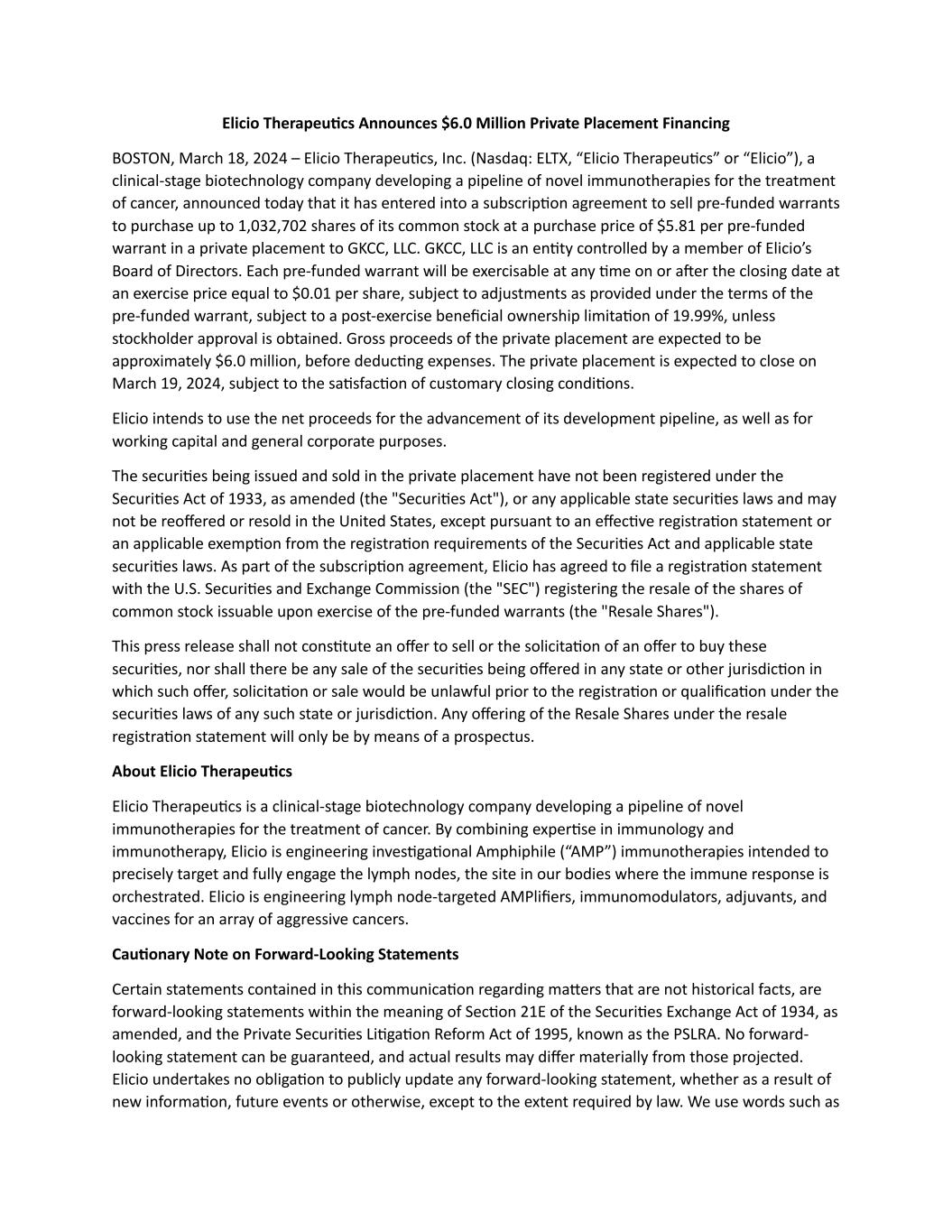 Elicio Therapeu.cs Announces $6.0 Million Private Placement Financing BOSTON, March 18, 2024 – Elicio Therapeu:cs, Inc. (Nasdaq: ELTX, “Elicio Therapeu:cs” or “Elicio”), a clinical-stage biotechnology company developing a pipeline of novel immunotherapies for the treatment of cancer, announced today that it has entered into a subscrip:on agreement to sell pre-funded warrants to purchase up to 1,032,702 shares of its common stock at a purchase price of $5.81 per pre-funded warrant in a private placement to GKCC, LLC. GKCC, LLC is an en:ty controlled by a member of Elicio’s Board of Directors. Each pre-funded warrant will be exercisable at any :me on or a\er the closing date at an exercise price equal to $0.01 per share, subject to adjustments as provided under the terms of the pre-funded warrant, subject to a post-exercise beneficial ownership limita:on of 19.99%, unless stockholder approval is obtained. Gross proceeds of the private placement are expected to be approximately $6.0 million, before deduc:ng expenses. The private placement is expected to close on March 19, 2024, subject to the sa:sfac:on of customary closing condi:ons. Elicio intends to use the net proceeds for the advancement of its development pipeline, as well as for working capital and general corporate purposes. The securi:es being issued and sold in the private placement have not been registered under the Securi:es Act of 1933, as amended (the "Securi:es Act"), or any applicable state securi:es laws and may not be reoffered or resold in the United States, except pursuant to an effec:ve registra:on statement or an applicable exemp:on from the registra:on requirements of the Securi:es Act and applicable state securi:es laws. As part of the subscrip:on agreement, Elicio has agreed to file a registra:on statement with the U.S. Securi:es and Exchange Commission (the "SEC") registering the resale of the shares of common stock issuable upon exercise of the pre-funded warrants (the "Resale Shares"). This press release shall not cons:tute an offer to sell or the solicita:on of an offer to buy these securi:es, nor shall there be any sale of the securi:es being offered in any state or other jurisdic:on in which such offer, solicita:on or sale would be unlawful prior to the registra:on or qualifica:on under the securi:es laws of any such state or jurisdic:on. Any offering of the Resale Shares under the resale registra:on statement will only be by means of a prospectus. About Elicio Therapeu.cs Elicio Therapeu:cs is a clinical-stage biotechnology company developing a pipeline of novel immunotherapies for the treatment of cancer. By combining exper:se in immunology and immunotherapy, Elicio is engineering inves:ga:onal Amphiphile (“AMP”) immunotherapies intended to precisely target and fully engage the lymph nodes, the site in our bodies where the immune response is orchestrated. Elicio is engineering lymph node-targeted AMPlifiers, immunomodulators, adjuvants, and vaccines for an array of aggressive cancers. Cau.onary Note on Forward-Looking Statements Certain statements contained in this communica:on regarding mahers that are not historical facts, are forward-looking statements within the meaning of Sec:on 21E of the Securi:es Exchange Act of 1934, as amended, and the Private Securi:es Li:ga:on Reform Act of 1995, known as the PSLRA. No forward- looking statement can be guaranteed, and actual results may differ materially from those projected. Elicio undertakes no obliga:on to publicly update any forward-looking statement, whether as a result of new informa:on, future events or otherwise, except to the extent required by law. We use words such as