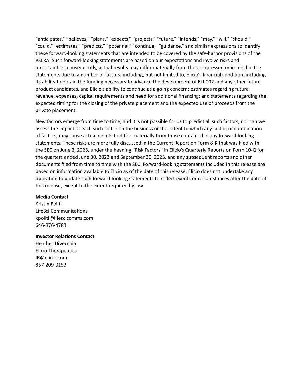 “an:cipates,” “believes,” “plans,” “expects,” “projects,” “future,” “intends,” “may,” “will,” “should,” “could,” “es:mates,” “predicts,” “poten:al,” “con:nue,” “guidance,” and similar expressions to iden:fy these forward-looking statements that are intended to be covered by the safe-harbor provisions of the PSLRA. Such forward-looking statements are based on our expecta:ons and involve risks and uncertain:es; consequently, actual results may differ materially from those expressed or implied in the statements due to a number of factors, including, but not limited to, Elicio’s financial condi:on, including its ability to obtain the funding necessary to advance the development of ELI-002 and any other future product candidates, and Elicio’s ability to con:nue as a going concern; es:mates regarding future revenue, expenses, capital requirements and need for addi:onal financing; and statements regarding the expected :ming for the closing of the private placement and the expected use of proceeds from the private placement. New factors emerge from :me to :me, and it is not possible for us to predict all such factors, nor can we assess the impact of each such factor on the business or the extent to which any factor, or combina:on of factors, may cause actual results to differ materially from those contained in any forward-looking statements. These risks are more fully discussed in the Current Report on Form 8-K that was filed with the SEC on June 2, 2023, under the heading “Risk Factors” in Elicio’s Quarterly Reports on Form 10-Q for the quarters ended June 30, 2023 and September 30, 2023, and any subsequent reports and other documents filed from :me to :me with the SEC. Forward-looking statements included in this release are based on informa:on available to Elicio as of the date of this release. Elicio does not undertake any obliga:on to update such forward-looking statements to reflect events or circumstances a\er the date of this release, except to the extent required by law. Media Contact Kris:n Poli: LifeSci Communica:ons kpoli:@lifescicomms.com 646-876-4783 Investor Rela.ons Contact Heather DiVecchia Elicio Therapeu:cs IR@elicio.com 857-209-0153