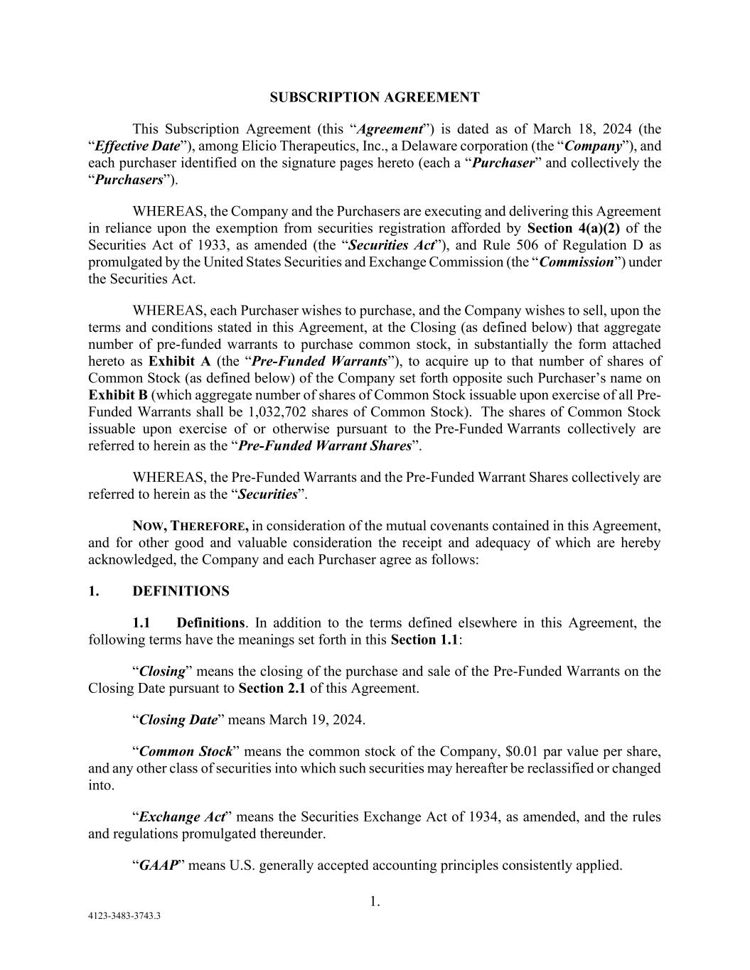 1. 4123-3483-3743.3 SUBSCRIPTION AGREEMENT This Subscription Agreement (this “Agreement”) is dated as of March 18, 2024 (the “Effective Date”), among Elicio Therapeutics, Inc., a Delaware corporation (the “Company”), and each purchaser identified on the signature pages hereto (each a “Purchaser” and collectively the “Purchasers”). WHEREAS, the Company and the Purchasers are executing and delivering this Agreement in reliance upon the exemption from securities registration afforded by Section 4(a)(2) of the Securities Act of 1933, as amended (the “Securities Act”), and Rule 506 of Regulation D as promulgated by the United States Securities and Exchange Commission (the “Commission”) under the Securities Act. WHEREAS, each Purchaser wishes to purchase, and the Company wishes to sell, upon the terms and conditions stated in this Agreement, at the Closing (as defined below) that aggregate number of pre-funded warrants to purchase common stock, in substantially the form attached hereto as Exhibit A (the “Pre-Funded Warrants”), to acquire up to that number of shares of Common Stock (as defined below) of the Company set forth opposite such Purchaser’s name on Exhibit B (which aggregate number of shares of Common Stock issuable upon exercise of all Pre- Funded Warrants shall be 1,032,702 shares of Common Stock). The shares of Common Stock issuable upon exercise of or otherwise pursuant to the Pre-Funded Warrants collectively are referred to herein as the “Pre-Funded Warrant Shares”. WHEREAS, the Pre-Funded Warrants and the Pre-Funded Warrant Shares collectively are referred to herein as the “Securities”. NOW, THEREFORE, in consideration of the mutual covenants contained in this Agreement, and for other good and valuable consideration the receipt and adequacy of which are hereby acknowledged, the Company and each Purchaser agree as follows: 1. DEFINITIONS 1.1 Definitions. In addition to the terms defined elsewhere in this Agreement, the following terms have the meanings set forth in this Section 1.1: “Closing” means the closing of the purchase and sale of the Pre-Funded Warrants on the Closing Date pursuant to Section 2.1 of this Agreement. “Closing Date” means March 19, 2024. “Common Stock” means the common stock of the Company, $0.01 par value per share, and any other class of securities into which such securities may hereafter be reclassified or changed into. “Exchange Act” means the Securities Exchange Act of 1934, as amended, and the rules and regulations promulgated thereunder. “GAAP” means U.S. generally accepted accounting principles consistently applied.