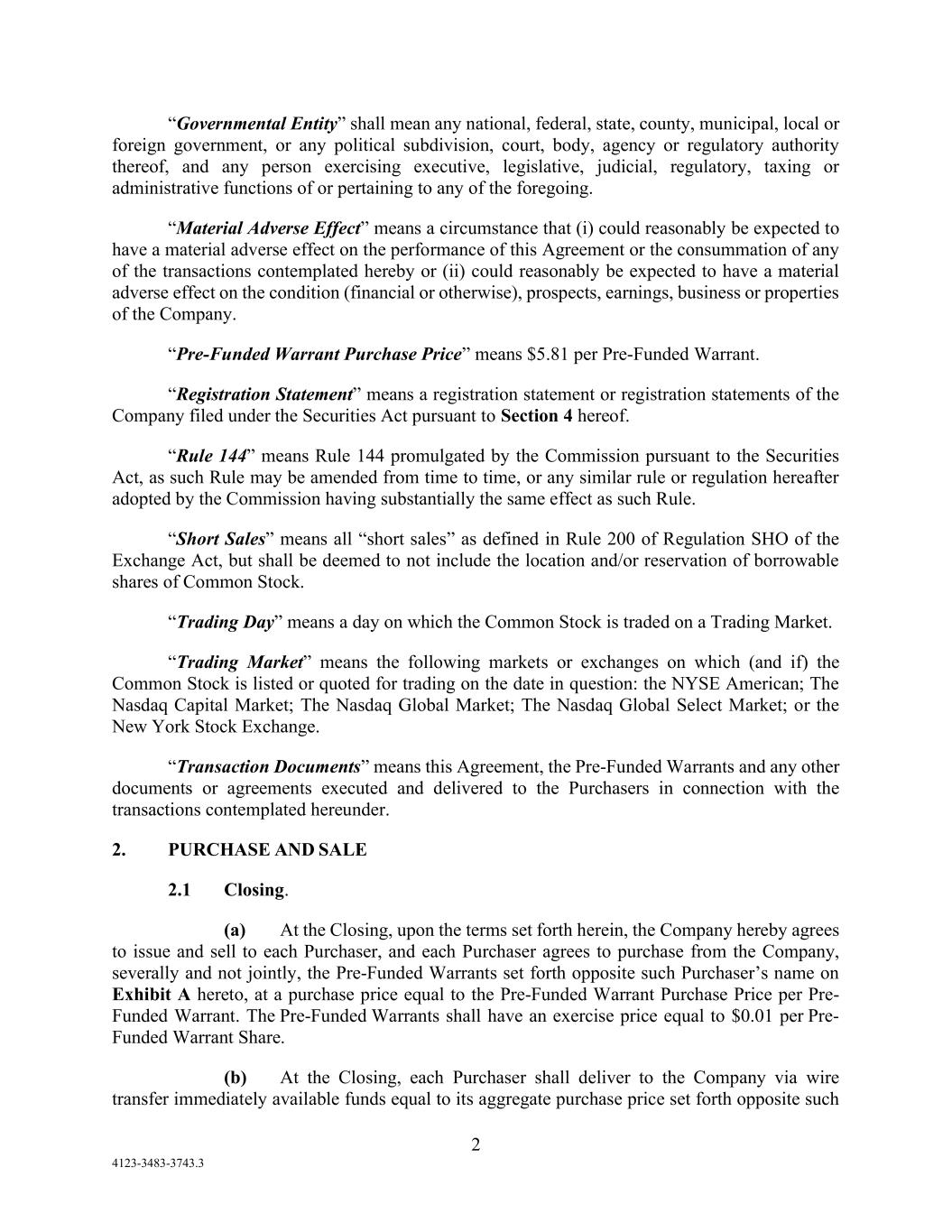 2 4123-3483-3743.3 “Governmental Entity” shall mean any national, federal, state, county, municipal, local or foreign government, or any political subdivision, court, body, agency or regulatory authority thereof, and any person exercising executive, legislative, judicial, regulatory, taxing or administrative functions of or pertaining to any of the foregoing. “Material Adverse Effect” means a circumstance that (i) could reasonably be expected to have a material adverse effect on the performance of this Agreement or the consummation of any of the transactions contemplated hereby or (ii) could reasonably be expected to have a material adverse effect on the condition (financial or otherwise), prospects, earnings, business or properties of the Company. “Pre-Funded Warrant Purchase Price” means $5.81 per Pre-Funded Warrant. “Registration Statement” means a registration statement or registration statements of the Company filed under the Securities Act pursuant to Section 4 hereof. “Rule 144” means Rule 144 promulgated by the Commission pursuant to the Securities Act, as such Rule may be amended from time to time, or any similar rule or regulation hereafter adopted by the Commission having substantially the same effect as such Rule. “Short Sales” means all “short sales” as defined in Rule 200 of Regulation SHO of the Exchange Act, but shall be deemed to not include the location and/or reservation of borrowable shares of Common Stock. “Trading Day” means a day on which the Common Stock is traded on a Trading Market. “Trading Market” means the following markets or exchanges on which (and if) the Common Stock is listed or quoted for trading on the date in question: the NYSE American; The Nasdaq Capital Market; The Nasdaq Global Market; The Nasdaq Global Select Market; or the New York Stock Exchange. “Transaction Documents” means this Agreement, the Pre-Funded Warrants and any other documents or agreements executed and delivered to the Purchasers in connection with the transactions contemplated hereunder. 2. PURCHASE AND SALE 2.1 Closing. (a) At the Closing, upon the terms set forth herein, the Company hereby agrees to issue and sell to each Purchaser, and each Purchaser agrees to purchase from the Company, severally and not jointly, the Pre-Funded Warrants set forth opposite such Purchaser’s name on Exhibit A hereto, at a purchase price equal to the Pre-Funded Warrant Purchase Price per Pre- Funded Warrant. The Pre-Funded Warrants shall have an exercise price equal to $0.01 per Pre- Funded Warrant Share. (b) At the Closing, each Purchaser shall deliver to the Company via wire transfer immediately available funds equal to its aggregate purchase price set forth opposite such