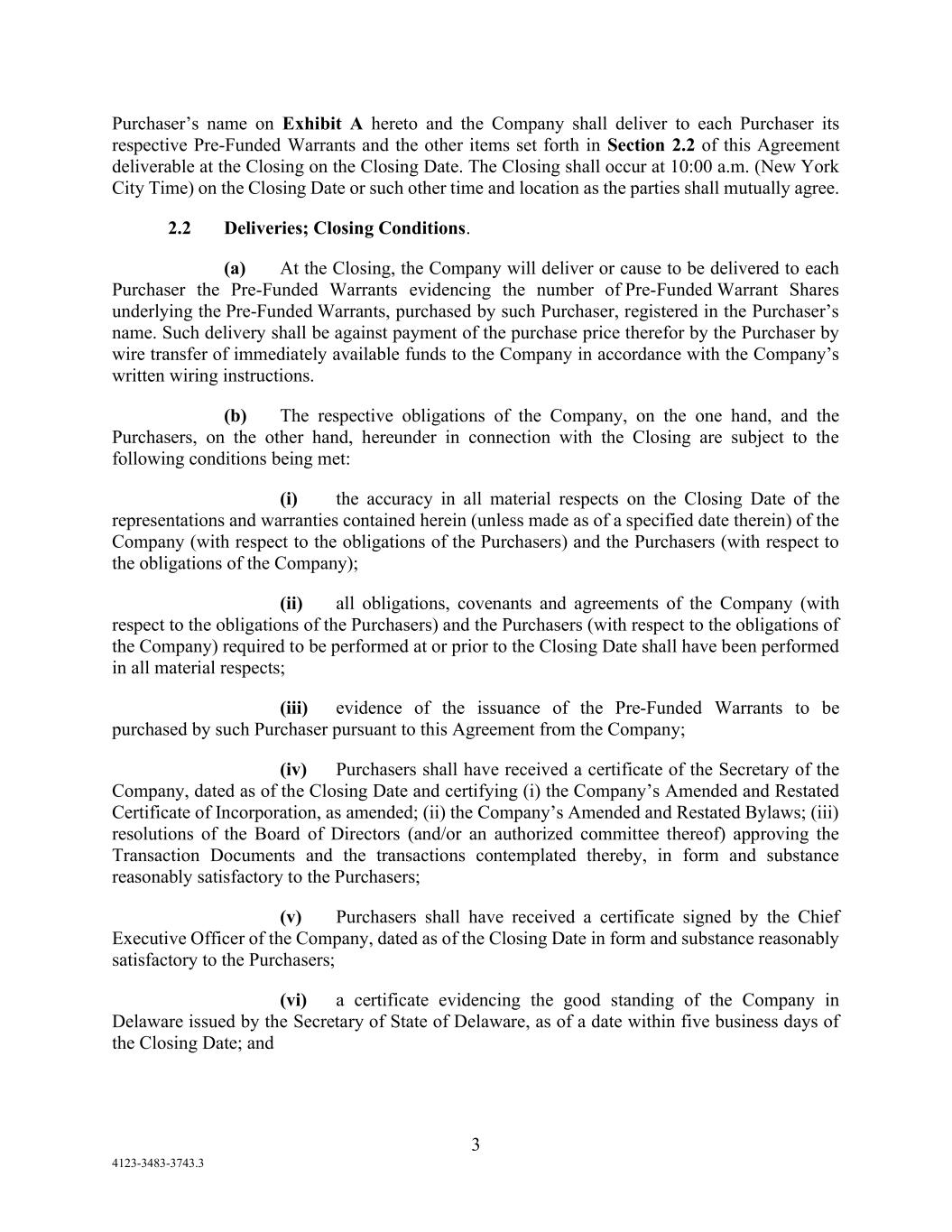 3 4123-3483-3743.3 Purchaser’s name on Exhibit A hereto and the Company shall deliver to each Purchaser its respective Pre-Funded Warrants and the other items set forth in Section 2.2 of this Agreement deliverable at the Closing on the Closing Date. The Closing shall occur at 10:00 a.m. (New York City Time) on the Closing Date or such other time and location as the parties shall mutually agree. 2.2 Deliveries; Closing Conditions. (a) At the Closing, the Company will deliver or cause to be delivered to each Purchaser the Pre-Funded Warrants evidencing the number of Pre-Funded Warrant Shares underlying the Pre-Funded Warrants, purchased by such Purchaser, registered in the Purchaser’s name. Such delivery shall be against payment of the purchase price therefor by the Purchaser by wire transfer of immediately available funds to the Company in accordance with the Company’s written wiring instructions. (b) The respective obligations of the Company, on the one hand, and the Purchasers, on the other hand, hereunder in connection with the Closing are subject to the following conditions being met: (i) the accuracy in all material respects on the Closing Date of the representations and warranties contained herein (unless made as of a specified date therein) of the Company (with respect to the obligations of the Purchasers) and the Purchasers (with respect to the obligations of the Company); (ii) all obligations, covenants and agreements of the Company (with respect to the obligations of the Purchasers) and the Purchasers (with respect to the obligations of the Company) required to be performed at or prior to the Closing Date shall have been performed in all material respects; (iii) evidence of the issuance of the Pre-Funded Warrants to be purchased by such Purchaser pursuant to this Agreement from the Company; (iv) Purchasers shall have received a certificate of the Secretary of the Company, dated as of the Closing Date and certifying (i) the Company’s Amended and Restated Certificate of Incorporation, as amended; (ii) the Company’s Amended and Restated Bylaws; (iii) resolutions of the Board of Directors (and/or an authorized committee thereof) approving the Transaction Documents and the transactions contemplated thereby, in form and substance reasonably satisfactory to the Purchasers; (v) Purchasers shall have received a certificate signed by the Chief Executive Officer of the Company, dated as of the Closing Date in form and substance reasonably satisfactory to the Purchasers; (vi) a certificate evidencing the good standing of the Company in Delaware issued by the Secretary of State of Delaware, as of a date within five business days of the Closing Date; and
