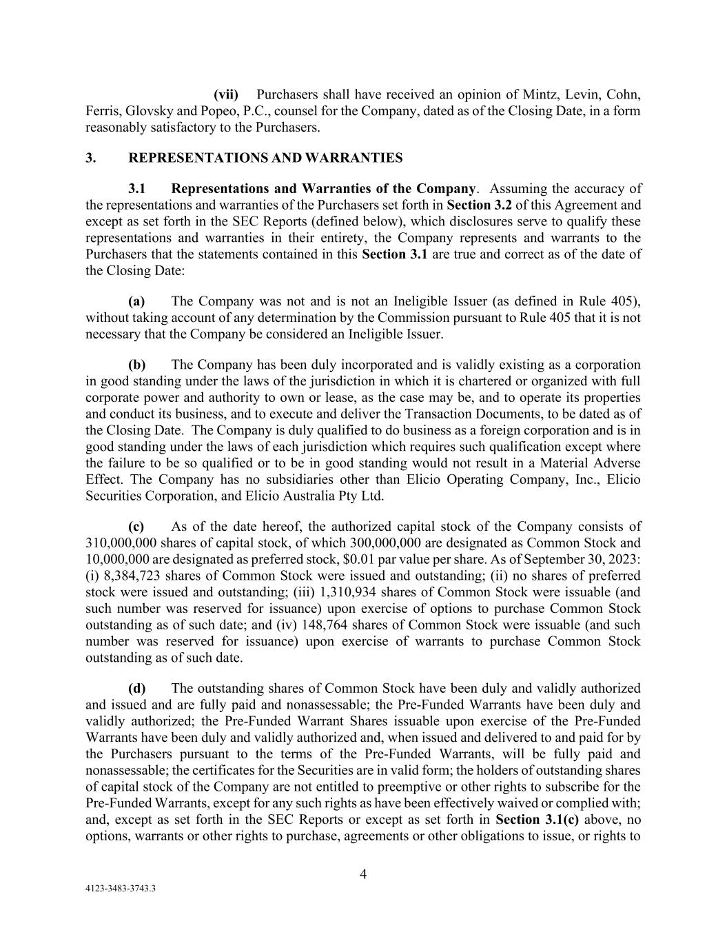 4 4123-3483-3743.3 (vii) Purchasers shall have received an opinion of Mintz, Levin, Cohn, Ferris, Glovsky and Popeo, P.C., counsel for the Company, dated as of the Closing Date, in a form reasonably satisfactory to the Purchasers. 3. REPRESENTATIONS AND WARRANTIES 3.1 Representations and Warranties of the Company. Assuming the accuracy of the representations and warranties of the Purchasers set forth in Section 3.2 of this Agreement and except as set forth in the SEC Reports (defined below), which disclosures serve to qualify these representations and warranties in their entirety, the Company represents and warrants to the Purchasers that the statements contained in this Section 3.1 are true and correct as of the date of the Closing Date: (a) The Company was not and is not an Ineligible Issuer (as defined in Rule 405), without taking account of any determination by the Commission pursuant to Rule 405 that it is not necessary that the Company be considered an Ineligible Issuer. (b) The Company has been duly incorporated and is validly existing as a corporation in good standing under the laws of the jurisdiction in which it is chartered or organized with full corporate power and authority to own or lease, as the case may be, and to operate its properties and conduct its business, and to execute and deliver the Transaction Documents, to be dated as of the Closing Date. The Company is duly qualified to do business as a foreign corporation and is in good standing under the laws of each jurisdiction which requires such qualification except where the failure to be so qualified or to be in good standing would not result in a Material Adverse Effect. The Company has no subsidiaries other than Elicio Operating Company, Inc., Elicio Securities Corporation, and Elicio Australia Pty Ltd. (c) As of the date hereof, the authorized capital stock of the Company consists of 310,000,000 shares of capital stock, of which 300,000,000 are designated as Common Stock and 10,000,000 are designated as preferred stock, $0.01 par value per share. As of September 30, 2023: (i) 8,384,723 shares of Common Stock were issued and outstanding; (ii) no shares of preferred stock were issued and outstanding; (iii) 1,310,934 shares of Common Stock were issuable (and such number was reserved for issuance) upon exercise of options to purchase Common Stock outstanding as of such date; and (iv) 148,764 shares of Common Stock were issuable (and such number was reserved for issuance) upon exercise of warrants to purchase Common Stock outstanding as of such date. (d) The outstanding shares of Common Stock have been duly and validly authorized and issued and are fully paid and nonassessable; the Pre-Funded Warrants have been duly and validly authorized; the Pre-Funded Warrant Shares issuable upon exercise of the Pre-Funded Warrants have been duly and validly authorized and, when issued and delivered to and paid for by the Purchasers pursuant to the terms of the Pre-Funded Warrants, will be fully paid and nonassessable; the certificates for the Securities are in valid form; the holders of outstanding shares of capital stock of the Company are not entitled to preemptive or other rights to subscribe for the Pre-Funded Warrants, except for any such rights as have been effectively waived or complied with; and, except as set forth in the SEC Reports or except as set forth in Section 3.1(c) above, no options, warrants or other rights to purchase, agreements or other obligations to issue, or rights to