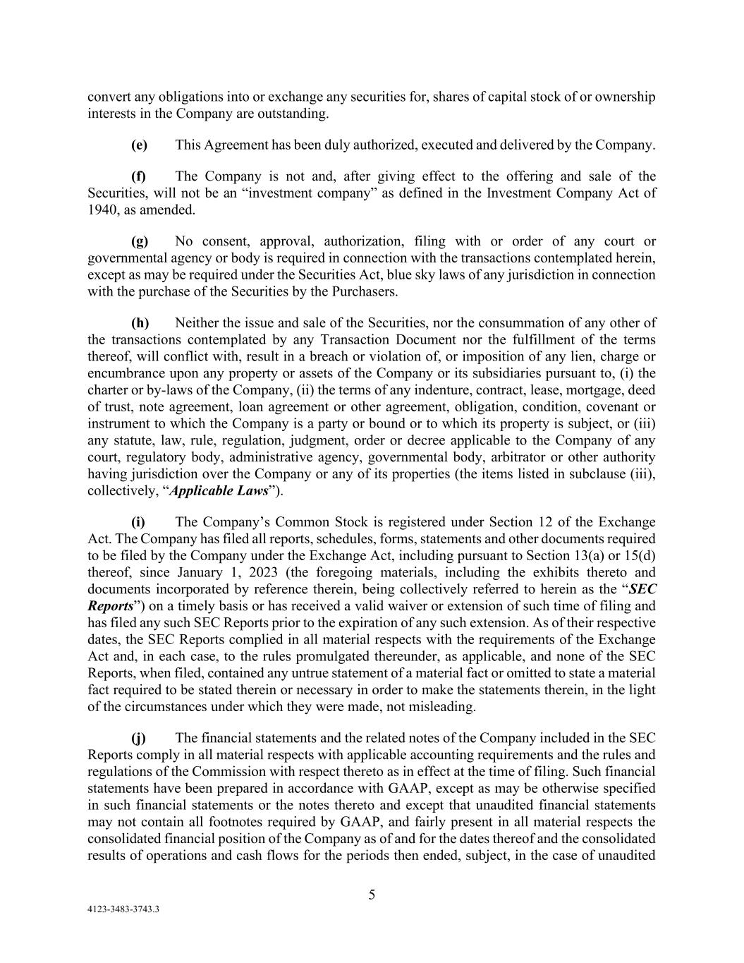 5 4123-3483-3743.3 convert any obligations into or exchange any securities for, shares of capital stock of or ownership interests in the Company are outstanding. (e) This Agreement has been duly authorized, executed and delivered by the Company. (f) The Company is not and, after giving effect to the offering and sale of the Securities, will not be an “investment company” as defined in the Investment Company Act of 1940, as amended. (g) No consent, approval, authorization, filing with or order of any court or governmental agency or body is required in connection with the transactions contemplated herein, except as may be required under the Securities Act, blue sky laws of any jurisdiction in connection with the purchase of the Securities by the Purchasers. (h) Neither the issue and sale of the Securities, nor the consummation of any other of the transactions contemplated by any Transaction Document nor the fulfillment of the terms thereof, will conflict with, result in a breach or violation of, or imposition of any lien, charge or encumbrance upon any property or assets of the Company or its subsidiaries pursuant to, (i) the charter or by-laws of the Company, (ii) the terms of any indenture, contract, lease, mortgage, deed of trust, note agreement, loan agreement or other agreement, obligation, condition, covenant or instrument to which the Company is a party or bound or to which its property is subject, or (iii) any statute, law, rule, regulation, judgment, order or decree applicable to the Company of any court, regulatory body, administrative agency, governmental body, arbitrator or other authority having jurisdiction over the Company or any of its properties (the items listed in subclause (iii), collectively, “Applicable Laws”). (i) The Company’s Common Stock is registered under Section 12 of the Exchange Act. The Company has filed all reports, schedules, forms, statements and other documents required to be filed by the Company under the Exchange Act, including pursuant to Section 13(a) or 15(d) thereof, since January 1, 2023 (the foregoing materials, including the exhibits thereto and documents incorporated by reference therein, being collectively referred to herein as the “SEC Reports”) on a timely basis or has received a valid waiver or extension of such time of filing and has filed any such SEC Reports prior to the expiration of any such extension. As of their respective dates, the SEC Reports complied in all material respects with the requirements of the Exchange Act and, in each case, to the rules promulgated thereunder, as applicable, and none of the SEC Reports, when filed, contained any untrue statement of a material fact or omitted to state a material fact required to be stated therein or necessary in order to make the statements therein, in the light of the circumstances under which they were made, not misleading. (j) The financial statements and the related notes of the Company included in the SEC Reports comply in all material respects with applicable accounting requirements and the rules and regulations of the Commission with respect thereto as in effect at the time of filing. Such financial statements have been prepared in accordance with GAAP, except as may be otherwise specified in such financial statements or the notes thereto and except that unaudited financial statements may not contain all footnotes required by GAAP, and fairly present in all material respects the consolidated financial position of the Company as of and for the dates thereof and the consolidated results of operations and cash flows for the periods then ended, subject, in the case of unaudited