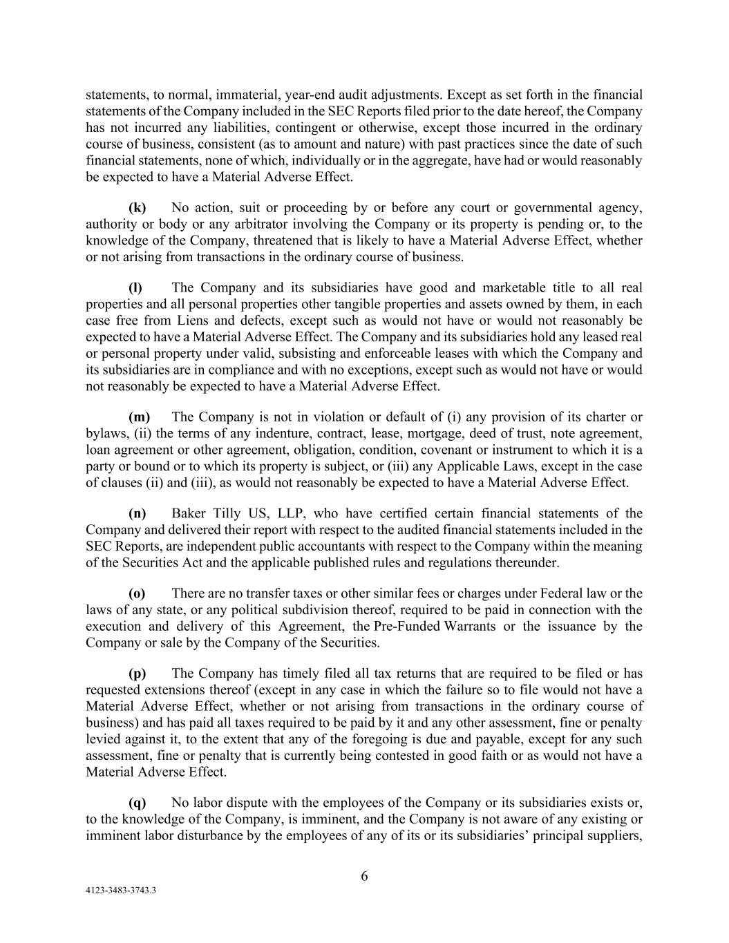 6 4123-3483-3743.3 statements, to normal, immaterial, year-end audit adjustments. Except as set forth in the financial statements of the Company included in the SEC Reports filed prior to the date hereof, the Company has not incurred any liabilities, contingent or otherwise, except those incurred in the ordinary course of business, consistent (as to amount and nature) with past practices since the date of such financial statements, none of which, individually or in the aggregate, have had or would reasonably be expected to have a Material Adverse Effect. (k) No action, suit or proceeding by or before any court or governmental agency, authority or body or any arbitrator involving the Company or its property is pending or, to the knowledge of the Company, threatened that is likely to have a Material Adverse Effect, whether or not arising from transactions in the ordinary course of business. (l) The Company and its subsidiaries have good and marketable title to all real properties and all personal properties other tangible properties and assets owned by them, in each case free from Liens and defects, except such as would not have or would not reasonably be expected to have a Material Adverse Effect. The Company and its subsidiaries hold any leased real or personal property under valid, subsisting and enforceable leases with which the Company and its subsidiaries are in compliance and with no exceptions, except such as would not have or would not reasonably be expected to have a Material Adverse Effect. (m) The Company is not in violation or default of (i) any provision of its charter or bylaws, (ii) the terms of any indenture, contract, lease, mortgage, deed of trust, note agreement, loan agreement or other agreement, obligation, condition, covenant or instrument to which it is a party or bound or to which its property is subject, or (iii) any Applicable Laws, except in the case of clauses (ii) and (iii), as would not reasonably be expected to have a Material Adverse Effect. (n) Baker Tilly US, LLP, who have certified certain financial statements of the Company and delivered their report with respect to the audited financial statements included in the SEC Reports, are independent public accountants with respect to the Company within the meaning of the Securities Act and the applicable published rules and regulations thereunder. (o) There are no transfer taxes or other similar fees or charges under Federal law or the laws of any state, or any political subdivision thereof, required to be paid in connection with the execution and delivery of this Agreement, the Pre-Funded Warrants or the issuance by the Company or sale by the Company of the Securities. (p) The Company has timely filed all tax returns that are required to be filed or has requested extensions thereof (except in any case in which the failure so to file would not have a Material Adverse Effect, whether or not arising from transactions in the ordinary course of business) and has paid all taxes required to be paid by it and any other assessment, fine or penalty levied against it, to the extent that any of the foregoing is due and payable, except for any such assessment, fine or penalty that is currently being contested in good faith or as would not have a Material Adverse Effect. (q) No labor dispute with the employees of the Company or its subsidiaries exists or, to the knowledge of the Company, is imminent, and the Company is not aware of any existing or imminent labor disturbance by the employees of any of its or its subsidiaries’ principal suppliers,