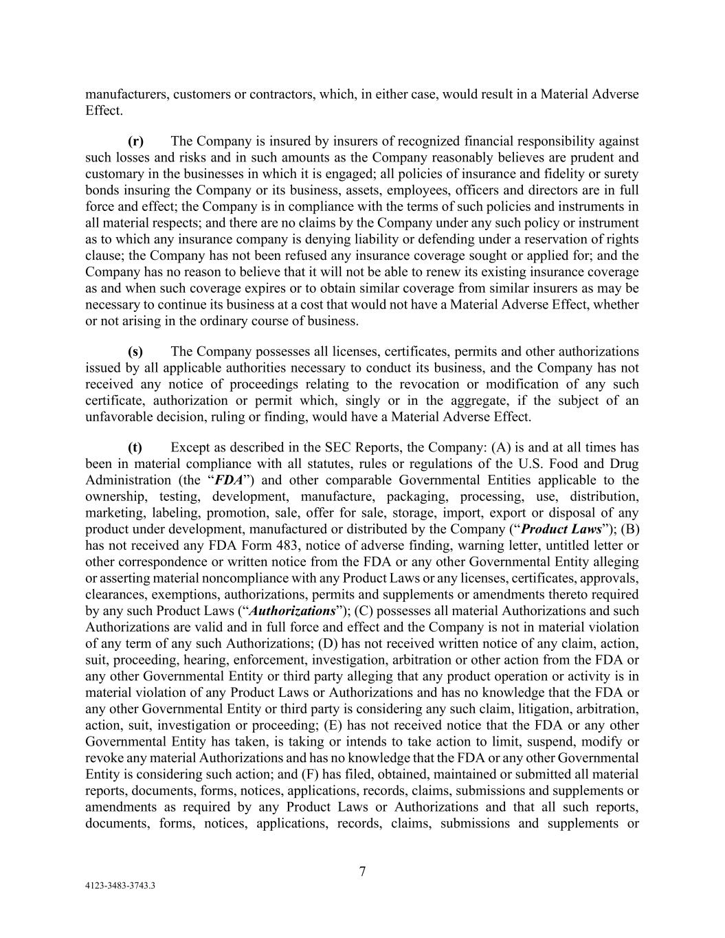 7 4123-3483-3743.3 manufacturers, customers or contractors, which, in either case, would result in a Material Adverse Effect. (r) The Company is insured by insurers of recognized financial responsibility against such losses and risks and in such amounts as the Company reasonably believes are prudent and customary in the businesses in which it is engaged; all policies of insurance and fidelity or surety bonds insuring the Company or its business, assets, employees, officers and directors are in full force and effect; the Company is in compliance with the terms of such policies and instruments in all material respects; and there are no claims by the Company under any such policy or instrument as to which any insurance company is denying liability or defending under a reservation of rights clause; the Company has not been refused any insurance coverage sought or applied for; and the Company has no reason to believe that it will not be able to renew its existing insurance coverage as and when such coverage expires or to obtain similar coverage from similar insurers as may be necessary to continue its business at a cost that would not have a Material Adverse Effect, whether or not arising in the ordinary course of business. (s) The Company possesses all licenses, certificates, permits and other authorizations issued by all applicable authorities necessary to conduct its business, and the Company has not received any notice of proceedings relating to the revocation or modification of any such certificate, authorization or permit which, singly or in the aggregate, if the subject of an unfavorable decision, ruling or finding, would have a Material Adverse Effect. (t) Except as described in the SEC Reports, the Company: (A) is and at all times has been in material compliance with all statutes, rules or regulations of the U.S. Food and Drug Administration (the “FDA”) and other comparable Governmental Entities applicable to the ownership, testing, development, manufacture, packaging, processing, use, distribution, marketing, labeling, promotion, sale, offer for sale, storage, import, export or disposal of any product under development, manufactured or distributed by the Company (“Product Laws”); (B) has not received any FDA Form 483, notice of adverse finding, warning letter, untitled letter or other correspondence or written notice from the FDA or any other Governmental Entity alleging or asserting material noncompliance with any Product Laws or any licenses, certificates, approvals, clearances, exemptions, authorizations, permits and supplements or amendments thereto required by any such Product Laws (“Authorizations”); (C) possesses all material Authorizations and such Authorizations are valid and in full force and effect and the Company is not in material violation of any term of any such Authorizations; (D) has not received written notice of any claim, action, suit, proceeding, hearing, enforcement, investigation, arbitration or other action from the FDA or any other Governmental Entity or third party alleging that any product operation or activity is in material violation of any Product Laws or Authorizations and has no knowledge that the FDA or any other Governmental Entity or third party is considering any such claim, litigation, arbitration, action, suit, investigation or proceeding; (E) has not received notice that the FDA or any other Governmental Entity has taken, is taking or intends to take action to limit, suspend, modify or revoke any material Authorizations and has no knowledge that the FDA or any other Governmental Entity is considering such action; and (F) has filed, obtained, maintained or submitted all material reports, documents, forms, notices, applications, records, claims, submissions and supplements or amendments as required by any Product Laws or Authorizations and that all such reports, documents, forms, notices, applications, records, claims, submissions and supplements or