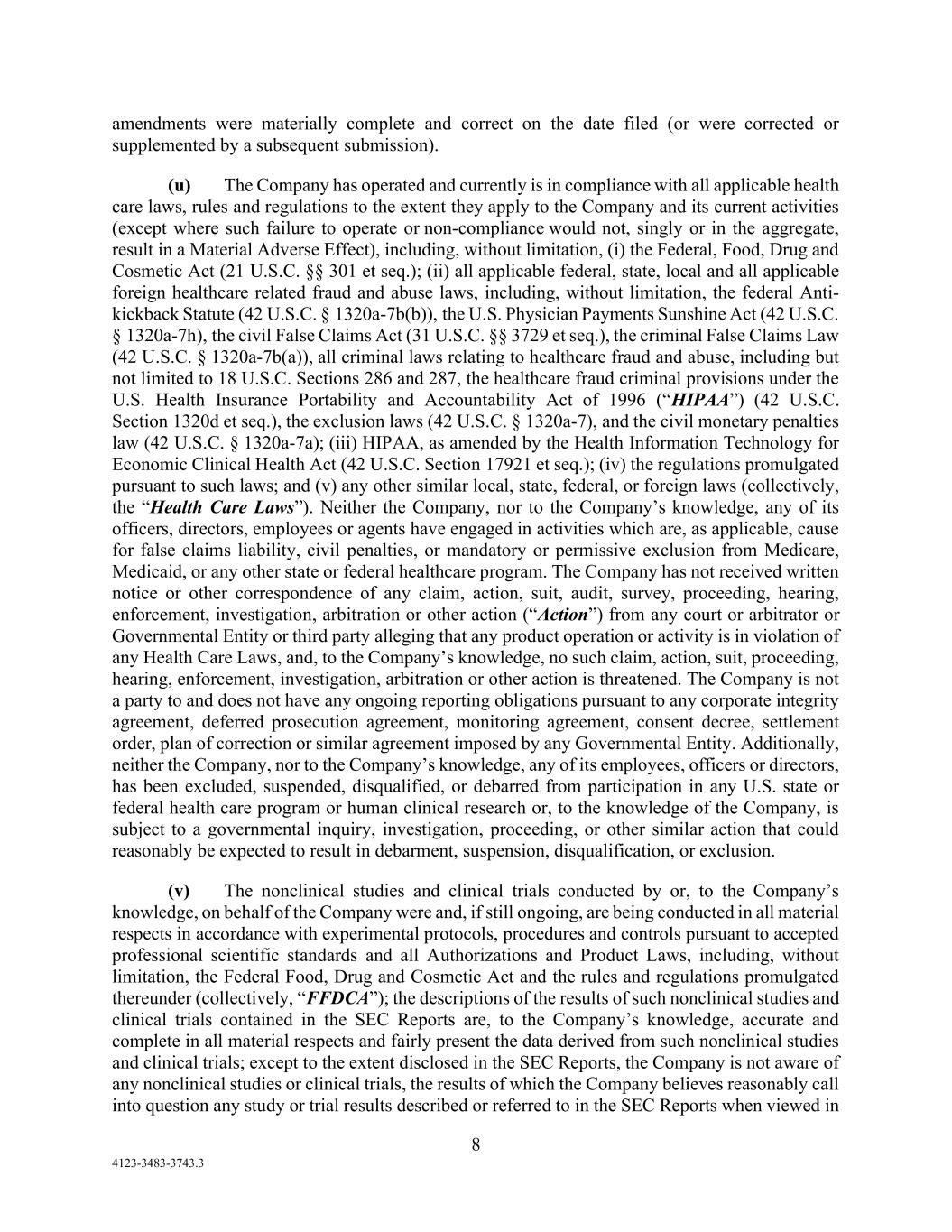 8 4123-3483-3743.3 amendments were materially complete and correct on the date filed (or were corrected or supplemented by a subsequent submission). (u) The Company has operated and currently is in compliance with all applicable health care laws, rules and regulations to the extent they apply to the Company and its current activities (except where such failure to operate or non-compliance would not, singly or in the aggregate, result in a Material Adverse Effect), including, without limitation, (i) the Federal, Food, Drug and Cosmetic Act (21 U.S.C. §§ 301 et seq.); (ii) all applicable federal, state, local and all applicable foreign healthcare related fraud and abuse laws, including, without limitation, the federal Anti- kickback Statute (42 U.S.C. § 1320a-7b(b)), the U.S. Physician Payments Sunshine Act (42 U.S.C. § 1320a-7h), the civil False Claims Act (31 U.S.C. §§ 3729 et seq.), the criminal False Claims Law (42 U.S.C. § 1320a-7b(a)), all criminal laws relating to healthcare fraud and abuse, including but not limited to 18 U.S.C. Sections 286 and 287, the healthcare fraud criminal provisions under the U.S. Health Insurance Portability and Accountability Act of 1996 (“HIPAA”) (42 U.S.C. Section 1320d et seq.), the exclusion laws (42 U.S.C. § 1320a-7), and the civil monetary penalties law (42 U.S.C. § 1320a-7a); (iii) HIPAA, as amended by the Health Information Technology for Economic Clinical Health Act (42 U.S.C. Section 17921 et seq.); (iv) the regulations promulgated pursuant to such laws; and (v) any other similar local, state, federal, or foreign laws (collectively, the “Health Care Laws”). Neither the Company, nor to the Company’s knowledge, any of its officers, directors, employees or agents have engaged in activities which are, as applicable, cause for false claims liability, civil penalties, or mandatory or permissive exclusion from Medicare, Medicaid, or any other state or federal healthcare program. The Company has not received written notice or other correspondence of any claim, action, suit, audit, survey, proceeding, hearing, enforcement, investigation, arbitration or other action (“Action”) from any court or arbitrator or Governmental Entity or third party alleging that any product operation or activity is in violation of any Health Care Laws, and, to the Company’s knowledge, no such claim, action, suit, proceeding, hearing, enforcement, investigation, arbitration or other action is threatened. The Company is not a party to and does not have any ongoing reporting obligations pursuant to any corporate integrity agreement, deferred prosecution agreement, monitoring agreement, consent decree, settlement order, plan of correction or similar agreement imposed by any Governmental Entity. Additionally, neither the Company, nor to the Company’s knowledge, any of its employees, officers or directors, has been excluded, suspended, disqualified, or debarred from participation in any U.S. state or federal health care program or human clinical research or, to the knowledge of the Company, is subject to a governmental inquiry, investigation, proceeding, or other similar action that could reasonably be expected to result in debarment, suspension, disqualification, or exclusion. (v) The nonclinical studies and clinical trials conducted by or, to the Company’s knowledge, on behalf of the Company were and, if still ongoing, are being conducted in all material respects in accordance with experimental protocols, procedures and controls pursuant to accepted professional scientific standards and all Authorizations and Product Laws, including, without limitation, the Federal Food, Drug and Cosmetic Act and the rules and regulations promulgated thereunder (collectively, “FFDCA”); the descriptions of the results of such nonclinical studies and clinical trials contained in the SEC Reports are, to the Company’s knowledge, accurate and complete in all material respects and fairly present the data derived from such nonclinical studies and clinical trials; except to the extent disclosed in the SEC Reports, the Company is not aware of any nonclinical studies or clinical trials, the results of which the Company believes reasonably call into question any study or trial results described or referred to in the SEC Reports when viewed in