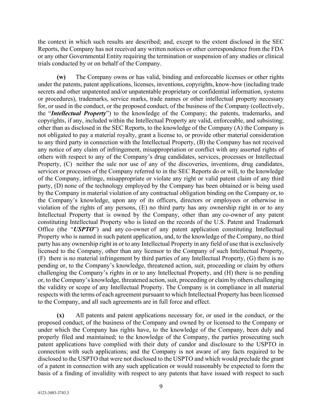 9 4123-3483-3743.3 the context in which such results are described; and, except to the extent disclosed in the SEC Reports, the Company has not received any written notices or other correspondence from the FDA or any other Governmental Entity requiring the termination or suspension of any studies or clinical trials conducted by or on behalf of the Company. (w) The Company owns or has valid, binding and enforceable licenses or other rights under the patents, patent applications, licenses, inventions, copyrights, know-how (including trade secrets and other unpatented and/or unpatentable proprietary or confidential information, systems or procedures), trademarks, service marks, trade names or other intellectual property necessary for, or used in the conduct, or the proposed conduct, of the business of the Company (collectively, the “Intellectual Property”) to the knowledge of the Company; the patents, trademarks, and copyrights, if any, included within the Intellectual Property are valid, enforceable, and subsisting; other than as disclosed in the SEC Reports, to the knowledge of the Company (A) the Company is not obligated to pay a material royalty, grant a license to, or provide other material consideration to any third party in connection with the Intellectual Property, (B) the Company has not received any notice of any claim of infringement, misappropriation or conflict with any asserted rights of others with respect to any of the Company’s drug candidates, services, processes or Intellectual Property, (C) neither the sale nor use of any of the discoveries, inventions, drug candidates, services or processes of the Company referred to in the SEC Reports do or will, to the knowledge of the Company, infringe, misappropriate or violate any right or valid patent claim of any third party, (D) none of the technology employed by the Company has been obtained or is being used by the Company in material violation of any contractual obligation binding on the Company or, to the Company’s knowledge, upon any of its officers, directors or employees or otherwise in violation of the rights of any persons, (E) no third party has any ownership right in or to any Intellectual Property that is owned by the Company, other than any co-owner of any patent constituting Intellectual Property who is listed on the records of the U.S. Patent and Trademark Office (the “USPTO”) and any co-owner of any patent application constituting Intellectual Property who is named in such patent application, and, to the knowledge of the Company, no third party has any ownership right in or to any Intellectual Property in any field of use that is exclusively licensed to the Company, other than any licensor to the Company of such Intellectual Property, (F) there is no material infringement by third parties of any Intellectual Property, (G) there is no pending or, to the Company’s knowledge, threatened action, suit, proceeding or claim by others challenging the Company’s rights in or to any Intellectual Property, and (H) there is no pending or, to the Company’s knowledge, threatened action, suit, proceeding or claim by others challenging the validity or scope of any Intellectual Property. The Company is in compliance in all material respects with the terms of each agreement pursuant to which Intellectual Property has been licensed to the Company, and all such agreements are in full force and effect. (x) All patents and patent applications necessary for, or used in the conduct, or the proposed conduct, of the business of the Company and owned by or licensed to the Company or under which the Company has rights have, to the knowledge of the Company, been duly and properly filed and maintained; to the knowledge of the Company, the parties prosecuting such patent applications have complied with their duty of candor and disclosure to the USPTO in connection with such applications; and the Company is not aware of any facts required to be disclosed to the USPTO that were not disclosed to the USPTO and which would preclude the grant of a patent in connection with any such application or would reasonably be expected to form the basis of a finding of invalidity with respect to any patents that have issued with respect to such
