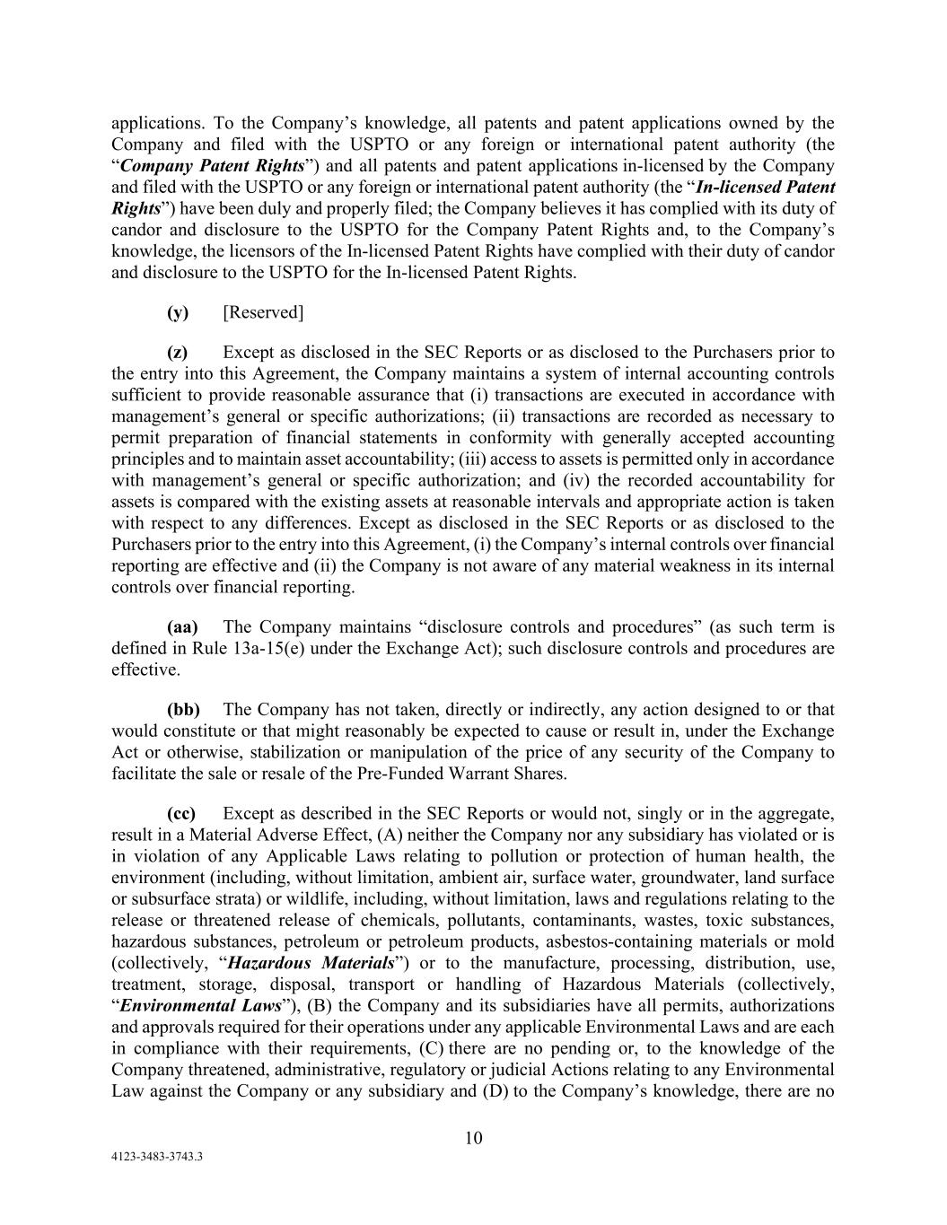 10 4123-3483-3743.3 applications. To the Company’s knowledge, all patents and patent applications owned by the Company and filed with the USPTO or any foreign or international patent authority (the “Company Patent Rights”) and all patents and patent applications in-licensed by the Company and filed with the USPTO or any foreign or international patent authority (the “In-licensed Patent Rights”) have been duly and properly filed; the Company believes it has complied with its duty of candor and disclosure to the USPTO for the Company Patent Rights and, to the Company’s knowledge, the licensors of the In-licensed Patent Rights have complied with their duty of candor and disclosure to the USPTO for the In-licensed Patent Rights. (y) [Reserved] (z) Except as disclosed in the SEC Reports or as disclosed to the Purchasers prior to the entry into this Agreement, the Company maintains a system of internal accounting controls sufficient to provide reasonable assurance that (i) transactions are executed in accordance with management’s general or specific authorizations; (ii) transactions are recorded as necessary to permit preparation of financial statements in conformity with generally accepted accounting principles and to maintain asset accountability; (iii) access to assets is permitted only in accordance with management’s general or specific authorization; and (iv) the recorded accountability for assets is compared with the existing assets at reasonable intervals and appropriate action is taken with respect to any differences. Except as disclosed in the SEC Reports or as disclosed to the Purchasers prior to the entry into this Agreement, (i) the Company’s internal controls over financial reporting are effective and (ii) the Company is not aware of any material weakness in its internal controls over financial reporting. (aa) The Company maintains “disclosure controls and procedures” (as such term is defined in Rule 13a-15(e) under the Exchange Act); such disclosure controls and procedures are effective. (bb) The Company has not taken, directly or indirectly, any action designed to or that would constitute or that might reasonably be expected to cause or result in, under the Exchange Act or otherwise, stabilization or manipulation of the price of any security of the Company to facilitate the sale or resale of the Pre-Funded Warrant Shares. (cc) Except as described in the SEC Reports or would not, singly or in the aggregate, result in a Material Adverse Effect, (A) neither the Company nor any subsidiary has violated or is in violation of any Applicable Laws relating to pollution or protection of human health, the environment (including, without limitation, ambient air, surface water, groundwater, land surface or subsurface strata) or wildlife, including, without limitation, laws and regulations relating to the release or threatened release of chemicals, pollutants, contaminants, wastes, toxic substances, hazardous substances, petroleum or petroleum products, asbestos-containing materials or mold (collectively, “Hazardous Materials”) or to the manufacture, processing, distribution, use, treatment, storage, disposal, transport or handling of Hazardous Materials (collectively, “Environmental Laws”), (B) the Company and its subsidiaries have all permits, authorizations and approvals required for their operations under any applicable Environmental Laws and are each in compliance with their requirements, (C) there are no pending or, to the knowledge of the Company threatened, administrative, regulatory or judicial Actions relating to any Environmental Law against the Company or any subsidiary and (D) to the Company’s knowledge, there are no