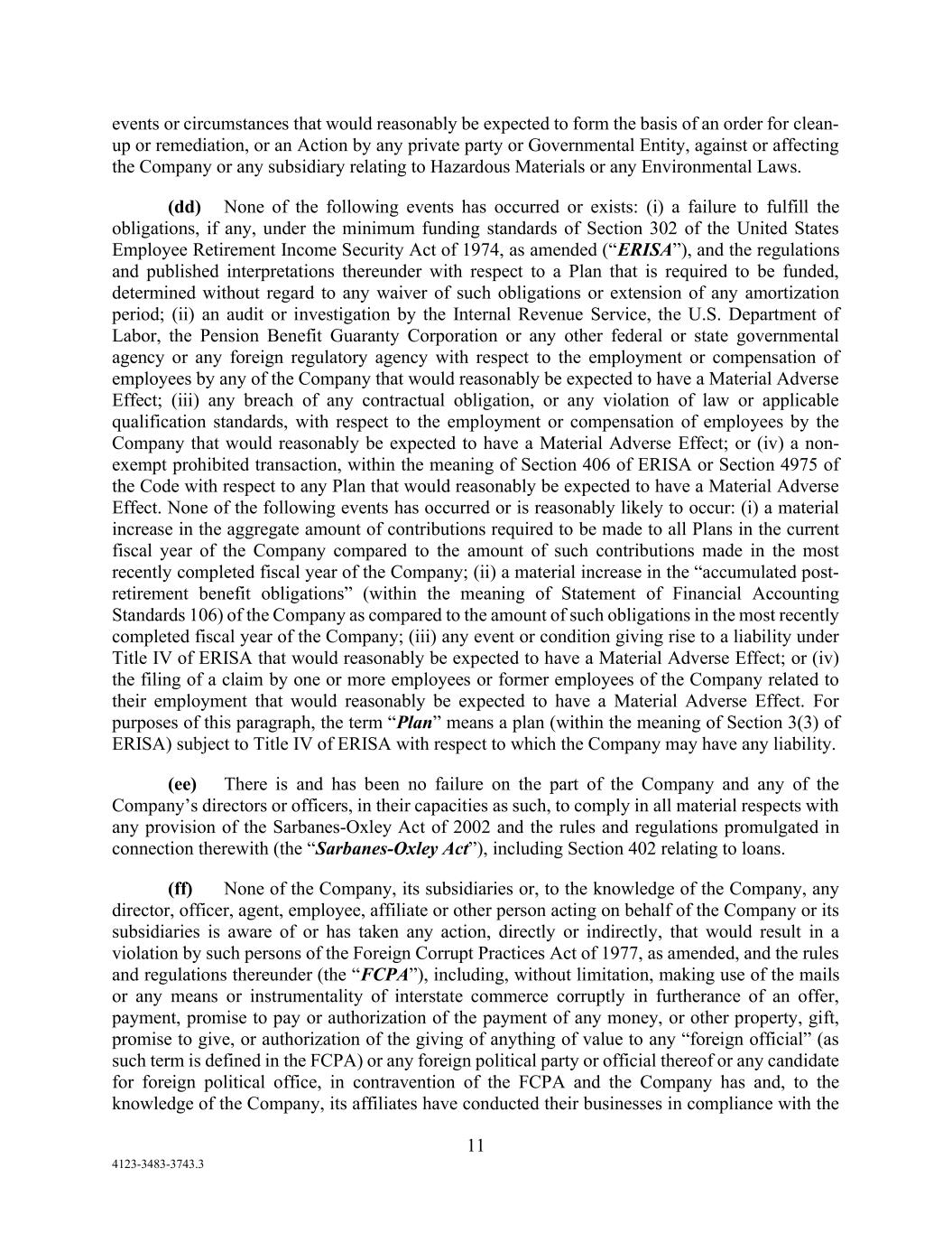 11 4123-3483-3743.3 events or circumstances that would reasonably be expected to form the basis of an order for clean- up or remediation, or an Action by any private party or Governmental Entity, against or affecting the Company or any subsidiary relating to Hazardous Materials or any Environmental Laws. (dd) None of the following events has occurred or exists: (i) a failure to fulfill the obligations, if any, under the minimum funding standards of Section 302 of the United States Employee Retirement Income Security Act of 1974, as amended (“ERISA”), and the regulations and published interpretations thereunder with respect to a Plan that is required to be funded, determined without regard to any waiver of such obligations or extension of any amortization period; (ii) an audit or investigation by the Internal Revenue Service, the U.S. Department of Labor, the Pension Benefit Guaranty Corporation or any other federal or state governmental agency or any foreign regulatory agency with respect to the employment or compensation of employees by any of the Company that would reasonably be expected to have a Material Adverse Effect; (iii) any breach of any contractual obligation, or any violation of law or applicable qualification standards, with respect to the employment or compensation of employees by the Company that would reasonably be expected to have a Material Adverse Effect; or (iv) a non- exempt prohibited transaction, within the meaning of Section 406 of ERISA or Section 4975 of the Code with respect to any Plan that would reasonably be expected to have a Material Adverse Effect. None of the following events has occurred or is reasonably likely to occur: (i) a material increase in the aggregate amount of contributions required to be made to all Plans in the current fiscal year of the Company compared to the amount of such contributions made in the most recently completed fiscal year of the Company; (ii) a material increase in the “accumulated post- retirement benefit obligations” (within the meaning of Statement of Financial Accounting Standards 106) of the Company as compared to the amount of such obligations in the most recently completed fiscal year of the Company; (iii) any event or condition giving rise to a liability under Title IV of ERISA that would reasonably be expected to have a Material Adverse Effect; or (iv) the filing of a claim by one or more employees or former employees of the Company related to their employment that would reasonably be expected to have a Material Adverse Effect. For purposes of this paragraph, the term “Plan” means a plan (within the meaning of Section 3(3) of ERISA) subject to Title IV of ERISA with respect to which the Company may have any liability. (ee) There is and has been no failure on the part of the Company and any of the Company’s directors or officers, in their capacities as such, to comply in all material respects with any provision of the Sarbanes-Oxley Act of 2002 and the rules and regulations promulgated in connection therewith (the “Sarbanes-Oxley Act”), including Section 402 relating to loans. (ff) None of the Company, its subsidiaries or, to the knowledge of the Company, any director, officer, agent, employee, affiliate or other person acting on behalf of the Company or its subsidiaries is aware of or has taken any action, directly or indirectly, that would result in a violation by such persons of the Foreign Corrupt Practices Act of 1977, as amended, and the rules and regulations thereunder (the “FCPA”), including, without limitation, making use of the mails or any means or instrumentality of interstate commerce corruptly in furtherance of an offer, payment, promise to pay or authorization of the payment of any money, or other property, gift, promise to give, or authorization of the giving of anything of value to any “foreign official” (as such term is defined in the FCPA) or any foreign political party or official thereof or any candidate for foreign political office, in contravention of the FCPA and the Company has and, to the knowledge of the Company, its affiliates have conducted their businesses in compliance with the