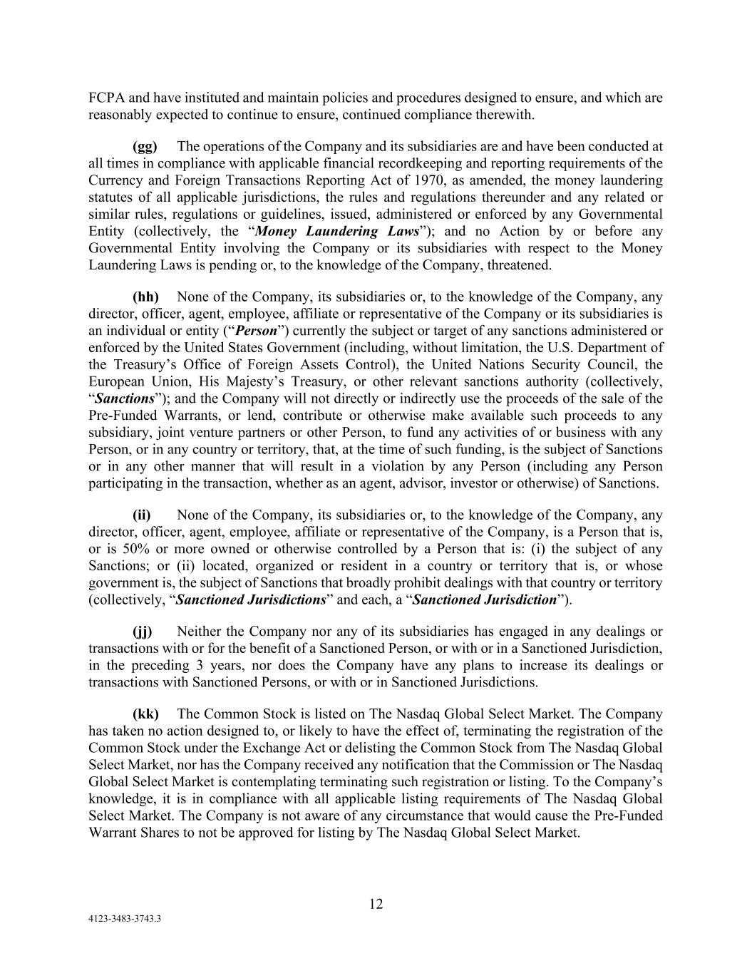12 4123-3483-3743.3 FCPA and have instituted and maintain policies and procedures designed to ensure, and which are reasonably expected to continue to ensure, continued compliance therewith. (gg) The operations of the Company and its subsidiaries are and have been conducted at all times in compliance with applicable financial recordkeeping and reporting requirements of the Currency and Foreign Transactions Reporting Act of 1970, as amended, the money laundering statutes of all applicable jurisdictions, the rules and regulations thereunder and any related or similar rules, regulations or guidelines, issued, administered or enforced by any Governmental Entity (collectively, the “Money Laundering Laws”); and no Action by or before any Governmental Entity involving the Company or its subsidiaries with respect to the Money Laundering Laws is pending or, to the knowledge of the Company, threatened. (hh) None of the Company, its subsidiaries or, to the knowledge of the Company, any director, officer, agent, employee, affiliate or representative of the Company or its subsidiaries is an individual or entity (“Person”) currently the subject or target of any sanctions administered or enforced by the United States Government (including, without limitation, the U.S. Department of the Treasury’s Office of Foreign Assets Control), the United Nations Security Council, the European Union, His Majesty’s Treasury, or other relevant sanctions authority (collectively, “Sanctions”); and the Company will not directly or indirectly use the proceeds of the sale of the Pre-Funded Warrants, or lend, contribute or otherwise make available such proceeds to any subsidiary, joint venture partners or other Person, to fund any activities of or business with any Person, or in any country or territory, that, at the time of such funding, is the subject of Sanctions or in any other manner that will result in a violation by any Person (including any Person participating in the transaction, whether as an agent, advisor, investor or otherwise) of Sanctions. (ii) None of the Company, its subsidiaries or, to the knowledge of the Company, any director, officer, agent, employee, affiliate or representative of the Company, is a Person that is, or is 50% or more owned or otherwise controlled by a Person that is: (i) the subject of any Sanctions; or (ii) located, organized or resident in a country or territory that is, or whose government is, the subject of Sanctions that broadly prohibit dealings with that country or territory (collectively, “Sanctioned Jurisdictions” and each, a “Sanctioned Jurisdiction”). (jj) Neither the Company nor any of its subsidiaries has engaged in any dealings or transactions with or for the benefit of a Sanctioned Person, or with or in a Sanctioned Jurisdiction, in the preceding 3 years, nor does the Company have any plans to increase its dealings or transactions with Sanctioned Persons, or with or in Sanctioned Jurisdictions. (kk) The Common Stock is listed on The Nasdaq Global Select Market. The Company has taken no action designed to, or likely to have the effect of, terminating the registration of the Common Stock under the Exchange Act or delisting the Common Stock from The Nasdaq Global Select Market, nor has the Company received any notification that the Commission or The Nasdaq Global Select Market is contemplating terminating such registration or listing. To the Company’s knowledge, it is in compliance with all applicable listing requirements of The Nasdaq Global Select Market. The Company is not aware of any circumstance that would cause the Pre-Funded Warrant Shares to not be approved for listing by The Nasdaq Global Select Market.