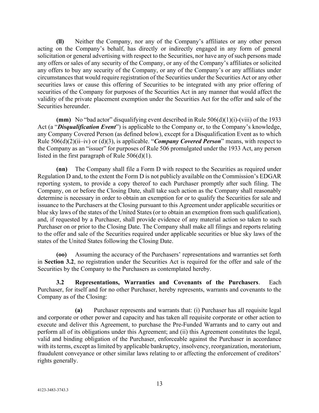 13 4123-3483-3743.3 (ll) Neither the Company, nor any of the Company’s affiliates or any other person acting on the Company’s behalf, has directly or indirectly engaged in any form of general solicitation or general advertising with respect to the Securities, nor have any of such persons made any offers or sales of any security of the Company, or any of the Company’s affiliates or solicited any offers to buy any security of the Company, or any of the Company’s or any affiliates under circumstances that would require registration of the Securities under the Securities Act or any other securities laws or cause this offering of Securities to be integrated with any prior offering of securities of the Company for purposes of the Securities Act in any manner that would affect the validity of the private placement exemption under the Securities Act for the offer and sale of the Securities hereunder. (mm) No “bad actor” disqualifying event described in Rule 506(d)(1)(i)-(viii) of the 1933 Act (a “Disqualification Event”) is applicable to the Company or, to the Company’s knowledge, any Company Covered Person (as defined below), except for a Disqualification Event as to which Rule 506(d)(2)(ii–iv) or (d)(3), is applicable. “Company Covered Person” means, with respect to the Company as an “issuer” for purposes of Rule 506 promulgated under the 1933 Act, any person listed in the first paragraph of Rule 506(d)(1). (nn) The Company shall file a Form D with respect to the Securities as required under Regulation D and, to the extent the Form D is not publicly available on the Commission’s EDGAR reporting system, to provide a copy thereof to each Purchaser promptly after such filing. The Company, on or before the Closing Date, shall take such action as the Company shall reasonably determine is necessary in order to obtain an exemption for or to qualify the Securities for sale and issuance to the Purchasers at the Closing pursuant to this Agreement under applicable securities or blue sky laws of the states of the United States (or to obtain an exemption from such qualification), and, if requested by a Purchaser, shall provide evidence of any material action so taken to such Purchaser on or prior to the Closing Date. The Company shall make all filings and reports relating to the offer and sale of the Securities required under applicable securities or blue sky laws of the states of the United States following the Closing Date. (oo) Assuming the accuracy of the Purchasers’ representations and warranties set forth in Section 3.2, no registration under the Securities Act is required for the offer and sale of the Securities by the Company to the Purchasers as contemplated hereby. 3.2 Representations, Warranties and Covenants of the Purchasers. Each Purchaser, for itself and for no other Purchaser, hereby represents, warrants and covenants to the Company as of the Closing: (a) Purchaser represents and warrants that: (i) Purchaser has all requisite legal and corporate or other power and capacity and has taken all requisite corporate or other action to execute and deliver this Agreement, to purchase the Pre-Funded Warrants and to carry out and perform all of its obligations under this Agreement; and (ii) this Agreement constitutes the legal, valid and binding obligation of the Purchaser, enforceable against the Purchaser in accordance with its terms, except as limited by applicable bankruptcy, insolvency, reorganization, moratorium, fraudulent conveyance or other similar laws relating to or affecting the enforcement of creditors’ rights generally.