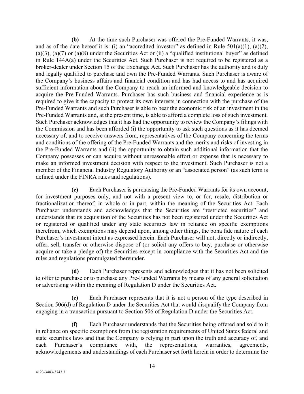 14 4123-3483-3743.3 (b) At the time such Purchaser was offered the Pre-Funded Warrants, it was, and as of the date hereof it is: (i) an “accredited investor” as defined in Rule 501(a)(1), (a)(2), (a)(3), (a)(7) or (a)(8) under the Securities Act or (ii) a “qualified institutional buyer” as defined in Rule 144A(a) under the Securities Act. Such Purchaser is not required to be registered as a broker-dealer under Section 15 of the Exchange Act. Such Purchaser has the authority and is duly and legally qualified to purchase and own the Pre-Funded Warrants. Such Purchaser is aware of the Company’s business affairs and financial condition and has had access to and has acquired sufficient information about the Company to reach an informed and knowledgeable decision to acquire the Pre-Funded Warrants. Purchaser has such business and financial experience as is required to give it the capacity to protect its own interests in connection with the purchase of the Pre-Funded Warrants and such Purchaser is able to bear the economic risk of an investment in the Pre-Funded Warrants and, at the present time, is able to afford a complete loss of such investment. Such Purchaser acknowledges that it has had the opportunity to review the Company’s filings with the Commission and has been afforded (i) the opportunity to ask such questions as it has deemed necessary of, and to receive answers from, representatives of the Company concerning the terms and conditions of the offering of the Pre-Funded Warrants and the merits and risks of investing in the Pre-Funded Warrants and (ii) the opportunity to obtain such additional information that the Company possesses or can acquire without unreasonable effort or expense that is necessary to make an informed investment decision with respect to the investment. Such Purchaser is not a member of the Financial Industry Regulatory Authority or an “associated person” (as such term is defined under the FINRA rules and regulations). (c) Each Purchaser is purchasing the Pre-Funded Warrants for its own account, for investment purposes only, and not with a present view to, or for, resale, distribution or fractionalization thereof, in whole or in part, within the meaning of the Securities Act. Each Purchaser understands and acknowledges that the Securities are “restricted securities” and understands that its acquisition of the Securities has not been registered under the Securities Act or registered or qualified under any state securities law in reliance on specific exemptions therefrom, which exemptions may depend upon, among other things, the bona fide nature of each Purchaser’s investment intent as expressed herein. Each Purchaser will not, directly or indirectly, offer, sell, transfer or otherwise dispose of (or solicit any offers to buy, purchase or otherwise acquire or take a pledge of) the Securities except in compliance with the Securities Act and the rules and regulations promulgated thereunder. (d) Each Purchaser represents and acknowledges that it has not been solicited to offer to purchase or to purchase any Pre-Funded Warrants by means of any general solicitation or advertising within the meaning of Regulation D under the Securities Act. (e) Each Purchaser represents that it is not a person of the type described in Section 506(d) of Regulation D under the Securities Act that would disqualify the Company from engaging in a transaction pursuant to Section 506 of Regulation D under the Securities Act. (f) Each Purchaser understands that the Securities being offered and sold to it in reliance on specific exemptions from the registration requirements of United States federal and state securities laws and that the Company is relying in part upon the truth and accuracy of, and each Purchaser’s compliance with, the representations, warranties, agreements, acknowledgements and understandings of each Purchaser set forth herein in order to determine the