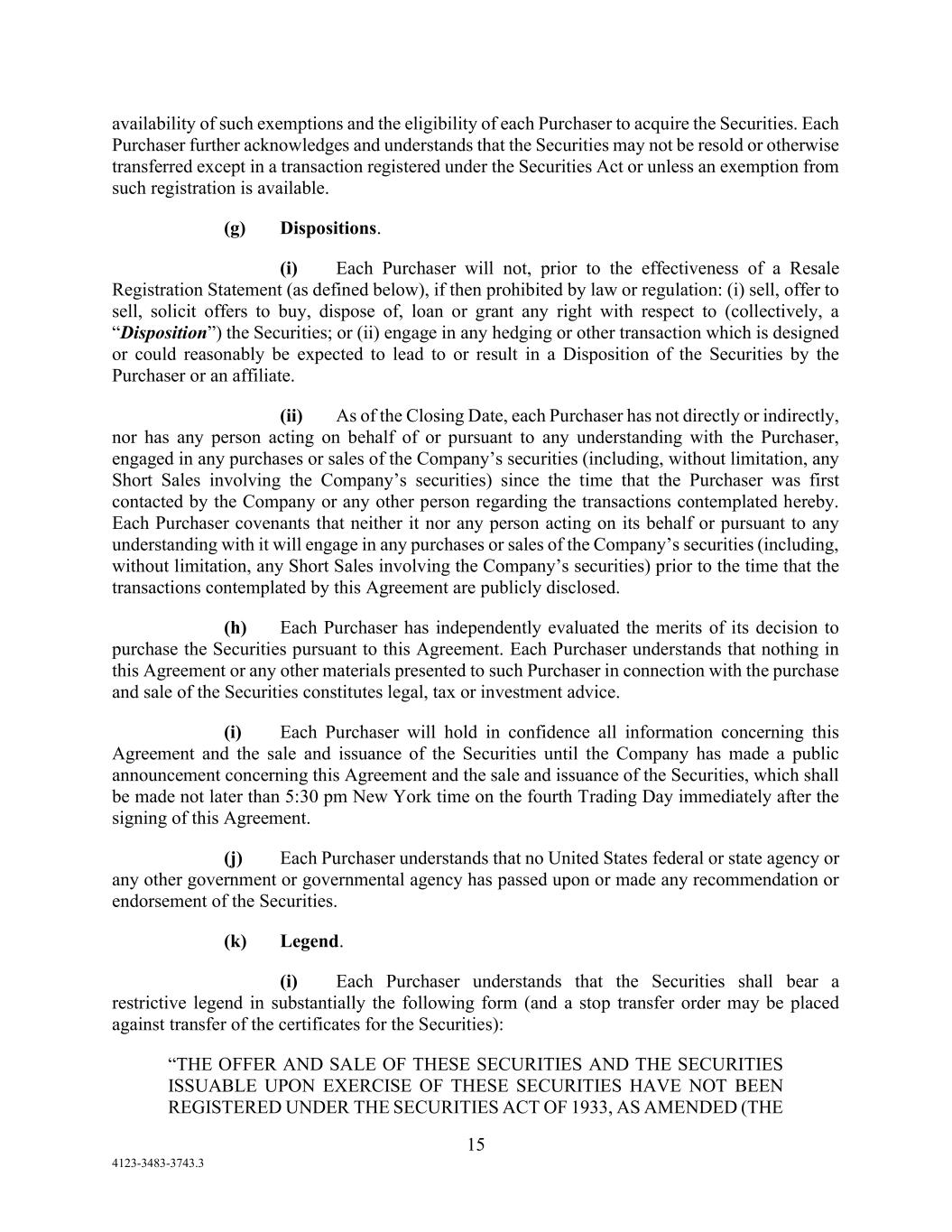 15 4123-3483-3743.3 availability of such exemptions and the eligibility of each Purchaser to acquire the Securities. Each Purchaser further acknowledges and understands that the Securities may not be resold or otherwise transferred except in a transaction registered under the Securities Act or unless an exemption from such registration is available. (g) Dispositions. (i) Each Purchaser will not, prior to the effectiveness of a Resale Registration Statement (as defined below), if then prohibited by law or regulation: (i) sell, offer to sell, solicit offers to buy, dispose of, loan or grant any right with respect to (collectively, a “Disposition”) the Securities; or (ii) engage in any hedging or other transaction which is designed or could reasonably be expected to lead to or result in a Disposition of the Securities by the Purchaser or an affiliate. (ii) As of the Closing Date, each Purchaser has not directly or indirectly, nor has any person acting on behalf of or pursuant to any understanding with the Purchaser, engaged in any purchases or sales of the Company’s securities (including, without limitation, any Short Sales involving the Company’s securities) since the time that the Purchaser was first contacted by the Company or any other person regarding the transactions contemplated hereby. Each Purchaser covenants that neither it nor any person acting on its behalf or pursuant to any understanding with it will engage in any purchases or sales of the Company’s securities (including, without limitation, any Short Sales involving the Company’s securities) prior to the time that the transactions contemplated by this Agreement are publicly disclosed. (h) Each Purchaser has independently evaluated the merits of its decision to purchase the Securities pursuant to this Agreement. Each Purchaser understands that nothing in this Agreement or any other materials presented to such Purchaser in connection with the purchase and sale of the Securities constitutes legal, tax or investment advice. (i) Each Purchaser will hold in confidence all information concerning this Agreement and the sale and issuance of the Securities until the Company has made a public announcement concerning this Agreement and the sale and issuance of the Securities, which shall be made not later than 5:30 pm New York time on the fourth Trading Day immediately after the signing of this Agreement. (j) Each Purchaser understands that no United States federal or state agency or any other government or governmental agency has passed upon or made any recommendation or endorsement of the Securities. (k) Legend. (i) Each Purchaser understands that the Securities shall bear a restrictive legend in substantially the following form (and a stop transfer order may be placed against transfer of the certificates for the Securities): “THE OFFER AND SALE OF THESE SECURITIES AND THE SECURITIES ISSUABLE UPON EXERCISE OF THESE SECURITIES HAVE NOT BEEN REGISTERED UNDER THE SECURITIES ACT OF 1933, AS AMENDED (THE