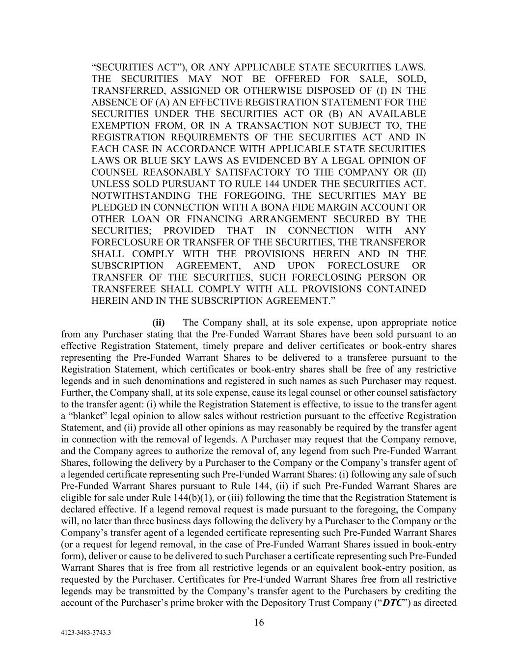 16 4123-3483-3743.3 “SECURITIES ACT”), OR ANY APPLICABLE STATE SECURITIES LAWS. THE SECURITIES MAY NOT BE OFFERED FOR SALE, SOLD, TRANSFERRED, ASSIGNED OR OTHERWISE DISPOSED OF (I) IN THE ABSENCE OF (A) AN EFFECTIVE REGISTRATION STATEMENT FOR THE SECURITIES UNDER THE SECURITIES ACT OR (B) AN AVAILABLE EXEMPTION FROM, OR IN A TRANSACTION NOT SUBJECT TO, THE REGISTRATION REQUIREMENTS OF THE SECURITIES ACT AND IN EACH CASE IN ACCORDANCE WITH APPLICABLE STATE SECURITIES LAWS OR BLUE SKY LAWS AS EVIDENCED BY A LEGAL OPINION OF COUNSEL REASONABLY SATISFACTORY TO THE COMPANY OR (II) UNLESS SOLD PURSUANT TO RULE 144 UNDER THE SECURITIES ACT. NOTWITHSTANDING THE FOREGOING, THE SECURITIES MAY BE PLEDGED IN CONNECTION WITH A BONA FIDE MARGIN ACCOUNT OR OTHER LOAN OR FINANCING ARRANGEMENT SECURED BY THE SECURITIES; PROVIDED THAT IN CONNECTION WITH ANY FORECLOSURE OR TRANSFER OF THE SECURITIES, THE TRANSFEROR SHALL COMPLY WITH THE PROVISIONS HEREIN AND IN THE SUBSCRIPTION AGREEMENT, AND UPON FORECLOSURE OR TRANSFER OF THE SECURITIES, SUCH FORECLOSING PERSON OR TRANSFEREE SHALL COMPLY WITH ALL PROVISIONS CONTAINED HEREIN AND IN THE SUBSCRIPTION AGREEMENT.” (ii) The Company shall, at its sole expense, upon appropriate notice from any Purchaser stating that the Pre-Funded Warrant Shares have been sold pursuant to an effective Registration Statement, timely prepare and deliver certificates or book-entry shares representing the Pre-Funded Warrant Shares to be delivered to a transferee pursuant to the Registration Statement, which certificates or book-entry shares shall be free of any restrictive legends and in such denominations and registered in such names as such Purchaser may request. Further, the Company shall, at its sole expense, cause its legal counsel or other counsel satisfactory to the transfer agent: (i) while the Registration Statement is effective, to issue to the transfer agent a “blanket” legal opinion to allow sales without restriction pursuant to the effective Registration Statement, and (ii) provide all other opinions as may reasonably be required by the transfer agent in connection with the removal of legends. A Purchaser may request that the Company remove, and the Company agrees to authorize the removal of, any legend from such Pre-Funded Warrant Shares, following the delivery by a Purchaser to the Company or the Company’s transfer agent of a legended certificate representing such Pre-Funded Warrant Shares: (i) following any sale of such Pre-Funded Warrant Shares pursuant to Rule 144, (ii) if such Pre-Funded Warrant Shares are eligible for sale under Rule 144(b)(1), or (iii) following the time that the Registration Statement is declared effective. If a legend removal request is made pursuant to the foregoing, the Company will, no later than three business days following the delivery by a Purchaser to the Company or the Company’s transfer agent of a legended certificate representing such Pre-Funded Warrant Shares (or a request for legend removal, in the case of Pre-Funded Warrant Shares issued in book-entry form), deliver or cause to be delivered to such Purchaser a certificate representing such Pre-Funded Warrant Shares that is free from all restrictive legends or an equivalent book-entry position, as requested by the Purchaser. Certificates for Pre-Funded Warrant Shares free from all restrictive legends may be transmitted by the Company’s transfer agent to the Purchasers by crediting the account of the Purchaser’s prime broker with the Depository Trust Company (“DTC”) as directed