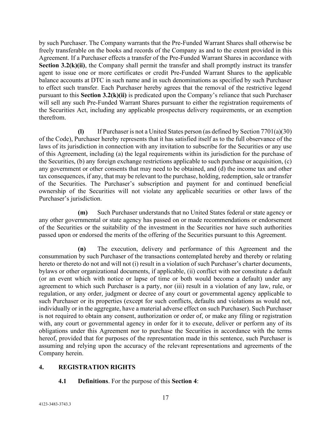 17 4123-3483-3743.3 by such Purchaser. The Company warrants that the Pre-Funded Warrant Shares shall otherwise be freely transferable on the books and records of the Company as and to the extent provided in this Agreement. If a Purchaser effects a transfer of the Pre-Funded Warrant Shares in accordance with Section 3.2(k)(ii), the Company shall permit the transfer and shall promptly instruct its transfer agent to issue one or more certificates or credit Pre-Funded Warrant Shares to the applicable balance accounts at DTC in such name and in such denominations as specified by such Purchaser to effect such transfer. Each Purchaser hereby agrees that the removal of the restrictive legend pursuant to this Section 3.2(k)(ii) is predicated upon the Company’s reliance that such Purchaser will sell any such Pre-Funded Warrant Shares pursuant to either the registration requirements of the Securities Act, including any applicable prospectus delivery requirements, or an exemption therefrom. (l) If Purchaser is not a United States person (as defined by Section 7701(a)(30) of the Code), Purchaser hereby represents that it has satisfied itself as to the full observance of the laws of its jurisdiction in connection with any invitation to subscribe for the Securities or any use of this Agreement, including (a) the legal requirements within its jurisdiction for the purchase of the Securities, (b) any foreign exchange restrictions applicable to such purchase or acquisition, (c) any government or other consents that may need to be obtained, and (d) the income tax and other tax consequences, if any, that may be relevant to the purchase, holding, redemption, sale or transfer of the Securities. The Purchaser’s subscription and payment for and continued beneficial ownership of the Securities will not violate any applicable securities or other laws of the Purchaser’s jurisdiction. (m) Such Purchaser understands that no United States federal or state agency or any other governmental or state agency has passed on or made recommendations or endorsement of the Securities or the suitability of the investment in the Securities nor have such authorities passed upon or endorsed the merits of the offering of the Securities pursuant to this Agreement. (n) The execution, delivery and performance of this Agreement and the consummation by such Purchaser of the transactions contemplated hereby and thereby or relating hereto or thereto do not and will not (i) result in a violation of such Purchaser’s charter documents, bylaws or other organizational documents, if applicable, (ii) conflict with nor constitute a default (or an event which with notice or lapse of time or both would become a default) under any agreement to which such Purchaser is a party, nor (iii) result in a violation of any law, rule, or regulation, or any order, judgment or decree of any court or governmental agency applicable to such Purchaser or its properties (except for such conflicts, defaults and violations as would not, individually or in the aggregate, have a material adverse effect on such Purchaser). Such Purchaser is not required to obtain any consent, authorization or order of, or make any filing or registration with, any court or governmental agency in order for it to execute, deliver or perform any of its obligations under this Agreement nor to purchase the Securities in accordance with the terms hereof, provided that for purposes of the representation made in this sentence, such Purchaser is assuming and relying upon the accuracy of the relevant representations and agreements of the Company herein. 4. REGISTRATION RIGHTS 4.1 Definitions. For the purpose of this Section 4: