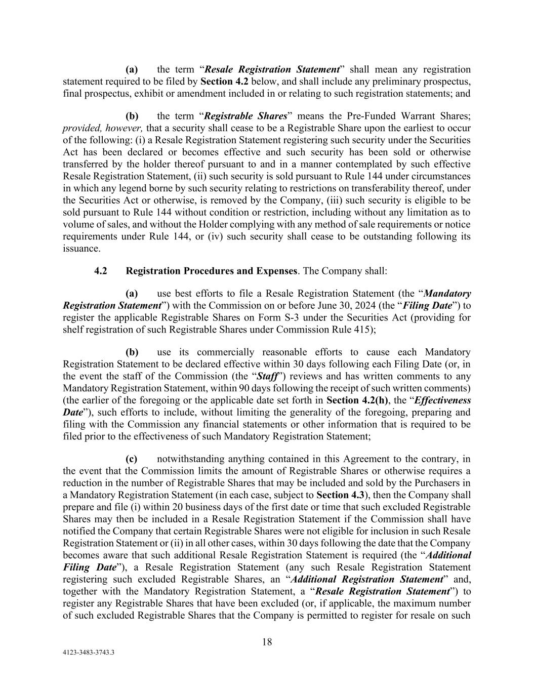 18 4123-3483-3743.3 (a) the term “Resale Registration Statement” shall mean any registration statement required to be filed by Section 4.2 below, and shall include any preliminary prospectus, final prospectus, exhibit or amendment included in or relating to such registration statements; and (b) the term “Registrable Shares” means the Pre-Funded Warrant Shares; provided, however, that a security shall cease to be a Registrable Share upon the earliest to occur of the following: (i) a Resale Registration Statement registering such security under the Securities Act has been declared or becomes effective and such security has been sold or otherwise transferred by the holder thereof pursuant to and in a manner contemplated by such effective Resale Registration Statement, (ii) such security is sold pursuant to Rule 144 under circumstances in which any legend borne by such security relating to restrictions on transferability thereof, under the Securities Act or otherwise, is removed by the Company, (iii) such security is eligible to be sold pursuant to Rule 144 without condition or restriction, including without any limitation as to volume of sales, and without the Holder complying with any method of sale requirements or notice requirements under Rule 144, or (iv) such security shall cease to be outstanding following its issuance. 4.2 Registration Procedures and Expenses. The Company shall: (a) use best efforts to file a Resale Registration Statement (the “Mandatory Registration Statement”) with the Commission on or before June 30, 2024 (the “Filing Date”) to register the applicable Registrable Shares on Form S-3 under the Securities Act (providing for shelf registration of such Registrable Shares under Commission Rule 415); (b) use its commercially reasonable efforts to cause each Mandatory Registration Statement to be declared effective within 30 days following each Filing Date (or, in the event the staff of the Commission (the “Staff”) reviews and has written comments to any Mandatory Registration Statement, within 90 days following the receipt of such written comments) (the earlier of the foregoing or the applicable date set forth in Section 4.2(h), the “Effectiveness Date”), such efforts to include, without limiting the generality of the foregoing, preparing and filing with the Commission any financial statements or other information that is required to be filed prior to the effectiveness of such Mandatory Registration Statement; (c) notwithstanding anything contained in this Agreement to the contrary, in the event that the Commission limits the amount of Registrable Shares or otherwise requires a reduction in the number of Registrable Shares that may be included and sold by the Purchasers in a Mandatory Registration Statement (in each case, subject to Section 4.3), then the Company shall prepare and file (i) within 20 business days of the first date or time that such excluded Registrable Shares may then be included in a Resale Registration Statement if the Commission shall have notified the Company that certain Registrable Shares were not eligible for inclusion in such Resale Registration Statement or (ii) in all other cases, within 30 days following the date that the Company becomes aware that such additional Resale Registration Statement is required (the “Additional Filing Date”), a Resale Registration Statement (any such Resale Registration Statement registering such excluded Registrable Shares, an “Additional Registration Statement” and, together with the Mandatory Registration Statement, a “Resale Registration Statement”) to register any Registrable Shares that have been excluded (or, if applicable, the maximum number of such excluded Registrable Shares that the Company is permitted to register for resale on such