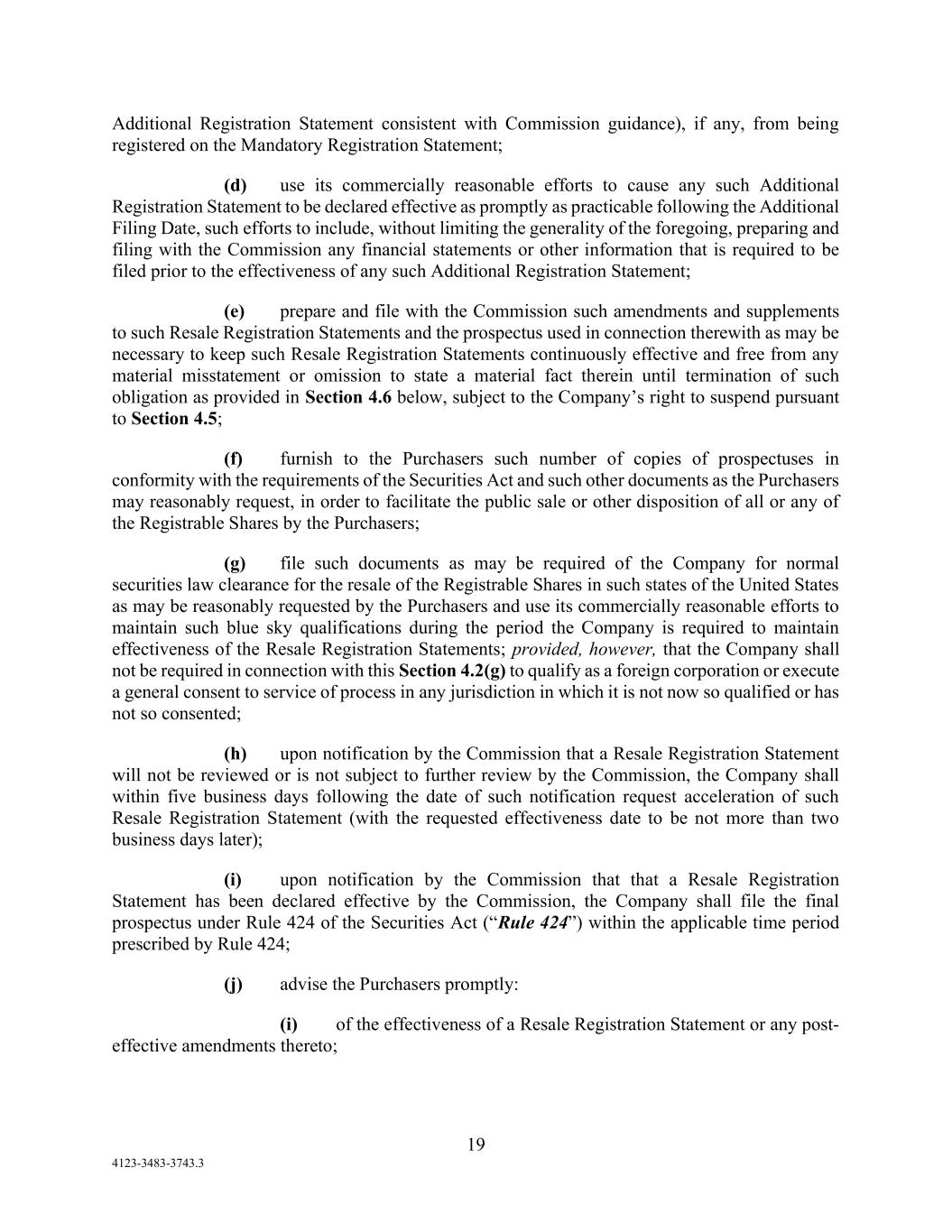 19 4123-3483-3743.3 Additional Registration Statement consistent with Commission guidance), if any, from being registered on the Mandatory Registration Statement; (d) use its commercially reasonable efforts to cause any such Additional Registration Statement to be declared effective as promptly as practicable following the Additional Filing Date, such efforts to include, without limiting the generality of the foregoing, preparing and filing with the Commission any financial statements or other information that is required to be filed prior to the effectiveness of any such Additional Registration Statement; (e) prepare and file with the Commission such amendments and supplements to such Resale Registration Statements and the prospectus used in connection therewith as may be necessary to keep such Resale Registration Statements continuously effective and free from any material misstatement or omission to state a material fact therein until termination of such obligation as provided in Section 4.6 below, subject to the Company’s right to suspend pursuant to Section 4.5; (f) furnish to the Purchasers such number of copies of prospectuses in conformity with the requirements of the Securities Act and such other documents as the Purchasers may reasonably request, in order to facilitate the public sale or other disposition of all or any of the Registrable Shares by the Purchasers; (g) file such documents as may be required of the Company for normal securities law clearance for the resale of the Registrable Shares in such states of the United States as may be reasonably requested by the Purchasers and use its commercially reasonable efforts to maintain such blue sky qualifications during the period the Company is required to maintain effectiveness of the Resale Registration Statements; provided, however, that the Company shall not be required in connection with this Section 4.2(g) to qualify as a foreign corporation or execute a general consent to service of process in any jurisdiction in which it is not now so qualified or has not so consented; (h) upon notification by the Commission that a Resale Registration Statement will not be reviewed or is not subject to further review by the Commission, the Company shall within five business days following the date of such notification request acceleration of such Resale Registration Statement (with the requested effectiveness date to be not more than two business days later); (i) upon notification by the Commission that that a Resale Registration Statement has been declared effective by the Commission, the Company shall file the final prospectus under Rule 424 of the Securities Act (“Rule 424”) within the applicable time period prescribed by Rule 424; (j) advise the Purchasers promptly: (i) of the effectiveness of a Resale Registration Statement or any post- effective amendments thereto;