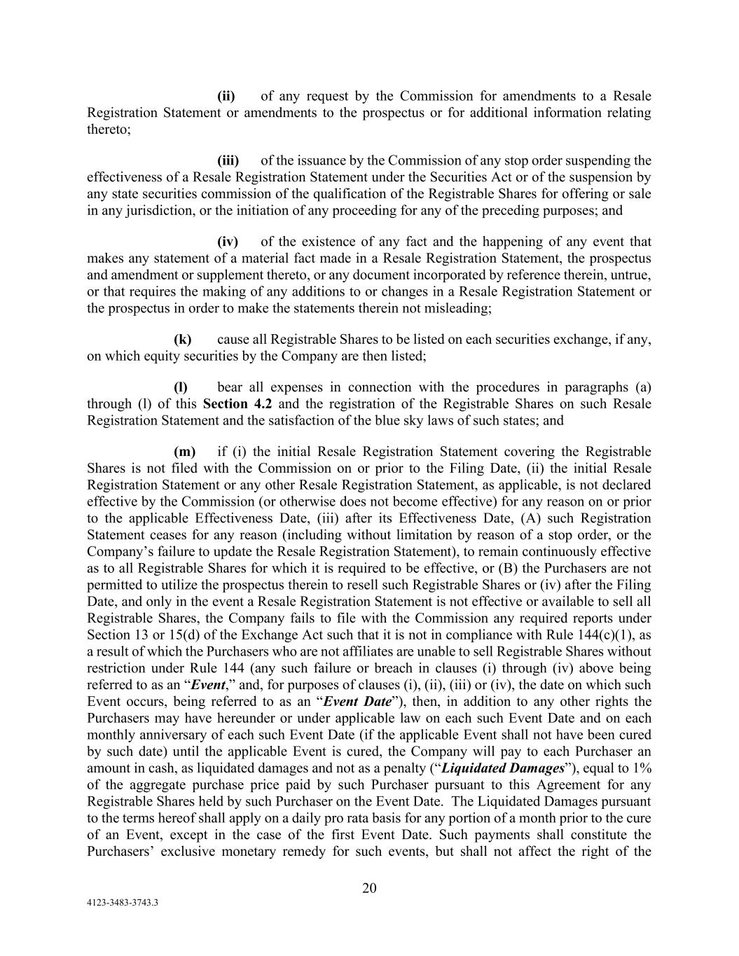 20 4123-3483-3743.3 (ii) of any request by the Commission for amendments to a Resale Registration Statement or amendments to the prospectus or for additional information relating thereto; (iii) of the issuance by the Commission of any stop order suspending the effectiveness of a Resale Registration Statement under the Securities Act or of the suspension by any state securities commission of the qualification of the Registrable Shares for offering or sale in any jurisdiction, or the initiation of any proceeding for any of the preceding purposes; and (iv) of the existence of any fact and the happening of any event that makes any statement of a material fact made in a Resale Registration Statement, the prospectus and amendment or supplement thereto, or any document incorporated by reference therein, untrue, or that requires the making of any additions to or changes in a Resale Registration Statement or the prospectus in order to make the statements therein not misleading; (k) cause all Registrable Shares to be listed on each securities exchange, if any, on which equity securities by the Company are then listed; (l) bear all expenses in connection with the procedures in paragraphs (a) through (l) of this Section 4.2 and the registration of the Registrable Shares on such Resale Registration Statement and the satisfaction of the blue sky laws of such states; and (m) if (i) the initial Resale Registration Statement covering the Registrable Shares is not filed with the Commission on or prior to the Filing Date, (ii) the initial Resale Registration Statement or any other Resale Registration Statement, as applicable, is not declared effective by the Commission (or otherwise does not become effective) for any reason on or prior to the applicable Effectiveness Date, (iii) after its Effectiveness Date, (A) such Registration Statement ceases for any reason (including without limitation by reason of a stop order, or the Company’s failure to update the Resale Registration Statement), to remain continuously effective as to all Registrable Shares for which it is required to be effective, or (B) the Purchasers are not permitted to utilize the prospectus therein to resell such Registrable Shares or (iv) after the Filing Date, and only in the event a Resale Registration Statement is not effective or available to sell all Registrable Shares, the Company fails to file with the Commission any required reports under Section 13 or 15(d) of the Exchange Act such that it is not in compliance with Rule 144(c)(1), as a result of which the Purchasers who are not affiliates are unable to sell Registrable Shares without restriction under Rule 144 (any such failure or breach in clauses (i) through (iv) above being referred to as an “Event,” and, for purposes of clauses (i), (ii), (iii) or (iv), the date on which such Event occurs, being referred to as an “Event Date”), then, in addition to any other rights the Purchasers may have hereunder or under applicable law on each such Event Date and on each monthly anniversary of each such Event Date (if the applicable Event shall not have been cured by such date) until the applicable Event is cured, the Company will pay to each Purchaser an amount in cash, as liquidated damages and not as a penalty (“Liquidated Damages”), equal to 1% of the aggregate purchase price paid by such Purchaser pursuant to this Agreement for any Registrable Shares held by such Purchaser on the Event Date. The Liquidated Damages pursuant to the terms hereof shall apply on a daily pro rata basis for any portion of a month prior to the cure of an Event, except in the case of the first Event Date. Such payments shall constitute the Purchasers’ exclusive monetary remedy for such events, but shall not affect the right of the