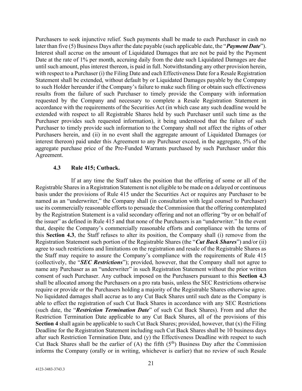 21 4123-3483-3743.3 Purchasers to seek injunctive relief. Such payments shall be made to each Purchaser in cash no later than five (5) Business Days after the date payable (such applicable date, the “Payment Date”). Interest shall accrue on the amount of Liquidated Damages that are not be paid by the Payment Date at the rate of 1% per month, accruing daily from the date such Liquidated Damages are due until such amount, plus interest thereon, is paid in full. Notwithstanding any other provision herein, with respect to a Purchaser (i) the Filing Date and each Effectiveness Date for a Resale Registration Statement shall be extended, without default by or Liquidated Damages payable by the Company to such Holder hereunder if the Company’s failure to make such filing or obtain such effectiveness results from the failure of such Purchaser to timely provide the Company with information requested by the Company and necessary to complete a Resale Registration Statement in accordance with the requirements of the Securities Act (in which case any such deadline would be extended with respect to all Registrable Shares held by such Purchaser until such time as the Purchaser provides such requested information), it being understood that the failure of such Purchaser to timely provide such information to the Company shall not affect the rights of other Purchasers herein, and (ii) in no event shall the aggregate amount of Liquidated Damages (or interest thereon) paid under this Agreement to any Purchaser exceed, in the aggregate, 5% of the aggregate purchase price of the Pre-Funded Warrants purchased by such Purchaser under this Agreement. 4.3 Rule 415; Cutback. If at any time the Staff takes the position that the offering of some or all of the Registrable Shares in a Registration Statement is not eligible to be made on a delayed or continuous basis under the provisions of Rule 415 under the Securities Act or requires any Purchaser to be named as an “underwriter,” the Company shall (in consultation with legal counsel to Purchaser) use its commercially reasonable efforts to persuade the Commission that the offering contemplated by the Registration Statement is a valid secondary offering and not an offering “by or on behalf of the issuer” as defined in Rule 415 and that none of the Purchasers is an “underwriter.” In the event that, despite the Company’s commercially reasonable efforts and compliance with the terms of this Section 4.3, the Staff refuses to alter its position, the Company shall (i) remove from the Registration Statement such portion of the Registrable Shares (the “Cut Back Shares”) and/or (ii) agree to such restrictions and limitations on the registration and resale of the Registrable Shares as the Staff may require to assure the Company’s compliance with the requirements of Rule 415 (collectively, the “SEC Restrictions”); provided, however, that the Company shall not agree to name any Purchaser as an “underwriter” in such Registration Statement without the prior written consent of such Purchaser. Any cutback imposed on the Purchasers pursuant to this Section 4.3 shall be allocated among the Purchasers on a pro rata basis, unless the SEC Restrictions otherwise require or provide or the Purchasers holding a majority of the Registrable Shares otherwise agree. No liquidated damages shall accrue as to any Cut Back Shares until such date as the Company is able to effect the registration of such Cut Back Shares in accordance with any SEC Restrictions (such date, the “Restriction Termination Date” of such Cut Back Shares). From and after the Restriction Termination Date applicable to any Cut Back Shares, all of the provisions of this Section 4 shall again be applicable to such Cut Back Shares; provided, however, that (x) the Filing Deadline for the Registration Statement including such Cut Back Shares shall be 10 business days after such Restriction Termination Date, and (y) the Effectiveness Deadline with respect to such Cut Back Shares shall be the earlier of (A) the fifth (5th) Business Day after the Commission informs the Company (orally or in writing, whichever is earlier) that no review of such Resale