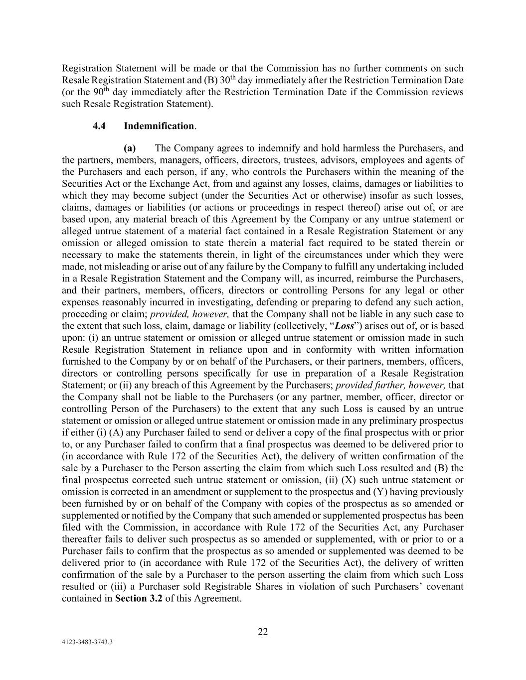 22 4123-3483-3743.3 Registration Statement will be made or that the Commission has no further comments on such Resale Registration Statement and (B) 30th day immediately after the Restriction Termination Date (or the 90th day immediately after the Restriction Termination Date if the Commission reviews such Resale Registration Statement). 4.4 Indemnification. (a) The Company agrees to indemnify and hold harmless the Purchasers, and the partners, members, managers, officers, directors, trustees, advisors, employees and agents of the Purchasers and each person, if any, who controls the Purchasers within the meaning of the Securities Act or the Exchange Act, from and against any losses, claims, damages or liabilities to which they may become subject (under the Securities Act or otherwise) insofar as such losses, claims, damages or liabilities (or actions or proceedings in respect thereof) arise out of, or are based upon, any material breach of this Agreement by the Company or any untrue statement or alleged untrue statement of a material fact contained in a Resale Registration Statement or any omission or alleged omission to state therein a material fact required to be stated therein or necessary to make the statements therein, in light of the circumstances under which they were made, not misleading or arise out of any failure by the Company to fulfill any undertaking included in a Resale Registration Statement and the Company will, as incurred, reimburse the Purchasers, and their partners, members, officers, directors or controlling Persons for any legal or other expenses reasonably incurred in investigating, defending or preparing to defend any such action, proceeding or claim; provided, however, that the Company shall not be liable in any such case to the extent that such loss, claim, damage or liability (collectively, “Loss”) arises out of, or is based upon: (i) an untrue statement or omission or alleged untrue statement or omission made in such Resale Registration Statement in reliance upon and in conformity with written information furnished to the Company by or on behalf of the Purchasers, or their partners, members, officers, directors or controlling persons specifically for use in preparation of a Resale Registration Statement; or (ii) any breach of this Agreement by the Purchasers; provided further, however, that the Company shall not be liable to the Purchasers (or any partner, member, officer, director or controlling Person of the Purchasers) to the extent that any such Loss is caused by an untrue statement or omission or alleged untrue statement or omission made in any preliminary prospectus if either (i) (A) any Purchaser failed to send or deliver a copy of the final prospectus with or prior to, or any Purchaser failed to confirm that a final prospectus was deemed to be delivered prior to (in accordance with Rule 172 of the Securities Act), the delivery of written confirmation of the sale by a Purchaser to the Person asserting the claim from which such Loss resulted and (B) the final prospectus corrected such untrue statement or omission, (ii) (X) such untrue statement or omission is corrected in an amendment or supplement to the prospectus and (Y) having previously been furnished by or on behalf of the Company with copies of the prospectus as so amended or supplemented or notified by the Company that such amended or supplemented prospectus has been filed with the Commission, in accordance with Rule 172 of the Securities Act, any Purchaser thereafter fails to deliver such prospectus as so amended or supplemented, with or prior to or a Purchaser fails to confirm that the prospectus as so amended or supplemented was deemed to be delivered prior to (in accordance with Rule 172 of the Securities Act), the delivery of written confirmation of the sale by a Purchaser to the person asserting the claim from which such Loss resulted or (iii) a Purchaser sold Registrable Shares in violation of such Purchasers’ covenant contained in Section 3.2 of this Agreement.