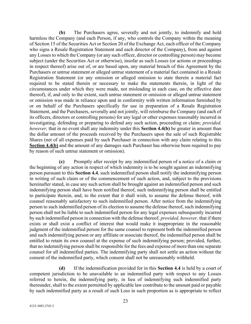 23 4123-3483-3743.3 (b) The Purchasers agree, severally and not jointly, to indemnify and hold harmless the Company (and each Person, if any, who controls the Company within the meaning of Section 15 of the Securities Act or Section 20 of the Exchange Act, each officer of the Company who signs a Resale Registration Statement and each director of the Company), from and against any Losses to which the Company (or any such officer, director or controlling person) may become subject (under the Securities Act or otherwise), insofar as such Losses (or actions or proceedings in respect thereof) arise out of, or are based upon, any material breach of this Agreement by the Purchasers or untrue statement or alleged untrue statement of a material fact contained in a Resale Registration Statement (or any omission or alleged omission to state therein a material fact required to be stated therein or necessary to make the statements therein, in light of the circumstances under which they were made, not misleading in each case, on the effective date thereof), if, and only to the extent, such untrue statement or omission or alleged untrue statement or omission was made in reliance upon and in conformity with written information furnished by or on behalf of the Purchasers specifically for use in preparation of a Resale Registration Statement, and the Purchasers, severally and not jointly, will reimburse the Company (and each of its officers, directors or controlling persons) for any legal or other expenses reasonably incurred in investigating, defending or preparing to defend any such action, proceeding or claim; provided, however, that in no event shall any indemnity under this Section 4.4(b) be greater in amount than the dollar amount of the proceeds received by the Purchasers upon the sale of such Registrable Shares (net of all expenses paid by such Purchaser in connection with any claim relating to this Section 4.4(b) and the amount of any damages such Purchaser has otherwise been required to pay by reason of such untrue statement or omission). (c) Promptly after receipt by any indemnified person of a notice of a claim or the beginning of any action in respect of which indemnity is to be sought against an indemnifying person pursuant to this Section 4.4, such indemnified person shall notify the indemnifying person in writing of such claim or of the commencement of such action, and, subject to the provisions hereinafter stated, in case any such action shall be brought against an indemnified person and such indemnifying person shall have been notified thereof, such indemnifying person shall be entitled to participate therein, and, to the extent that it shall wish, to assume the defense thereof, with counsel reasonably satisfactory to such indemnified person. After notice from the indemnifying person to such indemnified person of its election to assume the defense thereof, such indemnifying person shall not be liable to such indemnified person for any legal expenses subsequently incurred by such indemnified person in connection with the defense thereof; provided, however, that if there exists or shall exist a conflict of interest that would make it inappropriate in the reasonable judgment of the indemnified person for the same counsel to represent both the indemnified person and such indemnifying person or any affiliate or associate thereof, the indemnified person shall be entitled to retain its own counsel at the expense of such indemnifying person; provided, further, that no indemnifying person shall be responsible for the fees and expense of more than one separate counsel for all indemnified parties. The indemnifying party shall not settle an action without the consent of the indemnified party, which consent shall not be unreasonably withheld. (d) If the indemnification provided for in this Section 4.4 is held by a court of competent jurisdiction to be unavailable to an indemnified party with respect to any Losses referred to herein, the indemnifying party, in lieu of indemnifying such indemnified party thereunder, shall to the extent permitted by applicable law contribute to the amount paid or payable by such indemnified party as a result of such Loss in such proportion as is appropriate to reflect