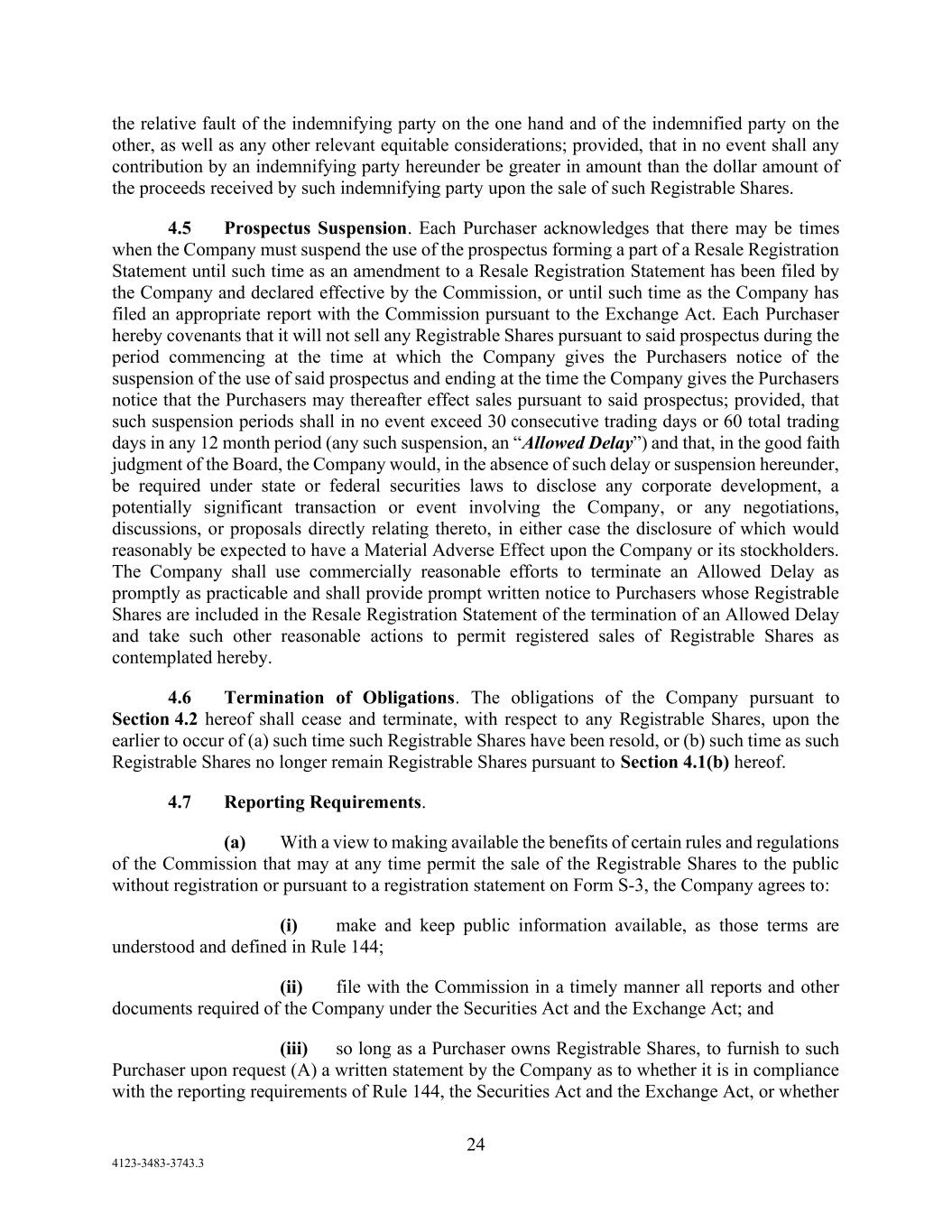 24 4123-3483-3743.3 the relative fault of the indemnifying party on the one hand and of the indemnified party on the other, as well as any other relevant equitable considerations; provided, that in no event shall any contribution by an indemnifying party hereunder be greater in amount than the dollar amount of the proceeds received by such indemnifying party upon the sale of such Registrable Shares. 4.5 Prospectus Suspension. Each Purchaser acknowledges that there may be times when the Company must suspend the use of the prospectus forming a part of a Resale Registration Statement until such time as an amendment to a Resale Registration Statement has been filed by the Company and declared effective by the Commission, or until such time as the Company has filed an appropriate report with the Commission pursuant to the Exchange Act. Each Purchaser hereby covenants that it will not sell any Registrable Shares pursuant to said prospectus during the period commencing at the time at which the Company gives the Purchasers notice of the suspension of the use of said prospectus and ending at the time the Company gives the Purchasers notice that the Purchasers may thereafter effect sales pursuant to said prospectus; provided, that such suspension periods shall in no event exceed 30 consecutive trading days or 60 total trading days in any 12 month period (any such suspension, an “Allowed Delay”) and that, in the good faith judgment of the Board, the Company would, in the absence of such delay or suspension hereunder, be required under state or federal securities laws to disclose any corporate development, a potentially significant transaction or event involving the Company, or any negotiations, discussions, or proposals directly relating thereto, in either case the disclosure of which would reasonably be expected to have a Material Adverse Effect upon the Company or its stockholders. The Company shall use commercially reasonable efforts to terminate an Allowed Delay as promptly as practicable and shall provide prompt written notice to Purchasers whose Registrable Shares are included in the Resale Registration Statement of the termination of an Allowed Delay and take such other reasonable actions to permit registered sales of Registrable Shares as contemplated hereby. 4.6 Termination of Obligations. The obligations of the Company pursuant to Section 4.2 hereof shall cease and terminate, with respect to any Registrable Shares, upon the earlier to occur of (a) such time such Registrable Shares have been resold, or (b) such time as such Registrable Shares no longer remain Registrable Shares pursuant to Section 4.1(b) hereof. 4.7 Reporting Requirements. (a) With a view to making available the benefits of certain rules and regulations of the Commission that may at any time permit the sale of the Registrable Shares to the public without registration or pursuant to a registration statement on Form S-3, the Company agrees to: (i) make and keep public information available, as those terms are understood and defined in Rule 144; (ii) file with the Commission in a timely manner all reports and other documents required of the Company under the Securities Act and the Exchange Act; and (iii) so long as a Purchaser owns Registrable Shares, to furnish to such Purchaser upon request (A) a written statement by the Company as to whether it is in compliance with the reporting requirements of Rule 144, the Securities Act and the Exchange Act, or whether