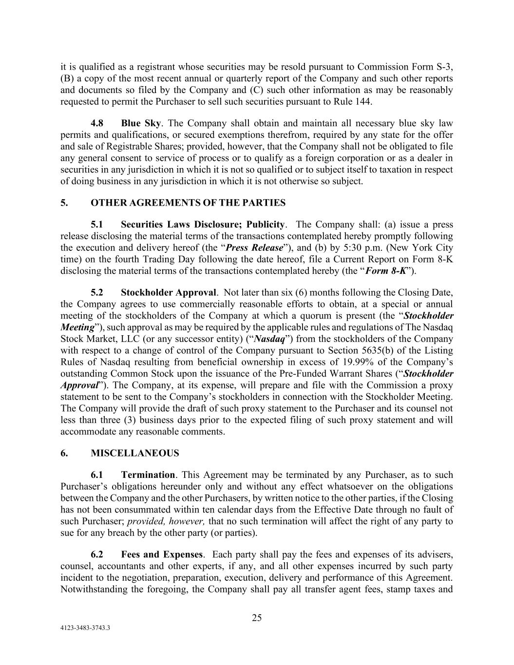 25 4123-3483-3743.3 it is qualified as a registrant whose securities may be resold pursuant to Commission Form S-3, (B) a copy of the most recent annual or quarterly report of the Company and such other reports and documents so filed by the Company and (C) such other information as may be reasonably requested to permit the Purchaser to sell such securities pursuant to Rule 144. 4.8 Blue Sky. The Company shall obtain and maintain all necessary blue sky law permits and qualifications, or secured exemptions therefrom, required by any state for the offer and sale of Registrable Shares; provided, however, that the Company shall not be obligated to file any general consent to service of process or to qualify as a foreign corporation or as a dealer in securities in any jurisdiction in which it is not so qualified or to subject itself to taxation in respect of doing business in any jurisdiction in which it is not otherwise so subject. 5. OTHER AGREEMENTS OF THE PARTIES 5.1 Securities Laws Disclosure; Publicity. The Company shall: (a) issue a press release disclosing the material terms of the transactions contemplated hereby promptly following the execution and delivery hereof (the “Press Release”), and (b) by 5:30 p.m. (New York City time) on the fourth Trading Day following the date hereof, file a Current Report on Form 8-K disclosing the material terms of the transactions contemplated hereby (the “Form 8-K”). 5.2 Stockholder Approval. Not later than six (6) months following the Closing Date, the Company agrees to use commercially reasonable efforts to obtain, at a special or annual meeting of the stockholders of the Company at which a quorum is present (the “Stockholder Meeting”), such approval as may be required by the applicable rules and regulations of The Nasdaq Stock Market, LLC (or any successor entity) (“Nasdaq”) from the stockholders of the Company with respect to a change of control of the Company pursuant to Section 5635(b) of the Listing Rules of Nasdaq resulting from beneficial ownership in excess of 19.99% of the Company’s outstanding Common Stock upon the issuance of the Pre-Funded Warrant Shares (“Stockholder Approval”). The Company, at its expense, will prepare and file with the Commission a proxy statement to be sent to the Company’s stockholders in connection with the Stockholder Meeting. The Company will provide the draft of such proxy statement to the Purchaser and its counsel not less than three (3) business days prior to the expected filing of such proxy statement and will accommodate any reasonable comments. 6. MISCELLANEOUS 6.1 Termination. This Agreement may be terminated by any Purchaser, as to such Purchaser’s obligations hereunder only and without any effect whatsoever on the obligations between the Company and the other Purchasers, by written notice to the other parties, if the Closing has not been consummated within ten calendar days from the Effective Date through no fault of such Purchaser; provided, however, that no such termination will affect the right of any party to sue for any breach by the other party (or parties). 6.2 Fees and Expenses. Each party shall pay the fees and expenses of its advisers, counsel, accountants and other experts, if any, and all other expenses incurred by such party incident to the negotiation, preparation, execution, delivery and performance of this Agreement. Notwithstanding the foregoing, the Company shall pay all transfer agent fees, stamp taxes and