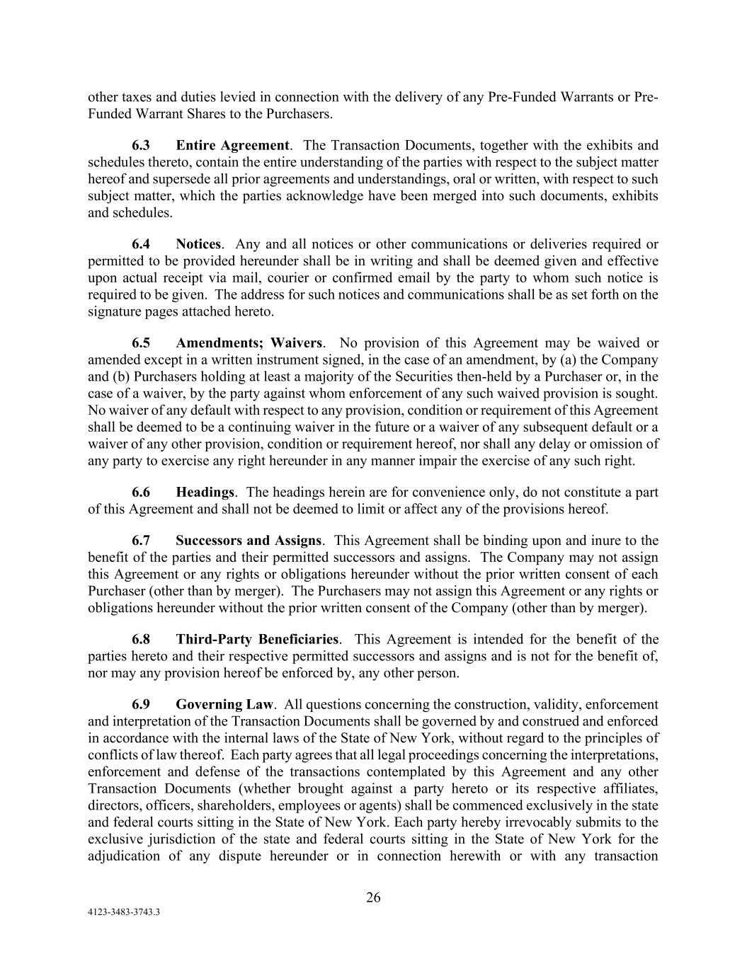 26 4123-3483-3743.3 other taxes and duties levied in connection with the delivery of any Pre-Funded Warrants or Pre- Funded Warrant Shares to the Purchasers. 6.3 Entire Agreement. The Transaction Documents, together with the exhibits and schedules thereto, contain the entire understanding of the parties with respect to the subject matter hereof and supersede all prior agreements and understandings, oral or written, with respect to such subject matter, which the parties acknowledge have been merged into such documents, exhibits and schedules. 6.4 Notices. Any and all notices or other communications or deliveries required or permitted to be provided hereunder shall be in writing and shall be deemed given and effective upon actual receipt via mail, courier or confirmed email by the party to whom such notice is required to be given. The address for such notices and communications shall be as set forth on the signature pages attached hereto. 6.5 Amendments; Waivers. No provision of this Agreement may be waived or amended except in a written instrument signed, in the case of an amendment, by (a) the Company and (b) Purchasers holding at least a majority of the Securities then-held by a Purchaser or, in the case of a waiver, by the party against whom enforcement of any such waived provision is sought. No waiver of any default with respect to any provision, condition or requirement of this Agreement shall be deemed to be a continuing waiver in the future or a waiver of any subsequent default or a waiver of any other provision, condition or requirement hereof, nor shall any delay or omission of any party to exercise any right hereunder in any manner impair the exercise of any such right. 6.6 Headings. The headings herein are for convenience only, do not constitute a part of this Agreement and shall not be deemed to limit or affect any of the provisions hereof. 6.7 Successors and Assigns. This Agreement shall be binding upon and inure to the benefit of the parties and their permitted successors and assigns. The Company may not assign this Agreement or any rights or obligations hereunder without the prior written consent of each Purchaser (other than by merger). The Purchasers may not assign this Agreement or any rights or obligations hereunder without the prior written consent of the Company (other than by merger). 6.8 Third-Party Beneficiaries. This Agreement is intended for the benefit of the parties hereto and their respective permitted successors and assigns and is not for the benefit of, nor may any provision hereof be enforced by, any other person. 6.9 Governing Law. All questions concerning the construction, validity, enforcement and interpretation of the Transaction Documents shall be governed by and construed and enforced in accordance with the internal laws of the State of New York, without regard to the principles of conflicts of law thereof. Each party agrees that all legal proceedings concerning the interpretations, enforcement and defense of the transactions contemplated by this Agreement and any other Transaction Documents (whether brought against a party hereto or its respective affiliates, directors, officers, shareholders, employees or agents) shall be commenced exclusively in the state and federal courts sitting in the State of New York. Each party hereby irrevocably submits to the exclusive jurisdiction of the state and federal courts sitting in the State of New York for the adjudication of any dispute hereunder or in connection herewith or with any transaction