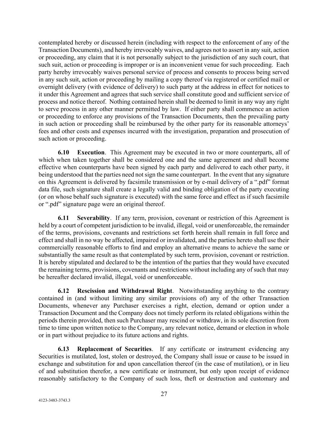 27 4123-3483-3743.3 contemplated hereby or discussed herein (including with respect to the enforcement of any of the Transaction Documents), and hereby irrevocably waives, and agrees not to assert in any suit, action or proceeding, any claim that it is not personally subject to the jurisdiction of any such court, that such suit, action or proceeding is improper or is an inconvenient venue for such proceeding. Each party hereby irrevocably waives personal service of process and consents to process being served in any such suit, action or proceeding by mailing a copy thereof via registered or certified mail or overnight delivery (with evidence of delivery) to such party at the address in effect for notices to it under this Agreement and agrees that such service shall constitute good and sufficient service of process and notice thereof. Nothing contained herein shall be deemed to limit in any way any right to serve process in any other manner permitted by law. If either party shall commence an action or proceeding to enforce any provisions of the Transaction Documents, then the prevailing party in such action or proceeding shall be reimbursed by the other party for its reasonable attorneys’ fees and other costs and expenses incurred with the investigation, preparation and prosecution of such action or proceeding. 6.10 Execution. This Agreement may be executed in two or more counterparts, all of which when taken together shall be considered one and the same agreement and shall become effective when counterparts have been signed by each party and delivered to each other party, it being understood that the parties need not sign the same counterpart. In the event that any signature on this Agreement is delivered by facsimile transmission or by e-mail delivery of a “.pdf” format data file, such signature shall create a legally valid and binding obligation of the party executing (or on whose behalf such signature is executed) with the same force and effect as if such facsimile or “.pdf” signature page were an original thereof. 6.11 Severability. If any term, provision, covenant or restriction of this Agreement is held by a court of competent jurisdiction to be invalid, illegal, void or unenforceable, the remainder of the terms, provisions, covenants and restrictions set forth herein shall remain in full force and effect and shall in no way be affected, impaired or invalidated, and the parties hereto shall use their commercially reasonable efforts to find and employ an alternative means to achieve the same or substantially the same result as that contemplated by such term, provision, covenant or restriction. It is hereby stipulated and declared to be the intention of the parties that they would have executed the remaining terms, provisions, covenants and restrictions without including any of such that may be hereafter declared invalid, illegal, void or unenforceable. 6.12 Rescission and Withdrawal Right. Notwithstanding anything to the contrary contained in (and without limiting any similar provisions of) any of the other Transaction Documents, whenever any Purchaser exercises a right, election, demand or option under a Transaction Document and the Company does not timely perform its related obligations within the periods therein provided, then such Purchaser may rescind or withdraw, in its sole discretion from time to time upon written notice to the Company, any relevant notice, demand or election in whole or in part without prejudice to its future actions and rights. 6.13 Replacement of Securities. If any certificate or instrument evidencing any Securities is mutilated, lost, stolen or destroyed, the Company shall issue or cause to be issued in exchange and substitution for and upon cancellation thereof (in the case of mutilation), or in lieu of and substitution therefor, a new certificate or instrument, but only upon receipt of evidence reasonably satisfactory to the Company of such loss, theft or destruction and customary and