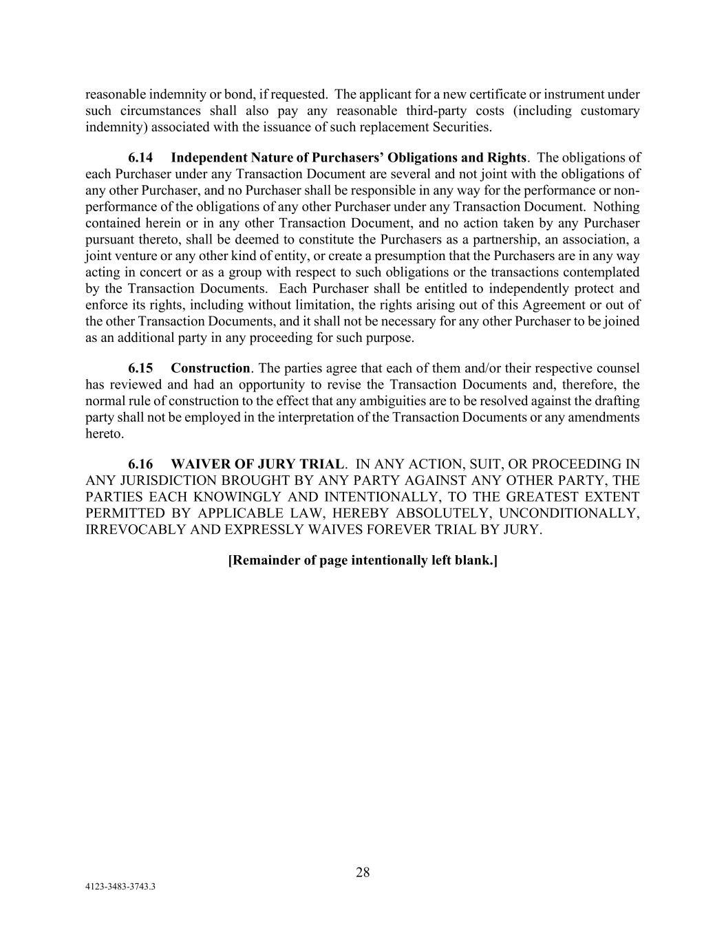 28 4123-3483-3743.3 reasonable indemnity or bond, if requested. The applicant for a new certificate or instrument under such circumstances shall also pay any reasonable third-party costs (including customary indemnity) associated with the issuance of such replacement Securities. 6.14 Independent Nature of Purchasers’ Obligations and Rights. The obligations of each Purchaser under any Transaction Document are several and not joint with the obligations of any other Purchaser, and no Purchaser shall be responsible in any way for the performance or non- performance of the obligations of any other Purchaser under any Transaction Document. Nothing contained herein or in any other Transaction Document, and no action taken by any Purchaser pursuant thereto, shall be deemed to constitute the Purchasers as a partnership, an association, a joint venture or any other kind of entity, or create a presumption that the Purchasers are in any way acting in concert or as a group with respect to such obligations or the transactions contemplated by the Transaction Documents. Each Purchaser shall be entitled to independently protect and enforce its rights, including without limitation, the rights arising out of this Agreement or out of the other Transaction Documents, and it shall not be necessary for any other Purchaser to be joined as an additional party in any proceeding for such purpose. 6.15 Construction. The parties agree that each of them and/or their respective counsel has reviewed and had an opportunity to revise the Transaction Documents and, therefore, the normal rule of construction to the effect that any ambiguities are to be resolved against the drafting party shall not be employed in the interpretation of the Transaction Documents or any amendments hereto. 6.16 WAIVER OF JURY TRIAL. IN ANY ACTION, SUIT, OR PROCEEDING IN ANY JURISDICTION BROUGHT BY ANY PARTY AGAINST ANY OTHER PARTY, THE PARTIES EACH KNOWINGLY AND INTENTIONALLY, TO THE GREATEST EXTENT PERMITTED BY APPLICABLE LAW, HEREBY ABSOLUTELY, UNCONDITIONALLY, IRREVOCABLY AND EXPRESSLY WAIVES FOREVER TRIAL BY JURY. [Remainder of page intentionally left blank.]