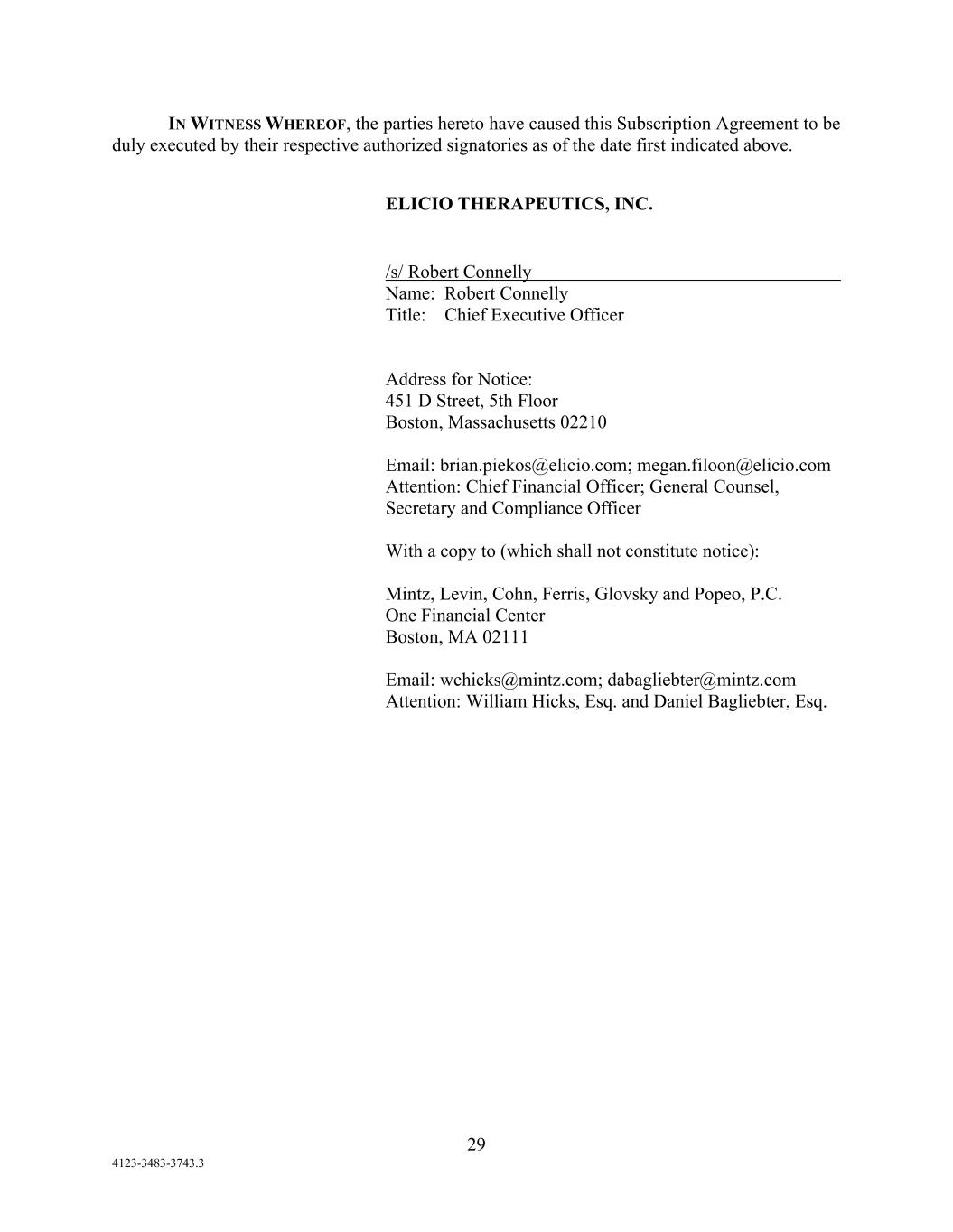 29 4123-3483-3743.3 IN WITNESS WHEREOF, the parties hereto have caused this Subscription Agreement to be duly executed by their respective authorized signatories as of the date first indicated above. ELICIO THERAPEUTICS, INC. /s/ Robert Connelly Name: Robert Connelly Title: Chief Executive Officer Address for Notice: 451 D Street, 5th Floor Boston, Massachusetts 02210 Email: brian.piekos@elicio.com; megan.filoon@elicio.com Attention: Chief Financial Officer; General Counsel, Secretary and Compliance Officer With a copy to (which shall not constitute notice): Mintz, Levin, Cohn, Ferris, Glovsky and Popeo, P.C. One Financial Center Boston, MA 02111 Email: wchicks@mintz.com; dabagliebter@mintz.com Attention: William Hicks, Esq. and Daniel Bagliebter, Esq.