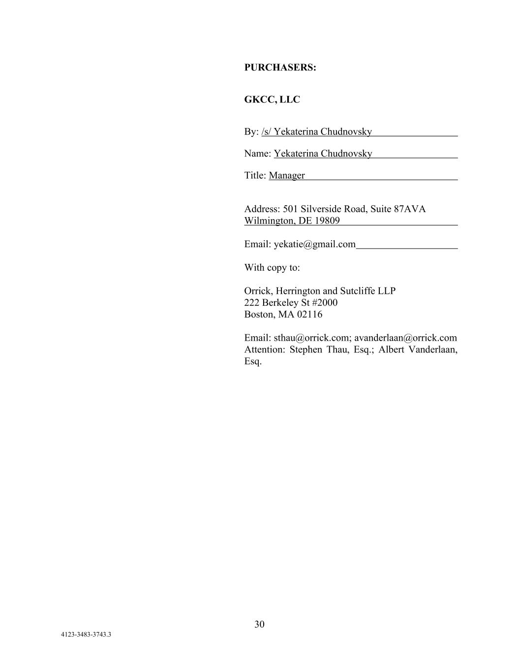 30 4123-3483-3743.3 PURCHASERS: GKCC, LLC By: /s/ Yekaterina Chudnovsky Name: Yekaterina Chudnovsky Title: Manager Address: 501 Silverside Road, Suite 87AVA Wilmington, DE 19809 Email: yekatie@gmail.com With copy to: Orrick, Herrington and Sutcliffe LLP 222 Berkeley St #2000 Boston, MA 02116 Email: sthau@orrick.com; avanderlaan@orrick.com Attention: Stephen Thau, Esq.; Albert Vanderlaan, Esq.