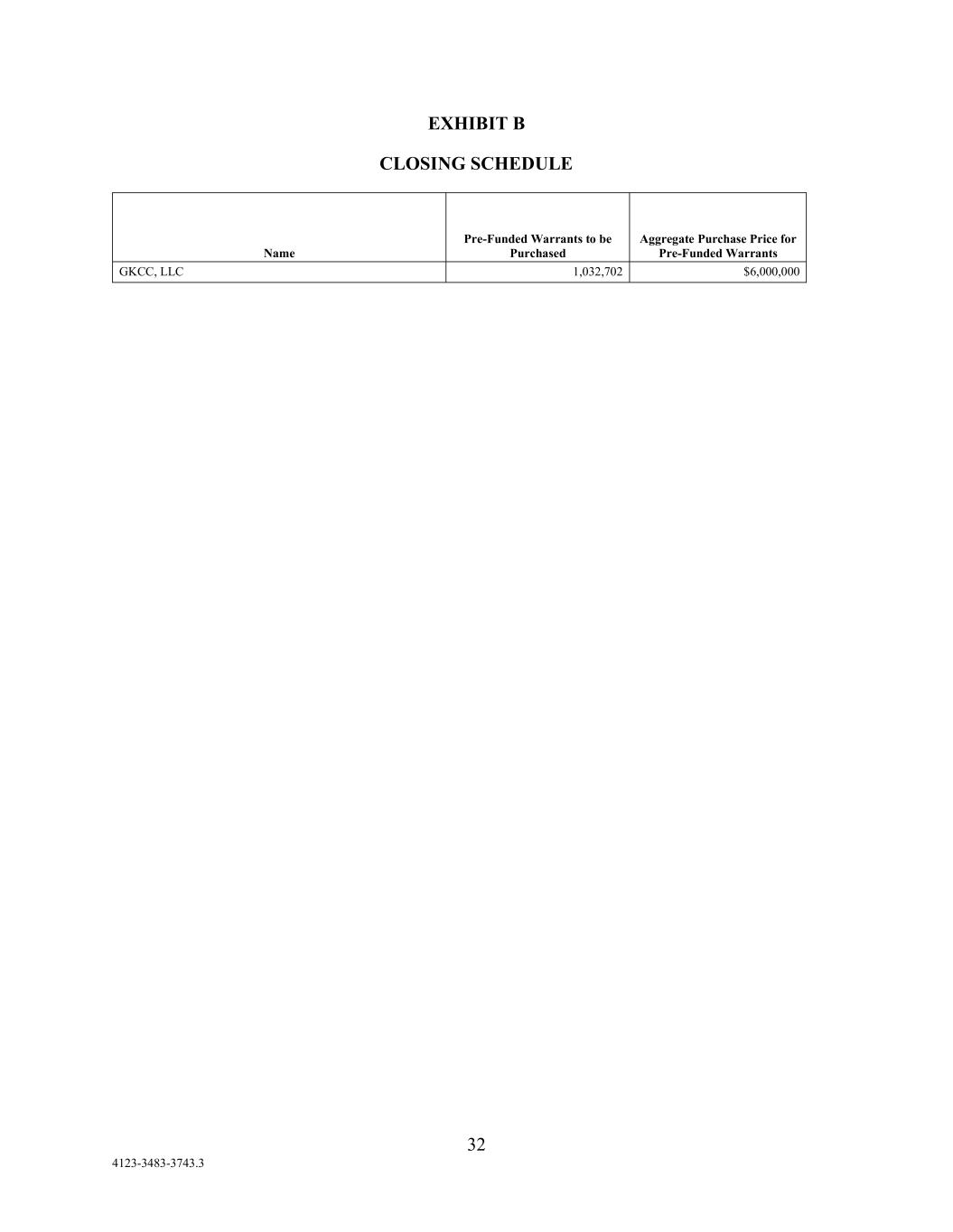 32 4123-3483-3743.3 EXHIBIT B CLOSING SCHEDULE Name Pre-Funded Warrants to be Purchased Aggregate Purchase Price for Pre-Funded Warrants GKCC, LLC 1,032,702 $6,000,000