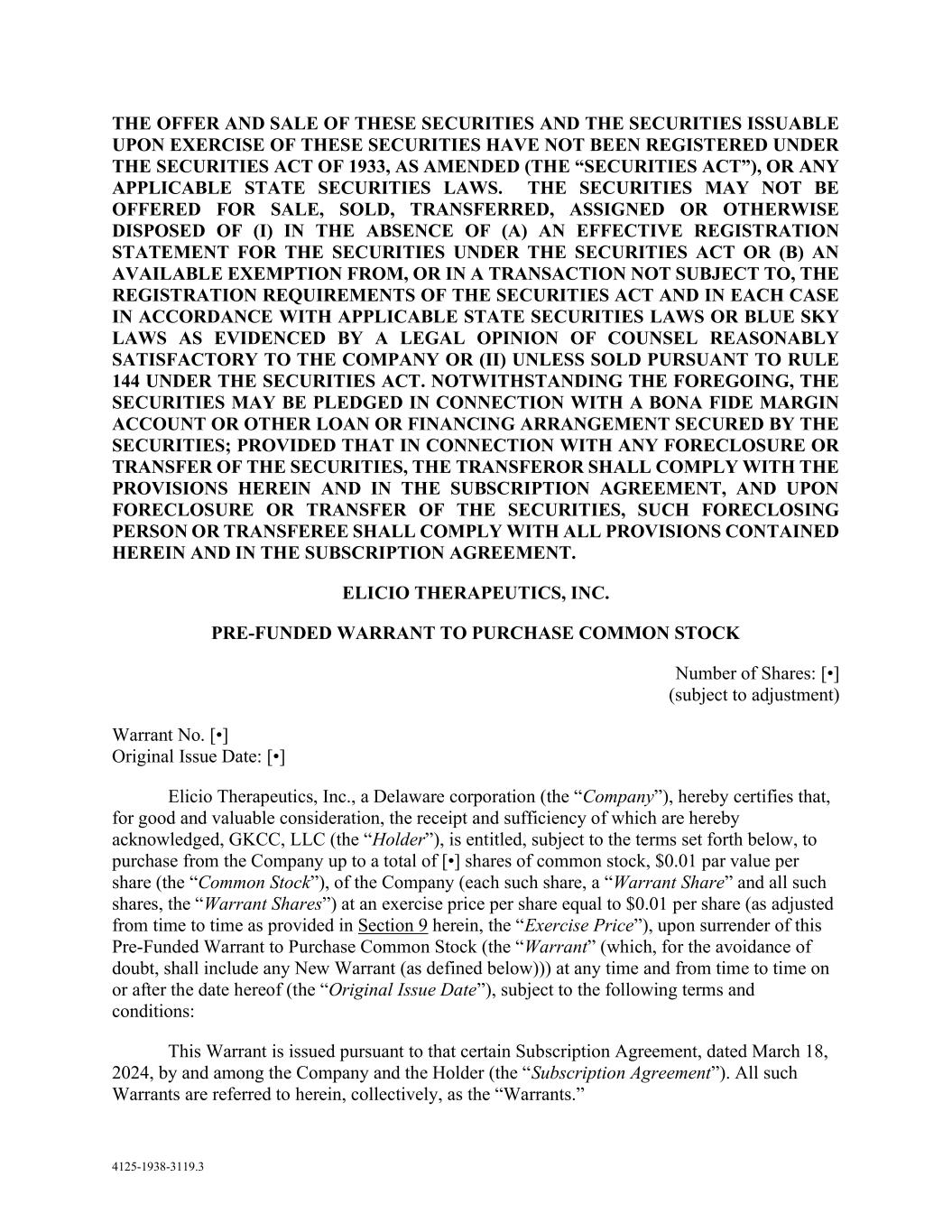 4125-1938-3119.3 THE OFFER AND SALE OF THESE SECURITIES AND THE SECURITIES ISSUABLE UPON EXERCISE OF THESE SECURITIES HAVE NOT BEEN REGISTERED UNDER THE SECURITIES ACT OF 1933, AS AMENDED (THE “SECURITIES ACT”), OR ANY APPLICABLE STATE SECURITIES LAWS. THE SECURITIES MAY NOT BE OFFERED FOR SALE, SOLD, TRANSFERRED, ASSIGNED OR OTHERWISE DISPOSED OF (I) IN THE ABSENCE OF (A) AN EFFECTIVE REGISTRATION STATEMENT FOR THE SECURITIES UNDER THE SECURITIES ACT OR (B) AN AVAILABLE EXEMPTION FROM, OR IN A TRANSACTION NOT SUBJECT TO, THE REGISTRATION REQUIREMENTS OF THE SECURITIES ACT AND IN EACH CASE IN ACCORDANCE WITH APPLICABLE STATE SECURITIES LAWS OR BLUE SKY LAWS AS EVIDENCED BY A LEGAL OPINION OF COUNSEL REASONABLY SATISFACTORY TO THE COMPANY OR (II) UNLESS SOLD PURSUANT TO RULE 144 UNDER THE SECURITIES ACT. NOTWITHSTANDING THE FOREGOING, THE SECURITIES MAY BE PLEDGED IN CONNECTION WITH A BONA FIDE MARGIN ACCOUNT OR OTHER LOAN OR FINANCING ARRANGEMENT SECURED BY THE SECURITIES; PROVIDED THAT IN CONNECTION WITH ANY FORECLOSURE OR TRANSFER OF THE SECURITIES, THE TRANSFEROR SHALL COMPLY WITH THE PROVISIONS HEREIN AND IN THE SUBSCRIPTION AGREEMENT, AND UPON FORECLOSURE OR TRANSFER OF THE SECURITIES, SUCH FORECLOSING PERSON OR TRANSFEREE SHALL COMPLY WITH ALL PROVISIONS CONTAINED HEREIN AND IN THE SUBSCRIPTION AGREEMENT. ELICIO THERAPEUTICS, INC. PRE-FUNDED WARRANT TO PURCHASE COMMON STOCK Number of Shares: [•] (subject to adjustment) Warrant No. [•] Original Issue Date: [•] Elicio Therapeutics, Inc., a Delaware corporation (the “Company”), hereby certifies that, for good and valuable consideration, the receipt and sufficiency of which are hereby acknowledged, GKCC, LLC (the “Holder”), is entitled, subject to the terms set forth below, to purchase from the Company up to a total of [•] shares of common stock, $0.01 par value per share (the “Common Stock”), of the Company (each such share, a “Warrant Share” and all such shares, the “Warrant Shares”) at an exercise price per share equal to $0.01 per share (as adjusted from time to time as provided in Section 9 herein, the “Exercise Price”), upon surrender of this Pre-Funded Warrant to Purchase Common Stock (the “Warrant” (which, for the avoidance of doubt, shall include any New Warrant (as defined below))) at any time and from time to time on or after the date hereof (the “Original Issue Date”), subject to the following terms and conditions: This Warrant is issued pursuant to that certain Subscription Agreement, dated March 18, 2024, by and among the Company and the Holder (the “Subscription Agreement”). All such Warrants are referred to herein, collectively, as the “Warrants.”