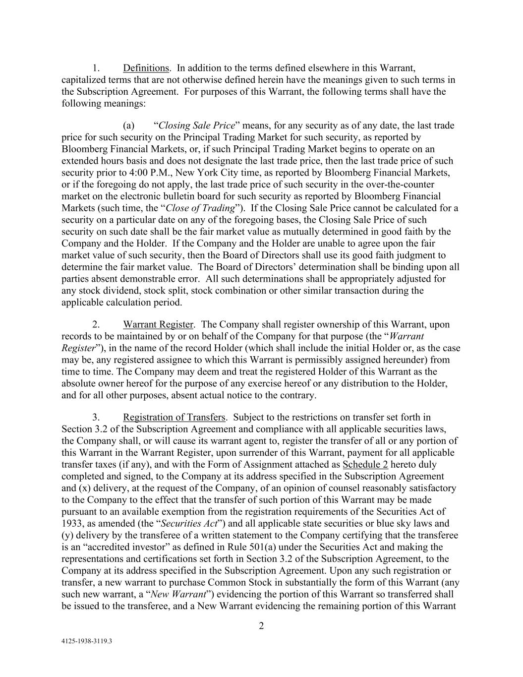 2 4125-1938-3119.3 1. Definitions. In addition to the terms defined elsewhere in this Warrant, capitalized terms that are not otherwise defined herein have the meanings given to such terms in the Subscription Agreement. For purposes of this Warrant, the following terms shall have the following meanings: (a) “Closing Sale Price” means, for any security as of any date, the last trade price for such security on the Principal Trading Market for such security, as reported by Bloomberg Financial Markets, or, if such Principal Trading Market begins to operate on an extended hours basis and does not designate the last trade price, then the last trade price of such security prior to 4:00 P.M., New York City time, as reported by Bloomberg Financial Markets, or if the foregoing do not apply, the last trade price of such security in the over-the-counter market on the electronic bulletin board for such security as reported by Bloomberg Financial Markets (such time, the “Close of Trading”). If the Closing Sale Price cannot be calculated for a security on a particular date on any of the foregoing bases, the Closing Sale Price of such security on such date shall be the fair market value as mutually determined in good faith by the Company and the Holder. If the Company and the Holder are unable to agree upon the fair market value of such security, then the Board of Directors shall use its good faith judgment to determine the fair market value. The Board of Directors’ determination shall be binding upon all parties absent demonstrable error. All such determinations shall be appropriately adjusted for any stock dividend, stock split, stock combination or other similar transaction during the applicable calculation period. 2. Warrant Register. The Company shall register ownership of this Warrant, upon records to be maintained by or on behalf of the Company for that purpose (the “Warrant Register”), in the name of the record Holder (which shall include the initial Holder or, as the case may be, any registered assignee to which this Warrant is permissibly assigned hereunder) from time to time. The Company may deem and treat the registered Holder of this Warrant as the absolute owner hereof for the purpose of any exercise hereof or any distribution to the Holder, and for all other purposes, absent actual notice to the contrary. 3. Registration of Transfers. Subject to the restrictions on transfer set forth in Section 3.2 of the Subscription Agreement and compliance with all applicable securities laws, the Company shall, or will cause its warrant agent to, register the transfer of all or any portion of this Warrant in the Warrant Register, upon surrender of this Warrant, payment for all applicable transfer taxes (if any), and with the Form of Assignment attached as Schedule 2 hereto duly completed and signed, to the Company at its address specified in the Subscription Agreement and (x) delivery, at the request of the Company, of an opinion of counsel reasonably satisfactory to the Company to the effect that the transfer of such portion of this Warrant may be made pursuant to an available exemption from the registration requirements of the Securities Act of 1933, as amended (the “Securities Act”) and all applicable state securities or blue sky laws and (y) delivery by the transferee of a written statement to the Company certifying that the transferee is an “accredited investor” as defined in Rule 501(a) under the Securities Act and making the representations and certifications set forth in Section 3.2 of the Subscription Agreement, to the Company at its address specified in the Subscription Agreement. Upon any such registration or transfer, a new warrant to purchase Common Stock in substantially the form of this Warrant (any such new warrant, a “New Warrant”) evidencing the portion of this Warrant so transferred shall be issued to the transferee, and a New Warrant evidencing the remaining portion of this Warrant