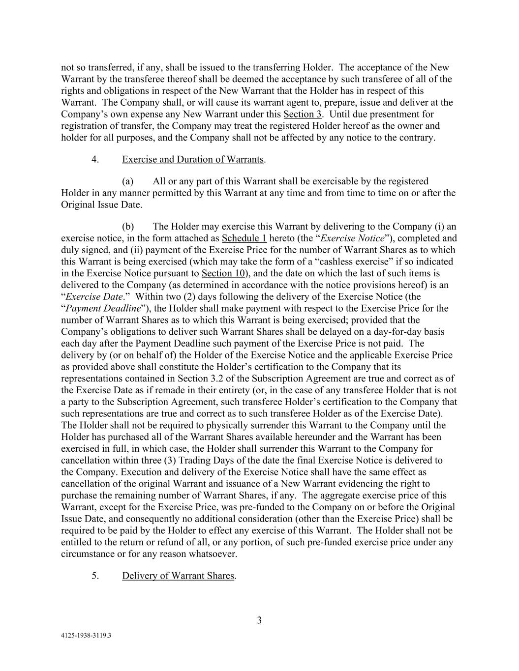 3 4125-1938-3119.3 not so transferred, if any, shall be issued to the transferring Holder. The acceptance of the New Warrant by the transferee thereof shall be deemed the acceptance by such transferee of all of the rights and obligations in respect of the New Warrant that the Holder has in respect of this Warrant. The Company shall, or will cause its warrant agent to, prepare, issue and deliver at the Company’s own expense any New Warrant under this Section 3. Until due presentment for registration of transfer, the Company may treat the registered Holder hereof as the owner and holder for all purposes, and the Company shall not be affected by any notice to the contrary. 4. Exercise and Duration of Warrants. (a) All or any part of this Warrant shall be exercisable by the registered Holder in any manner permitted by this Warrant at any time and from time to time on or after the Original Issue Date. (b) The Holder may exercise this Warrant by delivering to the Company (i) an exercise notice, in the form attached as Schedule 1 hereto (the “Exercise Notice”), completed and duly signed, and (ii) payment of the Exercise Price for the number of Warrant Shares as to which this Warrant is being exercised (which may take the form of a “cashless exercise” if so indicated in the Exercise Notice pursuant to Section 10), and the date on which the last of such items is delivered to the Company (as determined in accordance with the notice provisions hereof) is an “Exercise Date.” Within two (2) days following the delivery of the Exercise Notice (the “Payment Deadline”), the Holder shall make payment with respect to the Exercise Price for the number of Warrant Shares as to which this Warrant is being exercised; provided that the Company’s obligations to deliver such Warrant Shares shall be delayed on a day-for-day basis each day after the Payment Deadline such payment of the Exercise Price is not paid. The delivery by (or on behalf of) the Holder of the Exercise Notice and the applicable Exercise Price as provided above shall constitute the Holder’s certification to the Company that its representations contained in Section 3.2 of the Subscription Agreement are true and correct as of the Exercise Date as if remade in their entirety (or, in the case of any transferee Holder that is not a party to the Subscription Agreement, such transferee Holder’s certification to the Company that such representations are true and correct as to such transferee Holder as of the Exercise Date). The Holder shall not be required to physically surrender this Warrant to the Company until the Holder has purchased all of the Warrant Shares available hereunder and the Warrant has been exercised in full, in which case, the Holder shall surrender this Warrant to the Company for cancellation within three (3) Trading Days of the date the final Exercise Notice is delivered to the Company. Execution and delivery of the Exercise Notice shall have the same effect as cancellation of the original Warrant and issuance of a New Warrant evidencing the right to purchase the remaining number of Warrant Shares, if any. The aggregate exercise price of this Warrant, except for the Exercise Price, was pre-funded to the Company on or before the Original Issue Date, and consequently no additional consideration (other than the Exercise Price) shall be required to be paid by the Holder to effect any exercise of this Warrant. The Holder shall not be entitled to the return or refund of all, or any portion, of such pre-funded exercise price under any circumstance or for any reason whatsoever. 5. Delivery of Warrant Shares.