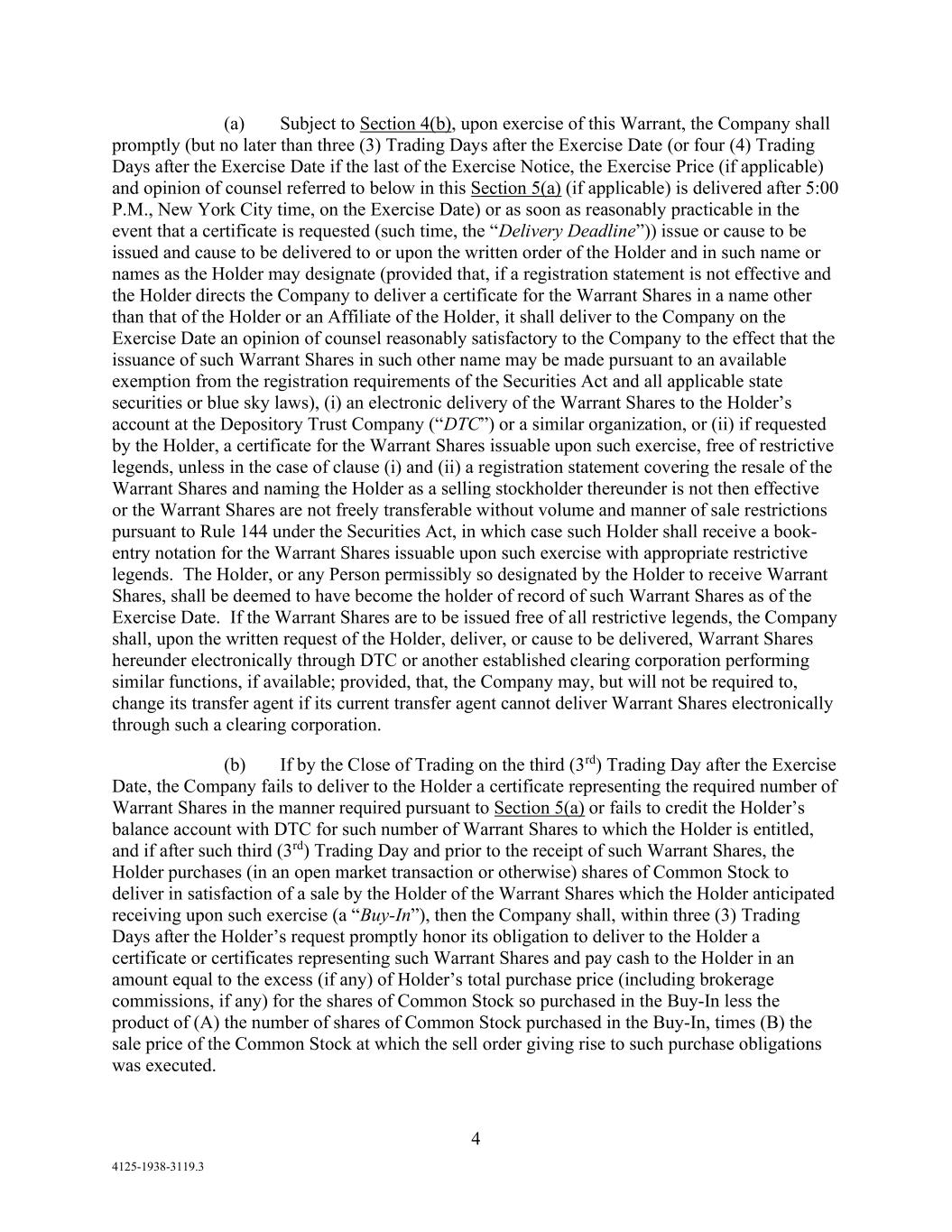 4 4125-1938-3119.3 (a) Subject to Section 4(b), upon exercise of this Warrant, the Company shall promptly (but no later than three (3) Trading Days after the Exercise Date (or four (4) Trading Days after the Exercise Date if the last of the Exercise Notice, the Exercise Price (if applicable) and opinion of counsel referred to below in this Section 5(a) (if applicable) is delivered after 5:00 P.M., New York City time, on the Exercise Date) or as soon as reasonably practicable in the event that a certificate is requested (such time, the “Delivery Deadline”)) issue or cause to be issued and cause to be delivered to or upon the written order of the Holder and in such name or names as the Holder may designate (provided that, if a registration statement is not effective and the Holder directs the Company to deliver a certificate for the Warrant Shares in a name other than that of the Holder or an Affiliate of the Holder, it shall deliver to the Company on the Exercise Date an opinion of counsel reasonably satisfactory to the Company to the effect that the issuance of such Warrant Shares in such other name may be made pursuant to an available exemption from the registration requirements of the Securities Act and all applicable state securities or blue sky laws), (i) an electronic delivery of the Warrant Shares to the Holder’s account at the Depository Trust Company (“DTC”) or a similar organization, or (ii) if requested by the Holder, a certificate for the Warrant Shares issuable upon such exercise, free of restrictive legends, unless in the case of clause (i) and (ii) a registration statement covering the resale of the Warrant Shares and naming the Holder as a selling stockholder thereunder is not then effective or the Warrant Shares are not freely transferable without volume and manner of sale restrictions pursuant to Rule 144 under the Securities Act, in which case such Holder shall receive a book- entry notation for the Warrant Shares issuable upon such exercise with appropriate restrictive legends. The Holder, or any Person permissibly so designated by the Holder to receive Warrant Shares, shall be deemed to have become the holder of record of such Warrant Shares as of the Exercise Date. If the Warrant Shares are to be issued free of all restrictive legends, the Company shall, upon the written request of the Holder, deliver, or cause to be delivered, Warrant Shares hereunder electronically through DTC or another established clearing corporation performing similar functions, if available; provided, that, the Company may, but will not be required to, change its transfer agent if its current transfer agent cannot deliver Warrant Shares electronically through such a clearing corporation. (b) If by the Close of Trading on the third (3rd) Trading Day after the Exercise Date, the Company fails to deliver to the Holder a certificate representing the required number of Warrant Shares in the manner required pursuant to Section 5(a) or fails to credit the Holder’s balance account with DTC for such number of Warrant Shares to which the Holder is entitled, and if after such third (3rd) Trading Day and prior to the receipt of such Warrant Shares, the Holder purchases (in an open market transaction or otherwise) shares of Common Stock to deliver in satisfaction of a sale by the Holder of the Warrant Shares which the Holder anticipated receiving upon such exercise (a “Buy-In”), then the Company shall, within three (3) Trading Days after the Holder’s request promptly honor its obligation to deliver to the Holder a certificate or certificates representing such Warrant Shares and pay cash to the Holder in an amount equal to the excess (if any) of Holder’s total purchase price (including brokerage commissions, if any) for the shares of Common Stock so purchased in the Buy-In less the product of (A) the number of shares of Common Stock purchased in the Buy-In, times (B) the sale price of the Common Stock at which the sell order giving rise to such purchase obligations was executed.