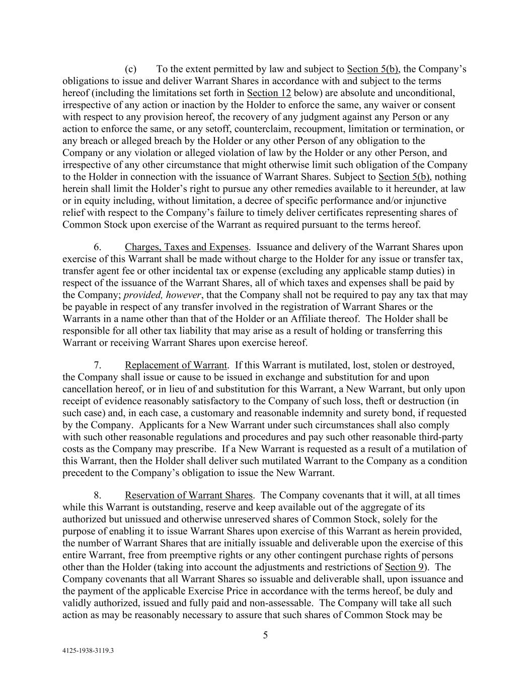 5 4125-1938-3119.3 (c) To the extent permitted by law and subject to Section 5(b), the Company’s obligations to issue and deliver Warrant Shares in accordance with and subject to the terms hereof (including the limitations set forth in Section 12 below) are absolute and unconditional, irrespective of any action or inaction by the Holder to enforce the same, any waiver or consent with respect to any provision hereof, the recovery of any judgment against any Person or any action to enforce the same, or any setoff, counterclaim, recoupment, limitation or termination, or any breach or alleged breach by the Holder or any other Person of any obligation to the Company or any violation or alleged violation of law by the Holder or any other Person, and irrespective of any other circumstance that might otherwise limit such obligation of the Company to the Holder in connection with the issuance of Warrant Shares. Subject to Section 5(b), nothing herein shall limit the Holder’s right to pursue any other remedies available to it hereunder, at law or in equity including, without limitation, a decree of specific performance and/or injunctive relief with respect to the Company’s failure to timely deliver certificates representing shares of Common Stock upon exercise of the Warrant as required pursuant to the terms hereof. 6. Charges, Taxes and Expenses. Issuance and delivery of the Warrant Shares upon exercise of this Warrant shall be made without charge to the Holder for any issue or transfer tax, transfer agent fee or other incidental tax or expense (excluding any applicable stamp duties) in respect of the issuance of the Warrant Shares, all of which taxes and expenses shall be paid by the Company; provided, however, that the Company shall not be required to pay any tax that may be payable in respect of any transfer involved in the registration of Warrant Shares or the Warrants in a name other than that of the Holder or an Affiliate thereof. The Holder shall be responsible for all other tax liability that may arise as a result of holding or transferring this Warrant or receiving Warrant Shares upon exercise hereof. 7. Replacement of Warrant. If this Warrant is mutilated, lost, stolen or destroyed, the Company shall issue or cause to be issued in exchange and substitution for and upon cancellation hereof, or in lieu of and substitution for this Warrant, a New Warrant, but only upon receipt of evidence reasonably satisfactory to the Company of such loss, theft or destruction (in such case) and, in each case, a customary and reasonable indemnity and surety bond, if requested by the Company. Applicants for a New Warrant under such circumstances shall also comply with such other reasonable regulations and procedures and pay such other reasonable third-party costs as the Company may prescribe. If a New Warrant is requested as a result of a mutilation of this Warrant, then the Holder shall deliver such mutilated Warrant to the Company as a condition precedent to the Company’s obligation to issue the New Warrant. 8. Reservation of Warrant Shares. The Company covenants that it will, at all times while this Warrant is outstanding, reserve and keep available out of the aggregate of its authorized but unissued and otherwise unreserved shares of Common Stock, solely for the purpose of enabling it to issue Warrant Shares upon exercise of this Warrant as herein provided, the number of Warrant Shares that are initially issuable and deliverable upon the exercise of this entire Warrant, free from preemptive rights or any other contingent purchase rights of persons other than the Holder (taking into account the adjustments and restrictions of Section 9). The Company covenants that all Warrant Shares so issuable and deliverable shall, upon issuance and the payment of the applicable Exercise Price in accordance with the terms hereof, be duly and validly authorized, issued and fully paid and non-assessable. The Company will take all such action as may be reasonably necessary to assure that such shares of Common Stock may be