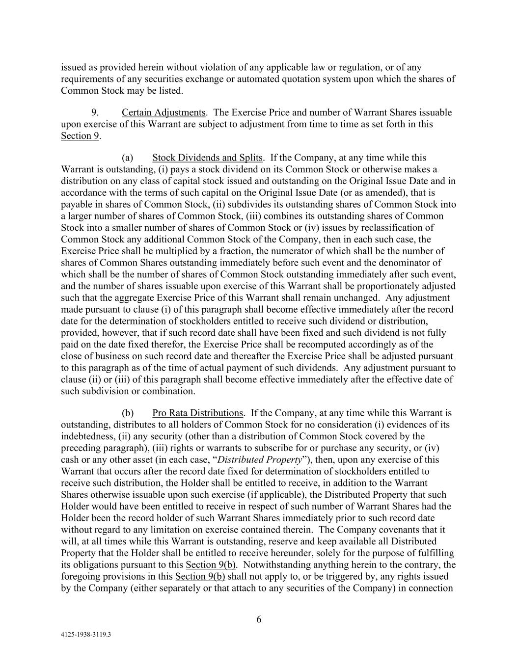 6 4125-1938-3119.3 issued as provided herein without violation of any applicable law or regulation, or of any requirements of any securities exchange or automated quotation system upon which the shares of Common Stock may be listed. 9. Certain Adjustments. The Exercise Price and number of Warrant Shares issuable upon exercise of this Warrant are subject to adjustment from time to time as set forth in this Section 9. (a) Stock Dividends and Splits. If the Company, at any time while this Warrant is outstanding, (i) pays a stock dividend on its Common Stock or otherwise makes a distribution on any class of capital stock issued and outstanding on the Original Issue Date and in accordance with the terms of such capital on the Original Issue Date (or as amended), that is payable in shares of Common Stock, (ii) subdivides its outstanding shares of Common Stock into a larger number of shares of Common Stock, (iii) combines its outstanding shares of Common Stock into a smaller number of shares of Common Stock or (iv) issues by reclassification of Common Stock any additional Common Stock of the Company, then in each such case, the Exercise Price shall be multiplied by a fraction, the numerator of which shall be the number of shares of Common Shares outstanding immediately before such event and the denominator of which shall be the number of shares of Common Stock outstanding immediately after such event, and the number of shares issuable upon exercise of this Warrant shall be proportionately adjusted such that the aggregate Exercise Price of this Warrant shall remain unchanged. Any adjustment made pursuant to clause (i) of this paragraph shall become effective immediately after the record date for the determination of stockholders entitled to receive such dividend or distribution, provided, however, that if such record date shall have been fixed and such dividend is not fully paid on the date fixed therefor, the Exercise Price shall be recomputed accordingly as of the close of business on such record date and thereafter the Exercise Price shall be adjusted pursuant to this paragraph as of the time of actual payment of such dividends. Any adjustment pursuant to clause (ii) or (iii) of this paragraph shall become effective immediately after the effective date of such subdivision or combination. (b) Pro Rata Distributions. If the Company, at any time while this Warrant is outstanding, distributes to all holders of Common Stock for no consideration (i) evidences of its indebtedness, (ii) any security (other than a distribution of Common Stock covered by the preceding paragraph), (iii) rights or warrants to subscribe for or purchase any security, or (iv) cash or any other asset (in each case, “Distributed Property”), then, upon any exercise of this Warrant that occurs after the record date fixed for determination of stockholders entitled to receive such distribution, the Holder shall be entitled to receive, in addition to the Warrant Shares otherwise issuable upon such exercise (if applicable), the Distributed Property that such Holder would have been entitled to receive in respect of such number of Warrant Shares had the Holder been the record holder of such Warrant Shares immediately prior to such record date without regard to any limitation on exercise contained therein. The Company covenants that it will, at all times while this Warrant is outstanding, reserve and keep available all Distributed Property that the Holder shall be entitled to receive hereunder, solely for the purpose of fulfilling its obligations pursuant to this Section 9(b). Notwithstanding anything herein to the contrary, the foregoing provisions in this Section 9(b) shall not apply to, or be triggered by, any rights issued by the Company (either separately or that attach to any securities of the Company) in connection
