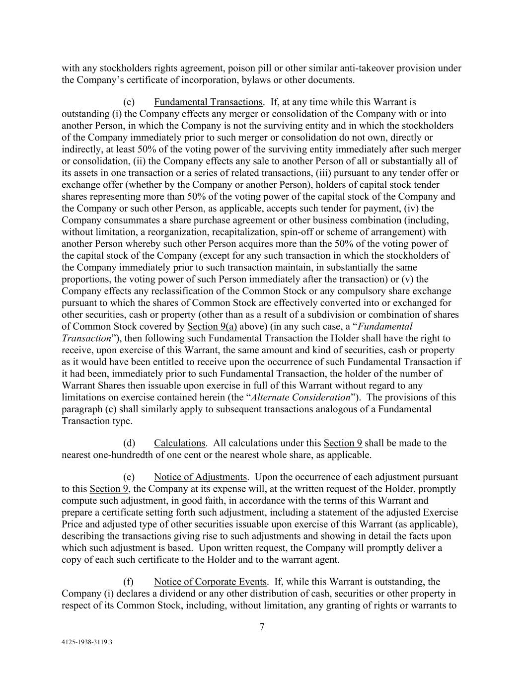 7 4125-1938-3119.3 with any stockholders rights agreement, poison pill or other similar anti-takeover provision under the Company’s certificate of incorporation, bylaws or other documents. (c) Fundamental Transactions. If, at any time while this Warrant is outstanding (i) the Company effects any merger or consolidation of the Company with or into another Person, in which the Company is not the surviving entity and in which the stockholders of the Company immediately prior to such merger or consolidation do not own, directly or indirectly, at least 50% of the voting power of the surviving entity immediately after such merger or consolidation, (ii) the Company effects any sale to another Person of all or substantially all of its assets in one transaction or a series of related transactions, (iii) pursuant to any tender offer or exchange offer (whether by the Company or another Person), holders of capital stock tender shares representing more than 50% of the voting power of the capital stock of the Company and the Company or such other Person, as applicable, accepts such tender for payment, (iv) the Company consummates a share purchase agreement or other business combination (including, without limitation, a reorganization, recapitalization, spin-off or scheme of arrangement) with another Person whereby such other Person acquires more than the 50% of the voting power of the capital stock of the Company (except for any such transaction in which the stockholders of the Company immediately prior to such transaction maintain, in substantially the same proportions, the voting power of such Person immediately after the transaction) or (v) the Company effects any reclassification of the Common Stock or any compulsory share exchange pursuant to which the shares of Common Stock are effectively converted into or exchanged for other securities, cash or property (other than as a result of a subdivision or combination of shares of Common Stock covered by Section 9(a) above) (in any such case, a “Fundamental Transaction”), then following such Fundamental Transaction the Holder shall have the right to receive, upon exercise of this Warrant, the same amount and kind of securities, cash or property as it would have been entitled to receive upon the occurrence of such Fundamental Transaction if it had been, immediately prior to such Fundamental Transaction, the holder of the number of Warrant Shares then issuable upon exercise in full of this Warrant without regard to any limitations on exercise contained herein (the “Alternate Consideration”). The provisions of this paragraph (c) shall similarly apply to subsequent transactions analogous of a Fundamental Transaction type. (d) Calculations. All calculations under this Section 9 shall be made to the nearest one-hundredth of one cent or the nearest whole share, as applicable. (e) Notice of Adjustments. Upon the occurrence of each adjustment pursuant to this Section 9, the Company at its expense will, at the written request of the Holder, promptly compute such adjustment, in good faith, in accordance with the terms of this Warrant and prepare a certificate setting forth such adjustment, including a statement of the adjusted Exercise Price and adjusted type of other securities issuable upon exercise of this Warrant (as applicable), describing the transactions giving rise to such adjustments and showing in detail the facts upon which such adjustment is based. Upon written request, the Company will promptly deliver a copy of each such certificate to the Holder and to the warrant agent. (f) Notice of Corporate Events. If, while this Warrant is outstanding, the Company (i) declares a dividend or any other distribution of cash, securities or other property in respect of its Common Stock, including, without limitation, any granting of rights or warrants to