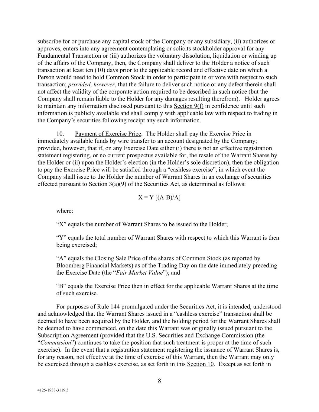 8 4125-1938-3119.3 subscribe for or purchase any capital stock of the Company or any subsidiary, (ii) authorizes or approves, enters into any agreement contemplating or solicits stockholder approval for any Fundamental Transaction or (iii) authorizes the voluntary dissolution, liquidation or winding up of the affairs of the Company, then, the Company shall deliver to the Holder a notice of such transaction at least ten (10) days prior to the applicable record and effective date on which a Person would need to hold Common Stock in order to participate in or vote with respect to such transaction; provided, however, that the failure to deliver such notice or any defect therein shall not affect the validity of the corporate action required to be described in such notice (but the Company shall remain liable to the Holder for any damages resulting therefrom). Holder agrees to maintain any information disclosed pursuant to this Section 9(f) in confidence until such information is publicly available and shall comply with applicable law with respect to trading in the Company’s securities following receipt any such information. 10. Payment of Exercise Price. The Holder shall pay the Exercise Price in immediately available funds by wire transfer to an account designated by the Company; provided, however, that if, on any Exercise Date either (i) there is not an effective registration statement registering, or no current prospectus available for, the resale of the Warrant Shares by the Holder or (ii) upon the Holder’s election (in the Holder’s sole discretion), then the obligation to pay the Exercise Price will be satisfied through a “cashless exercise”, in which event the Company shall issue to the Holder the number of Warrant Shares in an exchange of securities effected pursuant to Section 3(a)(9) of the Securities Act, as determined as follows: X = Y [(A-B)/A] where: “X” equals the number of Warrant Shares to be issued to the Holder; “Y” equals the total number of Warrant Shares with respect to which this Warrant is then being exercised; “A” equals the Closing Sale Price of the shares of Common Stock (as reported by Bloomberg Financial Markets) as of the Trading Day on the date immediately preceding the Exercise Date (the “Fair Market Value”); and “B” equals the Exercise Price then in effect for the applicable Warrant Shares at the time of such exercise. For purposes of Rule 144 promulgated under the Securities Act, it is intended, understood and acknowledged that the Warrant Shares issued in a “cashless exercise” transaction shall be deemed to have been acquired by the Holder, and the holding period for the Warrant Shares shall be deemed to have commenced, on the date this Warrant was originally issued pursuant to the Subscription Agreement (provided that the U.S. Securities and Exchange Commission (the “Commission”) continues to take the position that such treatment is proper at the time of such exercise). In the event that a registration statement registering the issuance of Warrant Shares is, for any reason, not effective at the time of exercise of this Warrant, then the Warrant may only be exercised through a cashless exercise, as set forth in this Section 10. Except as set forth in