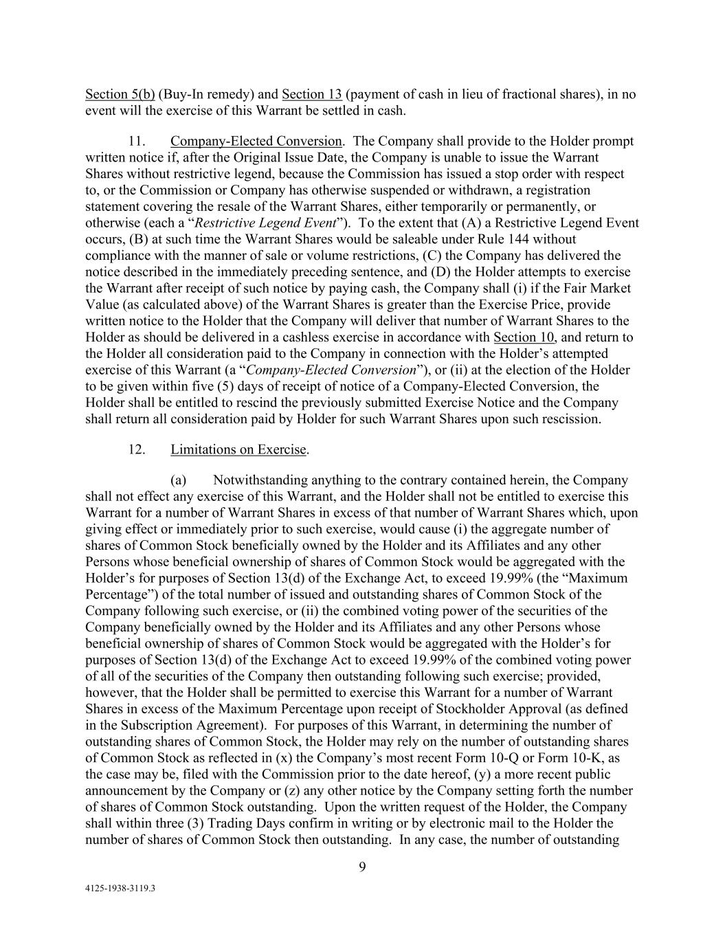9 4125-1938-3119.3 Section 5(b) (Buy-In remedy) and Section 13 (payment of cash in lieu of fractional shares), in no event will the exercise of this Warrant be settled in cash. 11. Company-Elected Conversion. The Company shall provide to the Holder prompt written notice if, after the Original Issue Date, the Company is unable to issue the Warrant Shares without restrictive legend, because the Commission has issued a stop order with respect to, or the Commission or Company has otherwise suspended or withdrawn, a registration statement covering the resale of the Warrant Shares, either temporarily or permanently, or otherwise (each a “Restrictive Legend Event”). To the extent that (A) a Restrictive Legend Event occurs, (B) at such time the Warrant Shares would be saleable under Rule 144 without compliance with the manner of sale or volume restrictions, (C) the Company has delivered the notice described in the immediately preceding sentence, and (D) the Holder attempts to exercise the Warrant after receipt of such notice by paying cash, the Company shall (i) if the Fair Market Value (as calculated above) of the Warrant Shares is greater than the Exercise Price, provide written notice to the Holder that the Company will deliver that number of Warrant Shares to the Holder as should be delivered in a cashless exercise in accordance with Section 10, and return to the Holder all consideration paid to the Company in connection with the Holder’s attempted exercise of this Warrant (a “Company-Elected Conversion”), or (ii) at the election of the Holder to be given within five (5) days of receipt of notice of a Company-Elected Conversion, the Holder shall be entitled to rescind the previously submitted Exercise Notice and the Company shall return all consideration paid by Holder for such Warrant Shares upon such rescission. 12. Limitations on Exercise. (a) Notwithstanding anything to the contrary contained herein, the Company shall not effect any exercise of this Warrant, and the Holder shall not be entitled to exercise this Warrant for a number of Warrant Shares in excess of that number of Warrant Shares which, upon giving effect or immediately prior to such exercise, would cause (i) the aggregate number of shares of Common Stock beneficially owned by the Holder and its Affiliates and any other Persons whose beneficial ownership of shares of Common Stock would be aggregated with the Holder’s for purposes of Section 13(d) of the Exchange Act, to exceed 19.99% (the “Maximum Percentage”) of the total number of issued and outstanding shares of Common Stock of the Company following such exercise, or (ii) the combined voting power of the securities of the Company beneficially owned by the Holder and its Affiliates and any other Persons whose beneficial ownership of shares of Common Stock would be aggregated with the Holder’s for purposes of Section 13(d) of the Exchange Act to exceed 19.99% of the combined voting power of all of the securities of the Company then outstanding following such exercise; provided, however, that the Holder shall be permitted to exercise this Warrant for a number of Warrant Shares in excess of the Maximum Percentage upon receipt of Stockholder Approval (as defined in the Subscription Agreement). For purposes of this Warrant, in determining the number of outstanding shares of Common Stock, the Holder may rely on the number of outstanding shares of Common Stock as reflected in (x) the Company’s most recent Form 10-Q or Form 10-K, as the case may be, filed with the Commission prior to the date hereof, (y) a more recent public announcement by the Company or (z) any other notice by the Company setting forth the number of shares of Common Stock outstanding. Upon the written request of the Holder, the Company shall within three (3) Trading Days confirm in writing or by electronic mail to the Holder the number of shares of Common Stock then outstanding. In any case, the number of outstanding